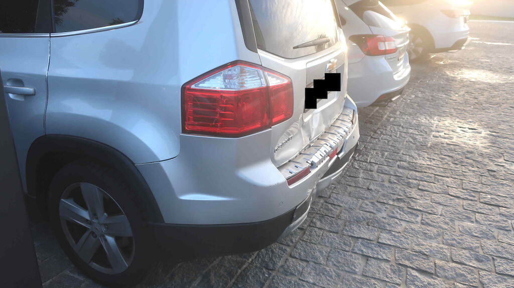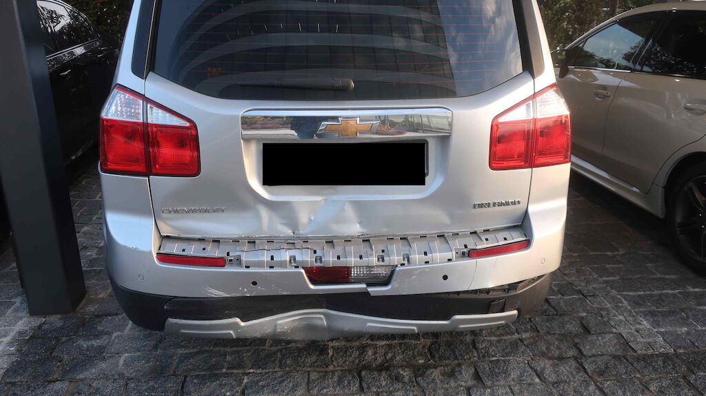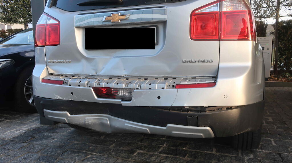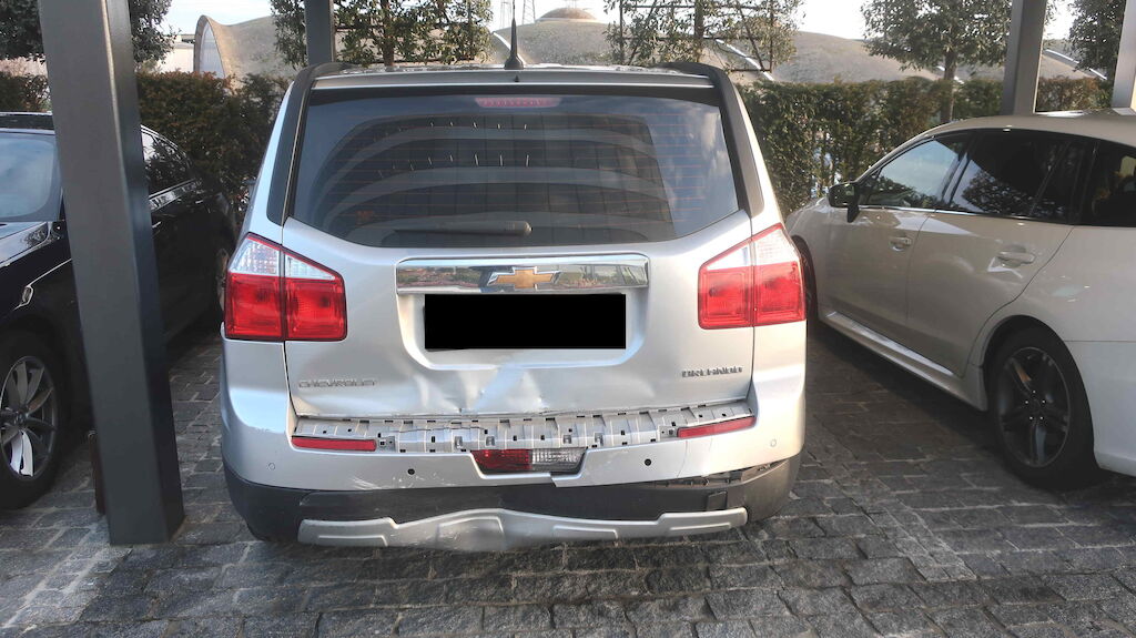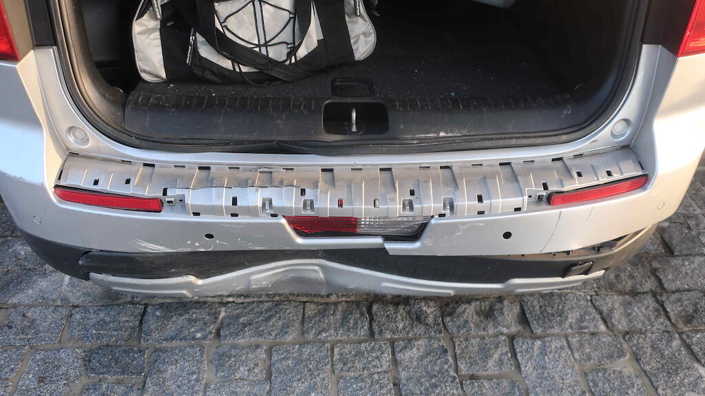 Choc arrière. Le hayon, le pare-chocs, le renfort, la jupe et le plancher de coffre sont endommagés.