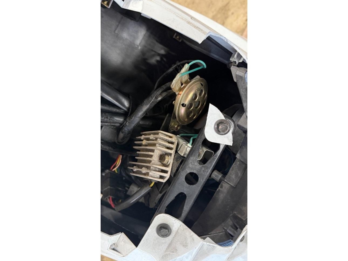 Armaturen, Auspuffkollektor, Diverse Anbauteile, Getriebe, Heckverkleidung, Kabelstrang, Kupplungsgehäuse, Lenkanschlag, Lenkschloss, Motor, Motorgehäuse, Rad hinten, Rücklicht, Schutzblech hinten, Schwinge, Sitz, Tank, Zündschloss
