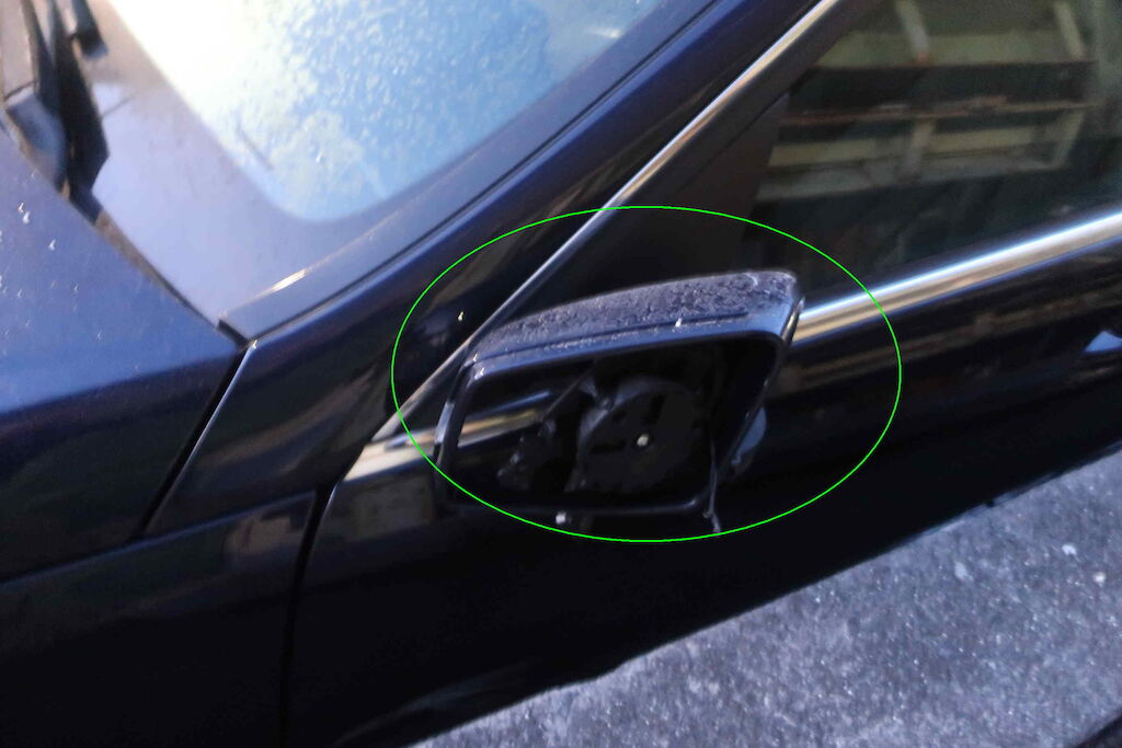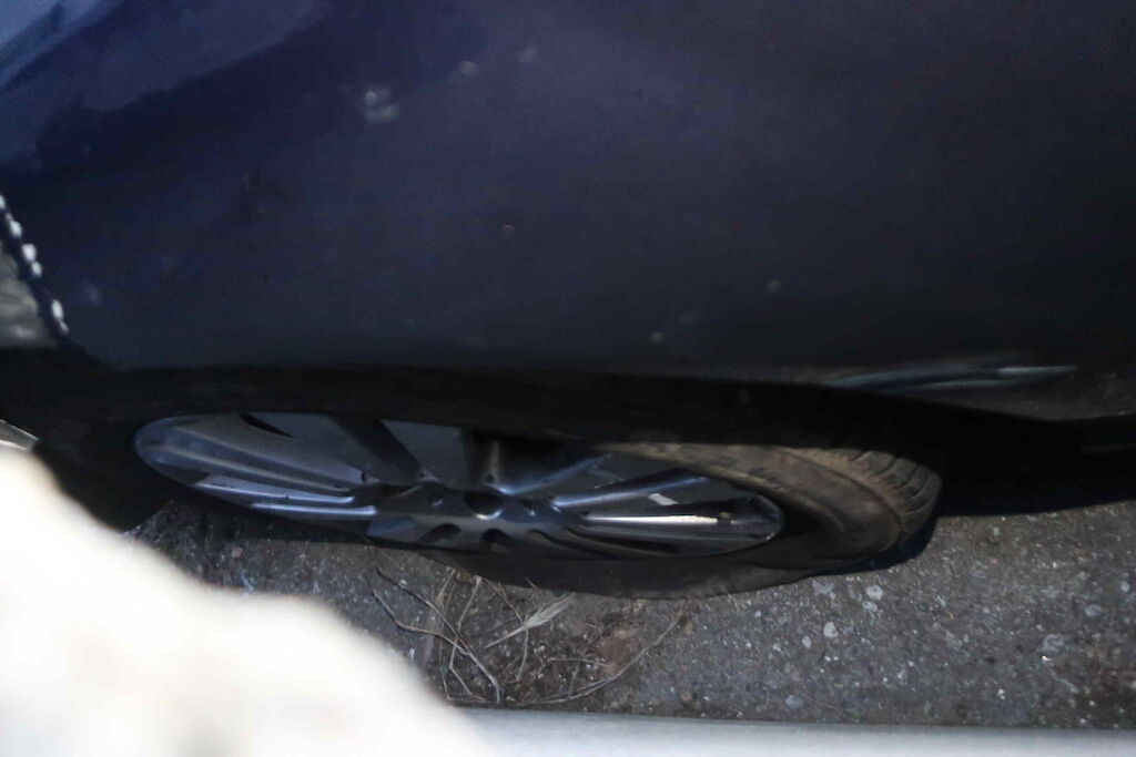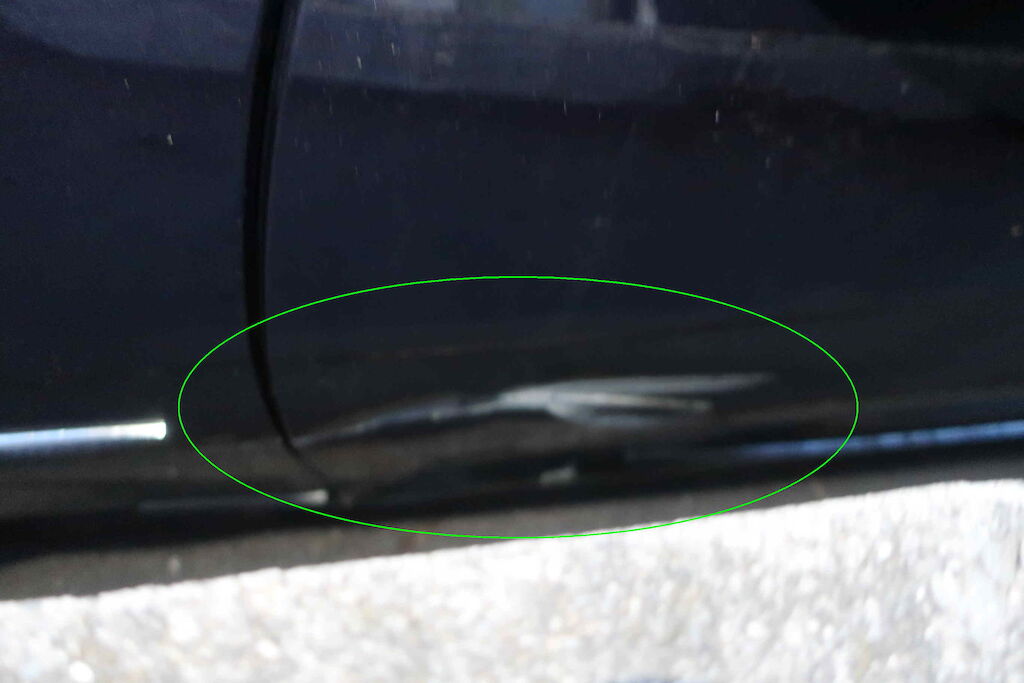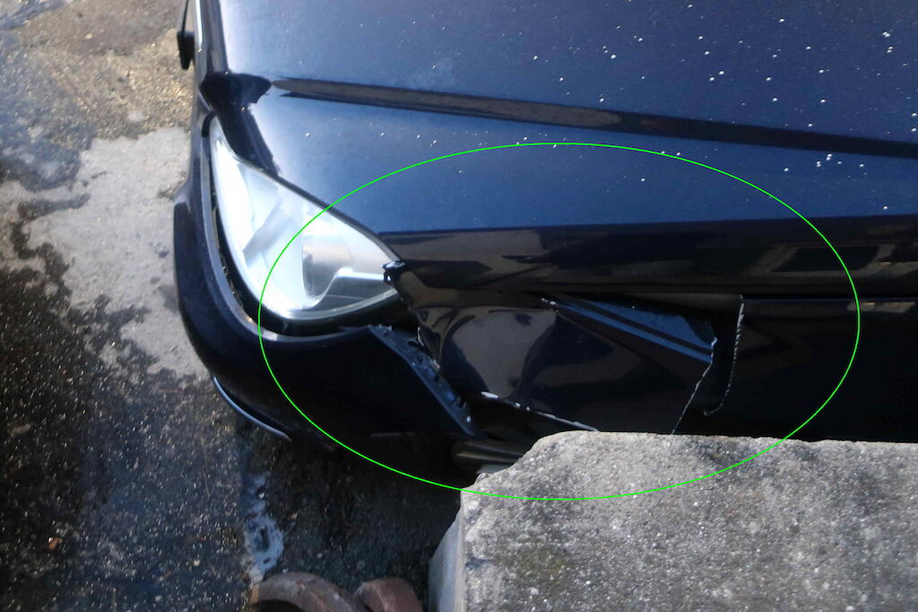 Stossstange und Tagfahrleuchten v l beschädigt, Kotflügel v l aufgerissen, Türe v l beschädigt, Aussenspiegel abgerissen, Felge v l beschädigt, zerkratzt, Pneu v l aufgeschlitzt, Risiko Lenkgeometrie