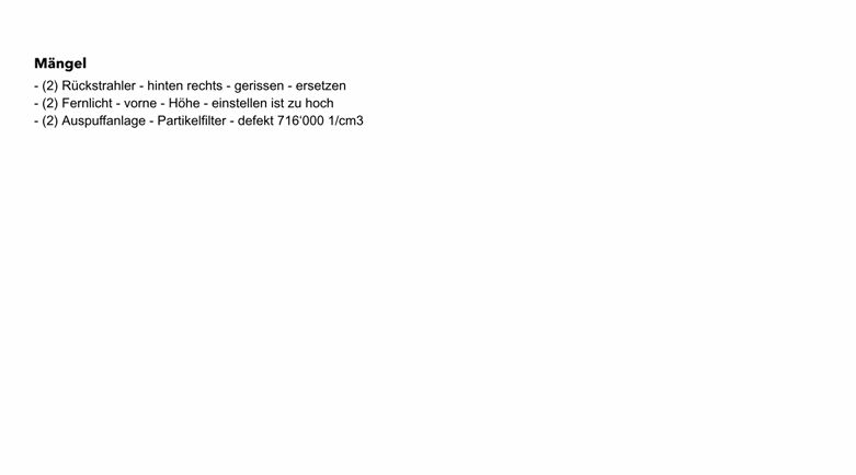 Fahrzeug hat technischen Mängel, Partikfelfilter, Rückstrahler defekt., Fernlicht zu hoch eingestellt.
