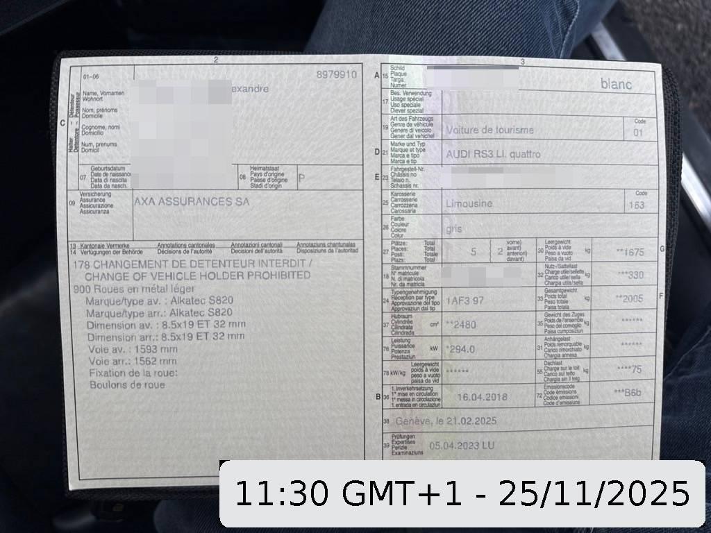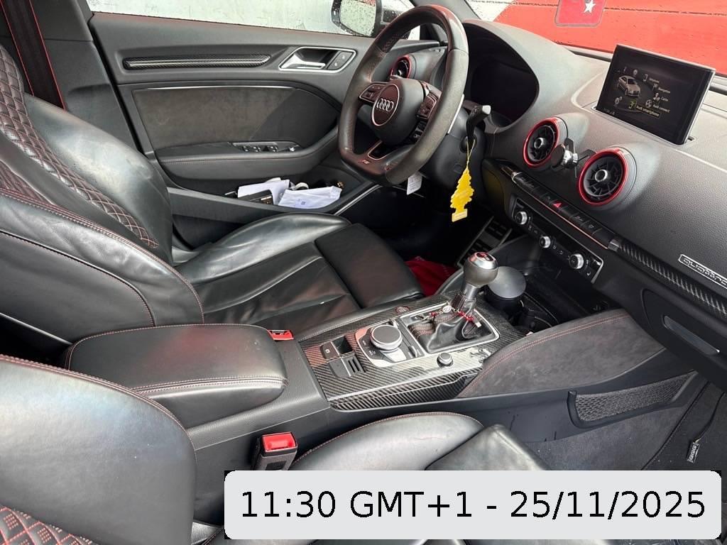 Alu-Räder 5-Arm-Rotor Design 8,5Jx19 vorne, 8Jx19 hinten, Titanoptik matt, Panorama-Glasdach, Schwarz glänzende Aussenoptik, Aluminium-Applikationen Race Designlicht, Volllederausstattung Feinnappa mit Rautensteppung, RS-Sportauspuffanlage, Lackierung: Perleffekt-Lackierung, Abgedunkelte Seiten- und Heckscheibe, Komfortschlüssel inkl. Diebstahlwarnanlage, Rücksitzbank ungeteilt,Lehne geteilt umlegbar (dreiteilig) mit Mittelarmlehne, Audi virtual cockpit 12,3”, Assist: Rückfahrkamera, Garantie: Audi Garantie: 5 Jahre oder 100’000 km (ab 1. Inv.), Spurwechselassistent Side Assist, Navigationssystem plus mit MMI, S Sportsitze, Bremssättel rot lackiert, Matrix LED Scheinwerfer, RS-Designpaket, Geschwindigkeitsbegrenzer 280 km/h, Audi connect (3 Jahre), Magnetic ride, Media: Bang & Olufsen Soundsystem