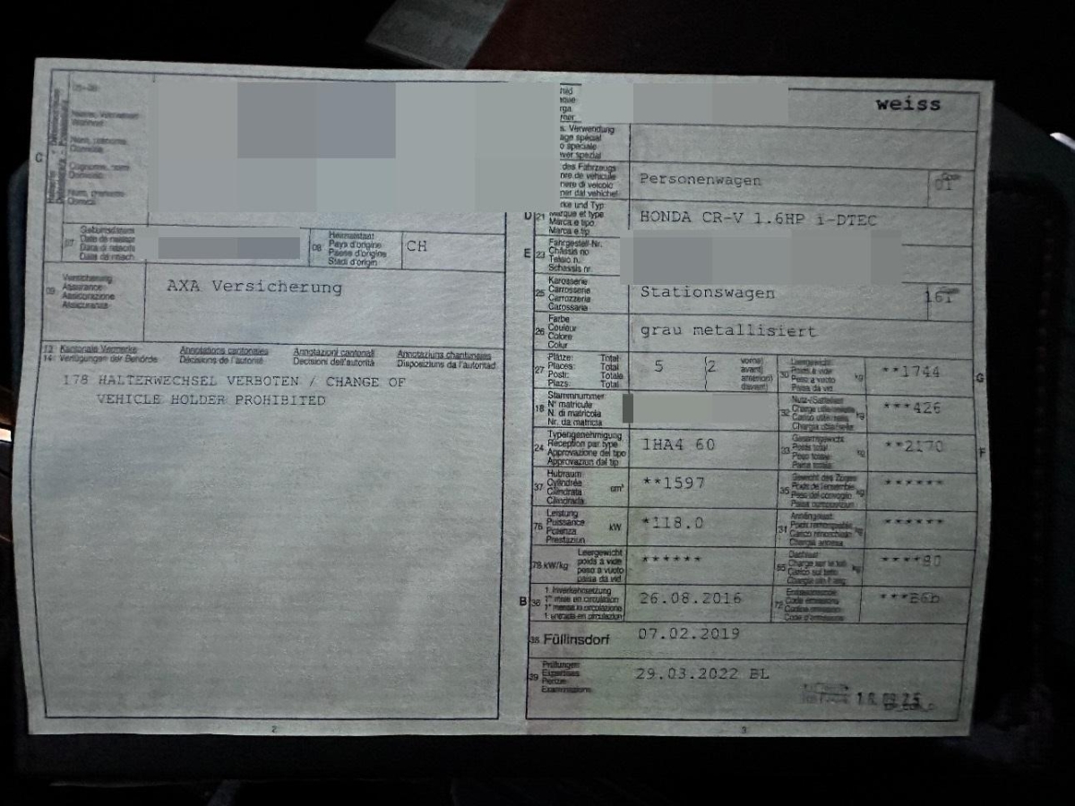 Notbremsassistent, Elektronisches Stabilitäts-Programm (VSA), Start/Stop-Funktion, Armlehnen vorne, Zentralverriegelung mit Fernbedienung, 6-Gang-Getriebe, Leuchtweitenregulierung von innen, Allradantrieb permanent, 6 Lautsprecher, Innenspiegel automatisch abblendbar, Stoff-Ausstattung, Innenraumbeleuchtung, USB-Anschluss, Licht: Halogenscheinwerfer, Partikelfilter und Oxydationskatalysator, Gurtstraffer vorne, Steckdose 12V, TPMS Reifendrucküberwachungssystem, 2-Zonen-Klimaautomatik, Hill Descent Control (HDC), Einstellbare Lendenwirbelstütze für den Fahrersitz, ISOFIX Kindersitzvorrichtung, Automatisches Einschalten der Abblendlichter, Media: Bluetooth Freisprecheinrichtung, Multifunktionsanzeige, Anhänger Stabilisierungkontrolle TSA, Hill-Start Assist (HSA), Seitenairbags, Aussenspiegel elektrisch einklappbar, Regensensor für Scheibenwischer vorne, Pollenfilter (Staubfilter), Lenkrad längs- und höhenverstellbar, 3-Punkt-Sicherheitsgurte auf allen Plätzen, Window-Kopfairbags, Mittelarmlehne hinten, Fahrwerk: Servolenkung, Sitze: Vordersitze heizbar, Elektrische Fensterheber vorne + hinten, Multifunktionslenkrad mit Radiobedienung, Licht: LED-Tagfahrlicht, Airbag: Beifahrer deaktivierbar, Honda Connect, Kartentasche an der Rückenlehne, Beleuchtetes Handschuhfach, Licht: Drittes Bremslicht, Beide Make up-Spiegel beleuchtet, Brillenablage, Rücksitzlehne geteilt abklappbar, Kofferraumbeleuchtung, ABS, EBD elektronische Bremskraftverteilung, Airbag: Airbag Fahrer und Beifahrer, Active City Brake, Türgriffe aussen in Wagenfarbe, Laderaumabdeckung, Applikationen Chrom, Nebelscheinwerfer, Fahrersitz höhenverstellbar, Heckscheibenheizung, Lenkrad und Schalthebelgriff in Leder, Licht: Coming-home-Funktion, Lackierung: Uni-Lackierung, Assist: Rückfahrkamera, Getönte Scheiben, Licht: Nebelschlussleuchte, Wegfahrsperre elektronisch, Gangempfehlung, Elektrische Lenkung (EPS), Tempomat, 4 Leichtmetallfelgen 17J mit Pneu, Ambientebeleuchtung, Aussenspiegel rechts und links beheizbar und elektrisch verstellbar, Diebstahlwarnanlage, Assist: Einparkhilfe vorne und hinten, Leseleuchten vorne, Radiofernbedienung, Aktive Kopfstützen