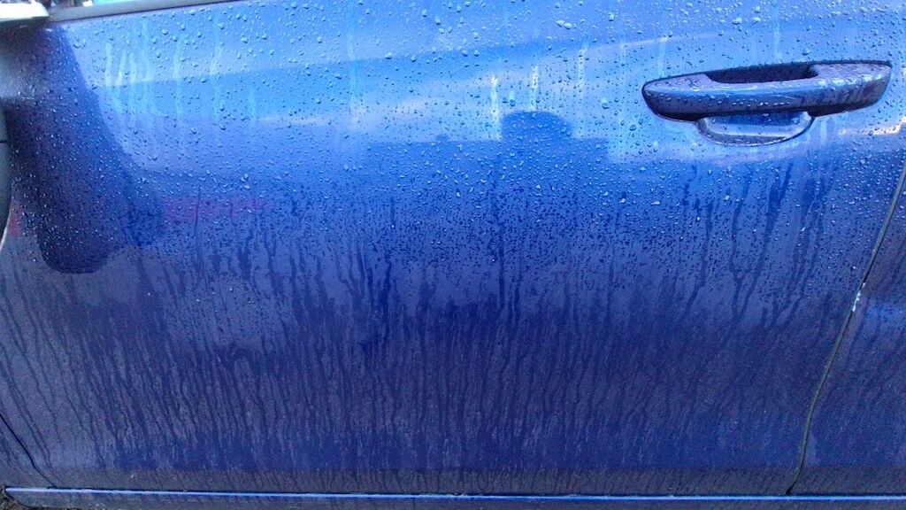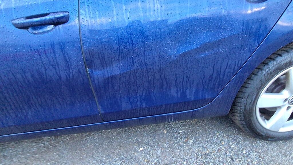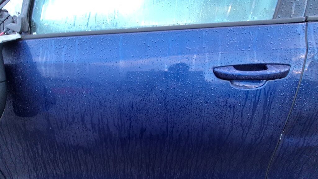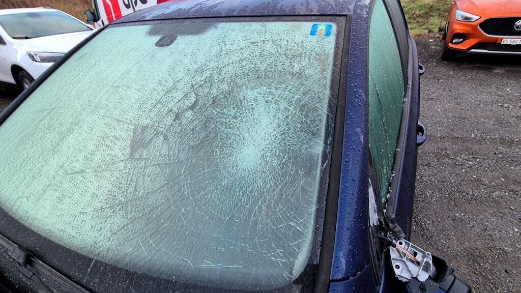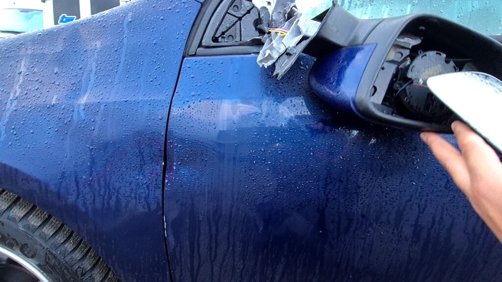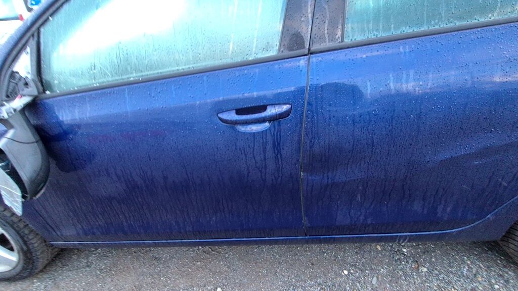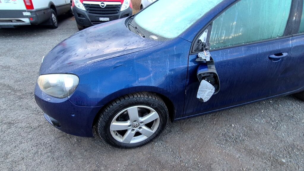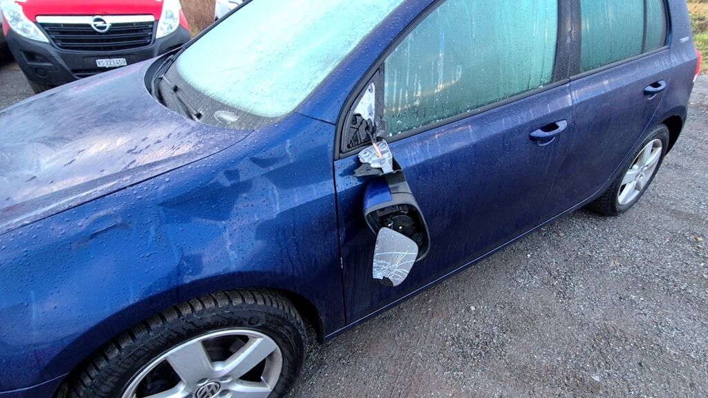 Dommage flanc gauche: aile avant portes avant et arrière fortement pliées déformées embouties enfoncés impactées endommagées, pare brise rétroviseur cassés fissurés éclatés arrachés endommagés.