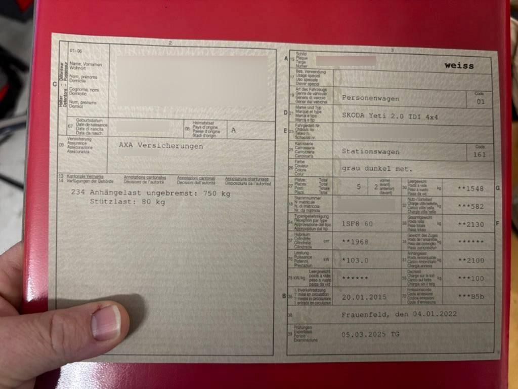 Steckdose, Tagfahrlicht, Laderaumabdeckung, Radio SWING mit CD-Player, MP3, Make up-Spiegel links, Leseleuchten hinten, Metallpedale, Elektrische Fensterheber vorne + hinten, Sequentielles 6-Gang-Getriebe mit Automatikfunktion, Airbag: Airbag Beifahrer deaktivierbar, Polster: Stoff-Ausstattung, Getönte Scheiben, Beifahrersitz höhenverstellbar, Scheibenwischer vorne mit Intervall, Lenkrad längs- und höhenverstellbar, Steckdose im Kofferraum, Pollenfilter (Staubfilter), Gurtstraffer vorne, Räder: Reifendruck-Kontrollanzeige, Antriebsschlupfregelung (ASR), Klima: Klimaanlage, Drittes Bremslicht, Mittelkonsole, Allradantrieb permanent, Entfall Motorenbezeichnung hinten, Leichtmetallräder HELIX 7,0x16J, Antiblockiersystem (ABS), Leseleuchten vorne, Airbag: Window-Kopfairbags, Servolenkung, Lichtwarnsummer, Räder: Pannenset, Nichtraucherausführung, Gurtkontrolle, Handschuhfach gekühlt, Teppichfussmatten vorne und hinten, Partikelfilter und Oxydationskatalysator, 3-Punkt-Sicherheitsgurte auf allen Plätzen, Airbag: Seitenairbags, Tageskilometerzähler, Sicherungsnetz für Ladegut, Sitze: Fahrersitz höhenverstellbar, Bremsassistent (BAS), Audio-Anschluss in der Mittelkonsole, Sitze: Mittelarmlehne vorne inkl. grosser Jumbo-Box (kühlbares Ablagefach), Nebelschlussleuchte, Wegfahrsperre elektronisch, Multifunktionsanzeige, Rücksitze aufklapp- oder demontierbar, Sitze: 3 Kopfstützen hinten, Stossstangen in Wagenfarbe, Türgriffe aussen in Wagenfarbe, Tisch im Fond, Aussentemperaturanzeige, Gurtwarneinrichtung für Fahrer- und Beifahrersitz, Zentralverriegelung mit Fernbedienung, Airbag: Airbag Fahrer und Beifahrer, Aussenspiegel rechts und links beheizbar und elektrisch verstellbar, 3 Speichen-Lederlenkrad, Leuchtweitenregulierung von innen, Heckscheibenheizung, Make up-Spiegel rechts, Kofferraumbeleuchtung, Berganfahrhilfe (Hill Holder), Media: 8 Lautsprecher, Heckscheiben-Wisch-/Waschanlage mit, Licht: Nebelscheinwerfer, Digital Uhr, Bordcomputer, Wassertemperaturanzeige, Dachreling schwarz, Elektronisches Stabilitäts-Programm (ESP), Scheinwerfer-Waschanlage, Bottleholder, Drehzahlmesser, Tagesfahrlichtschaltung mit Assistenz- fahrlicht und Coming-Home-Funktion, ISOFIX Kindersitzvorrichtung, Cupholder vorne, Befestigungsösen im Laderaum
