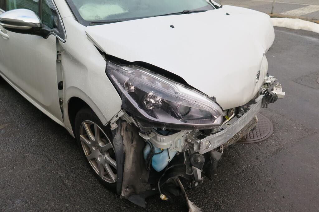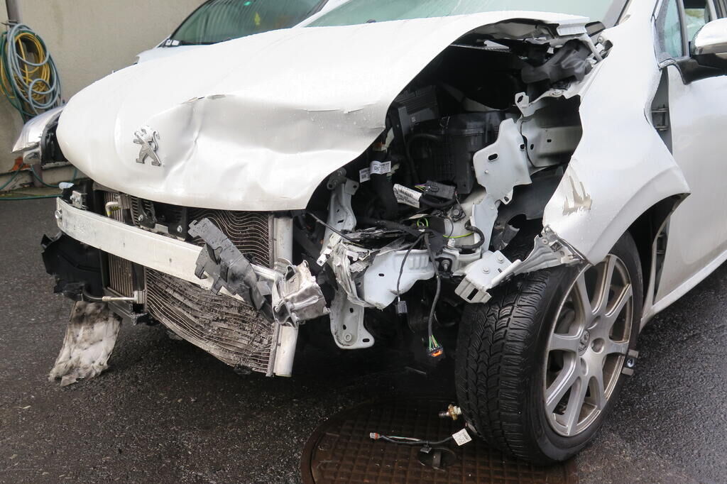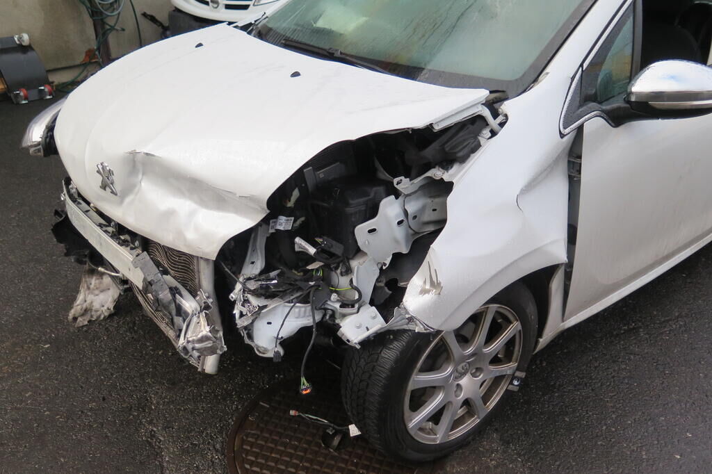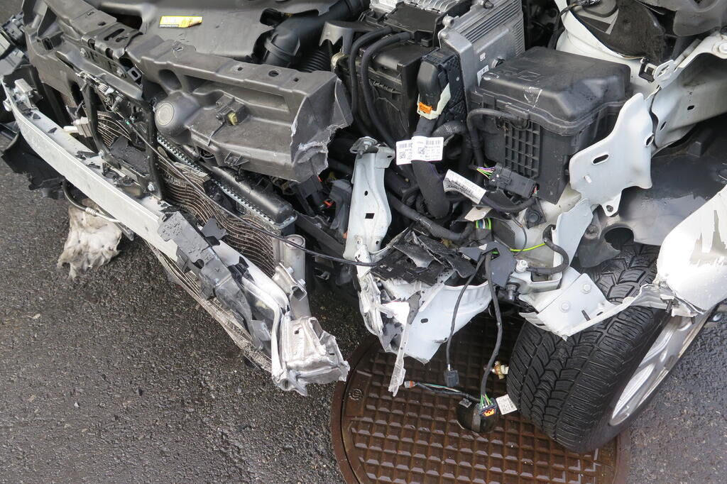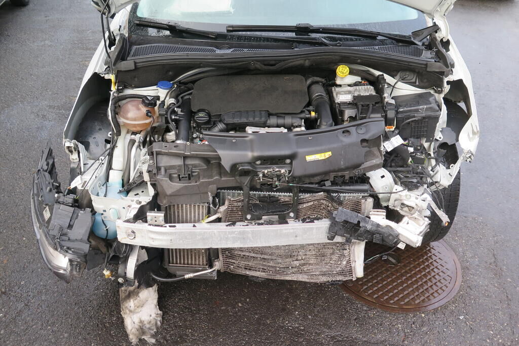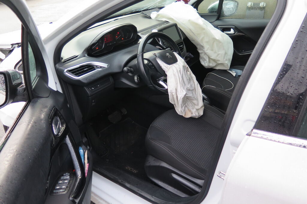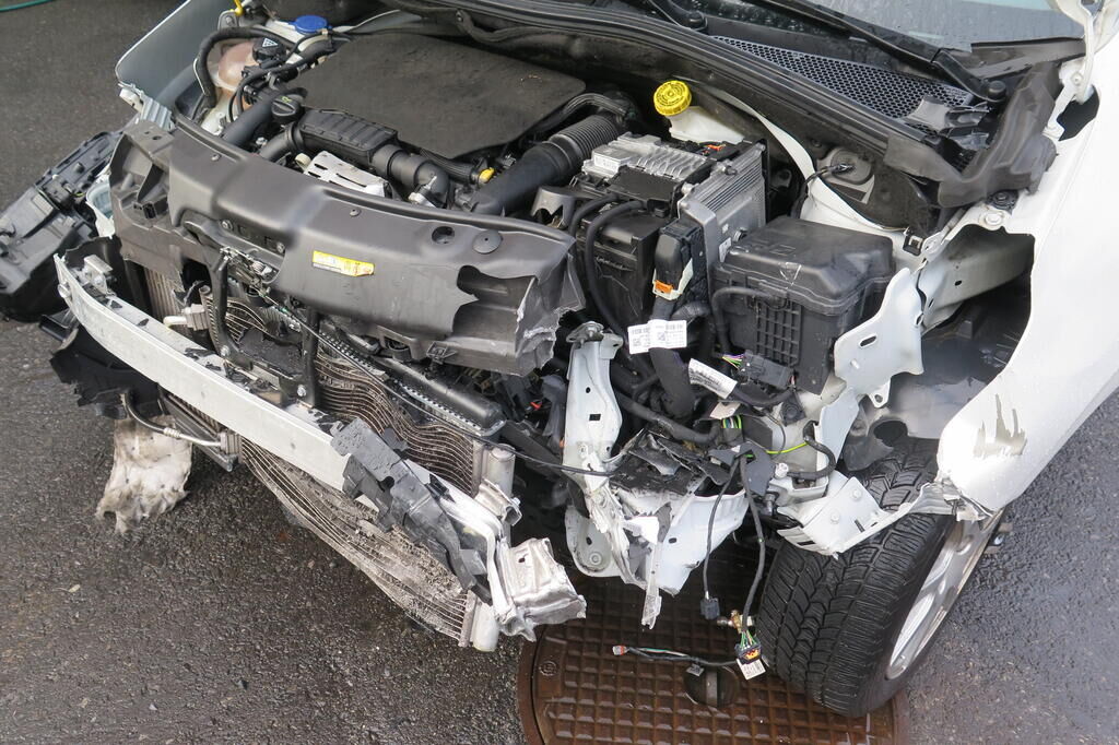 Partie avant fortement enfoncée, éclairage cassé, radiateurs enfoncés, armatures intérieures enfoncées, pare-brise cassé, airbags déployés, divers garnissages et accessoires cassés.