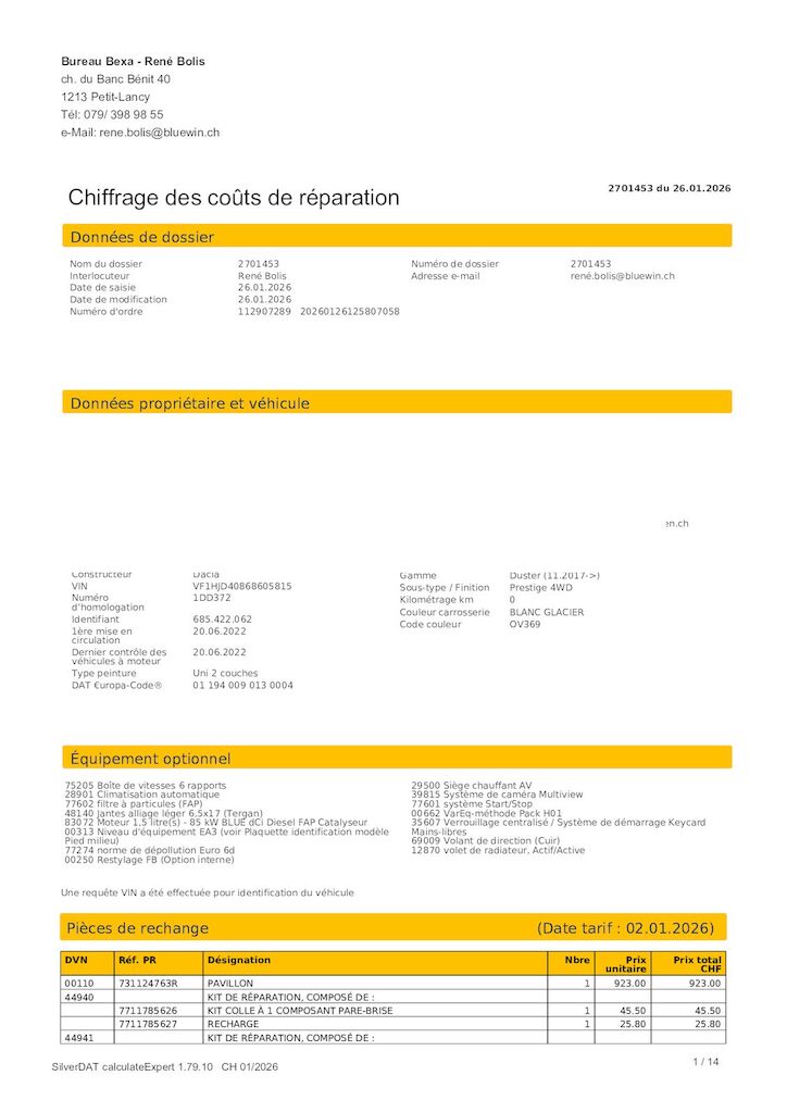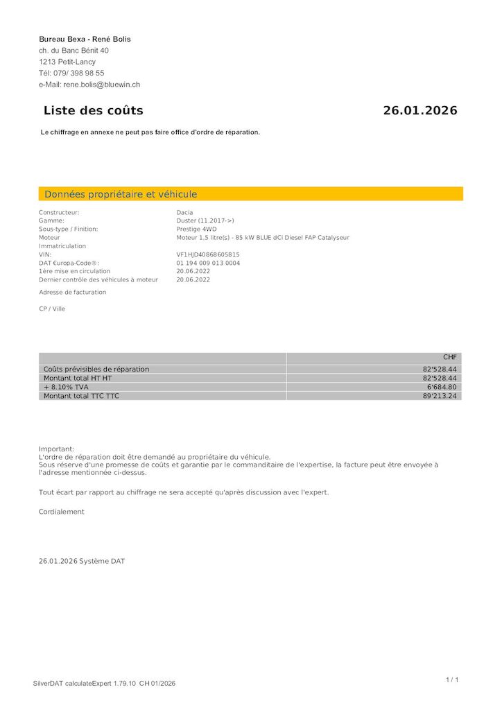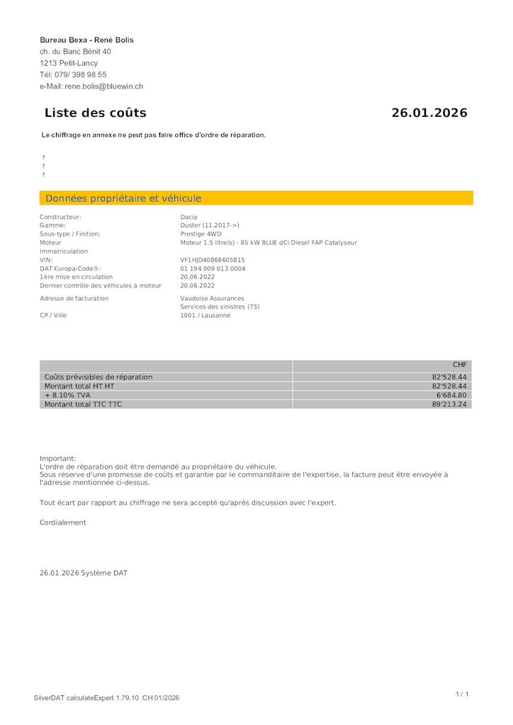 | Costi riparazione | 89’213.25 CHF | Stima |