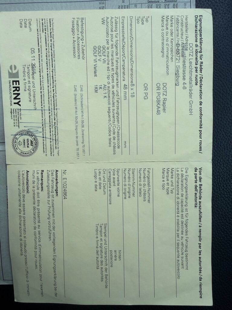 | Pneumatici | 225/40R18 VL: 6.0 mm VR: 6.0 mm HL: 7.0 mm HR: 7.0 mm |