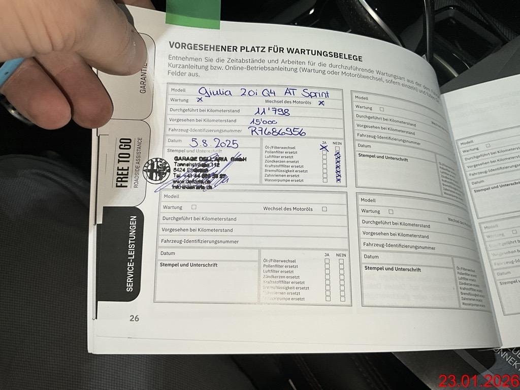 2 Becherbehälter in der Mittelkonsole, Airbag: Airbag Beifahrer deaktivierbar, Airbag: Airbag Fahrer und Beifahrer, Airbag: Seitenairbag für Fahrer und Beifahrer, Airbag: Window-Kopfairbags, Alfa Romeo Fussmatten vorne/hinten, Aluminium-Sportpedale, Antiblockiersystem (ABS), Armaturenbrett aus Leder, Assist: Adaptiver Tempomat, Assist: Hill Descent Control, Assist: Parksensoren vorne und hinten, Assist: Rückfahrkamera mit dynamischen Führungslinien, Assist: TCS, Auspuffendrohre in glänzendem Schwarz, Aussenspiegel automatisch abblendend, Aussenspiegel elektrisch anklappbar, verstellbar und beheizbar, Aussenspiegel mit integrierten Blink, Aussenspiegel mit italienischer Flagge, Beleuchtete Türgriffe, Body Kit in Wagenfarbe, Bremssättel rot lackiert, Dachhimmel und Säulen in Schwarz, Dekor: Dekorleiste Aluminium, Electronic Stability Control (ESC), Elektrische Fensterheber vorne, Elektrische Servolenkung mit Dynamic Steering Torque, Elektromechanische Parkbremse, Fahfwerk:Alfa Active Torque Vectoring (Sperrdifferenzial), Fahrwerk: Alfa Romeo D.N.A – Fahrdynamikregelung, Fahrwerk: Alfa Romeo Dual Stage Valve Suspension System (DSV), Fahrwerk: Allradantrieb Alfa Q4 Verteilergetriebe, Fahrwerk: Antriebswelle aus Kohlefaser, Fahrwerk: Bremsanlage -vorne Brembo 4 Kolben Bremssättel, Fahrwerk: Radaufhängung Alfa Link aus Aluminium, Fahrwerk: Scheibenbremsen vorne und hinten, Fensterumrahmung mit Zierleiste in glänzendem Schwarz, Garantie: 3 Jahre Lackgarantie 3 Jahre/100000km, Garantie: 3 Jahre oder 100’000 km, Garantie: 5 Jahre Swiss Free Service oder 100’000 km, Garantie: 8 Jahre Antikorrosions-Garantie, Getriebe: 8-Stufen-Automat sequentiell, Getönte Sichtschutzfenster hinten Privacy Glass, Innenspiegel automatisch abblendbar, Klima: 2 Belüftungsdüsen im Fond, Klima: 2-Zonen-Klimaautomatik, Kombiinstrument Cannochiale – 12,3-Zoll-Digitalanzeige, Lackierung: Uni-Lackierung Rosso Alfa, Lenkrad: Leder Schalthebel, Lenkrad: Lenksäule mechanisch in Höhe und Länge verstellbar, Lenkrad: Multifunktionslenkrad, Lenkrad: Schaltwippen aus Aluminium, Lenkrad: Sportlenkrad mit schwarzem Zündknopf, Licht: Abgedunkelte LED Rückleuchten, Licht: Automatisches Scheinwerferlicht mit Dämmerungssensor, Licht: Dynamische adaptive Voll-LED-Matrix-Scheinwerfer und 3+3 Tagfahrlicht, Licht: LED Innenbeleuchtung, Make up-Spiegel beleuchtet für Fahrer, Media: 8,8&quot, Media: Alfa Connect Services, Media: Apple Carplay &amp, Media: Bluetooth Freisprecheinrichtung , Sprachsteuerung, Media: Harman Kardon Soundsystem mit 14 Lautsprechern + Subwoofer, Media: Radio FM/AM/DAB+, Media: Smartphone-Fach mit kabelloser Aufladung, Media: USB-Anschlüsse, Typ A, Mittelarmlehne vorne – mit Ablagefach, Kunstleder bezogen, Paket: ADAS Pack, Paket: ADAS Pack Plus, Paket: Pack Winter, Polster: Perforierte Ledersitze, Regensensor, Räder: 19&quot, Räder: Notrad kein komplette Ersatzrad, Räder: Reifendruckkontrollsystem, Scheibenwaschdüsen beheizt, Schlüsselloses Ent- und Verriegeilungssystem (Keyless Entry), Schlüsselloses Motorstart Funktion mit Startknopf am Lenkrad Keyless Go, Sitze: Beifahrersitz 6-fach elektrisch verstellbar und Memory Funktion auf der Fahrerseite und Lendenwirbelstütze, Sitze: Fahrersitz 6-fach elektrisch verstellbar mit Memory Funktion und 4-facher elektrischer Einstellung der Lordosenstütze, Sitze: Isofix-Befestigungspunkte für Kindersitze auf den Rücksitzen, Sitze: Rücksitzlehne mit 3 Kopfstützen, Sitze: Sportsitze in Leder VELOCE mit elektrisch verstellbaren Sitzwangen, mit rotem Untergrund und roten Nähten, Kopfstützen vorne mit roten Nähten und rotem Alfa Romeo und Tributo Italiano Logo, Sitze: Umklappbare Rücksitzbank im Verhältnis 40 / 20 / 40 mit Durchreichefach, Sport-Stossfänger – Sport Stossfänger vorne und hinten im VELOCE Design und Wagenfarbe lackiert, Start/Stop-Funktion, Tributo Italiano Design – hintere Unterfahrschutz mit Diffusor VELOCE in Schwarz glänzend lackiert, Türverkleidung in Leder, V-Grill &quot, Veloce Heckdiffusor, Windschutzscheibe mit Infrarotschutz, Zentralverriegelung mit Fernbedienung