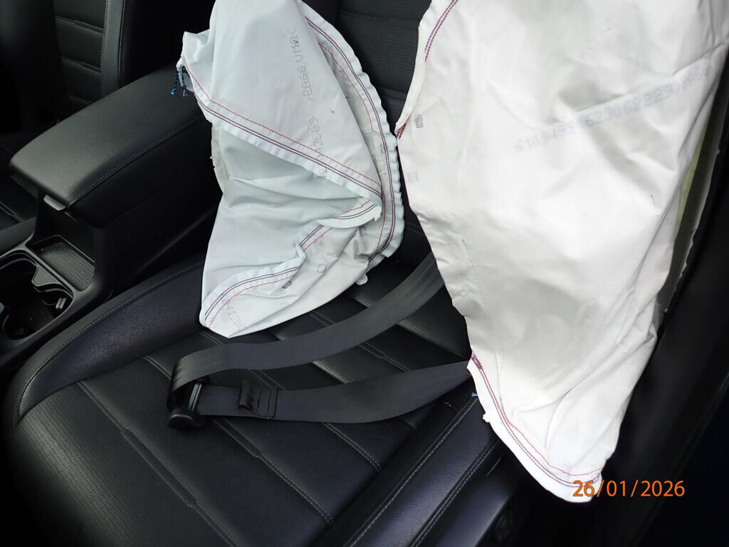 Spoiler avant, roues avant gauche et droite, trapèze, moyeux, roulements, amortisseur, boîte de vitesses bloquée, airbags, ceintures déployées, sièges, ciel