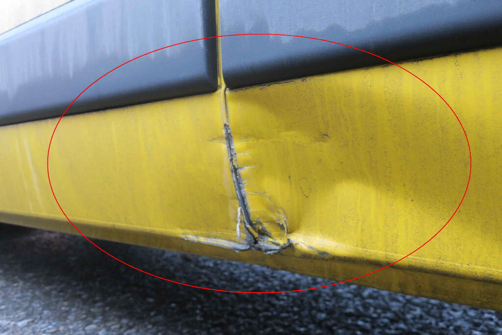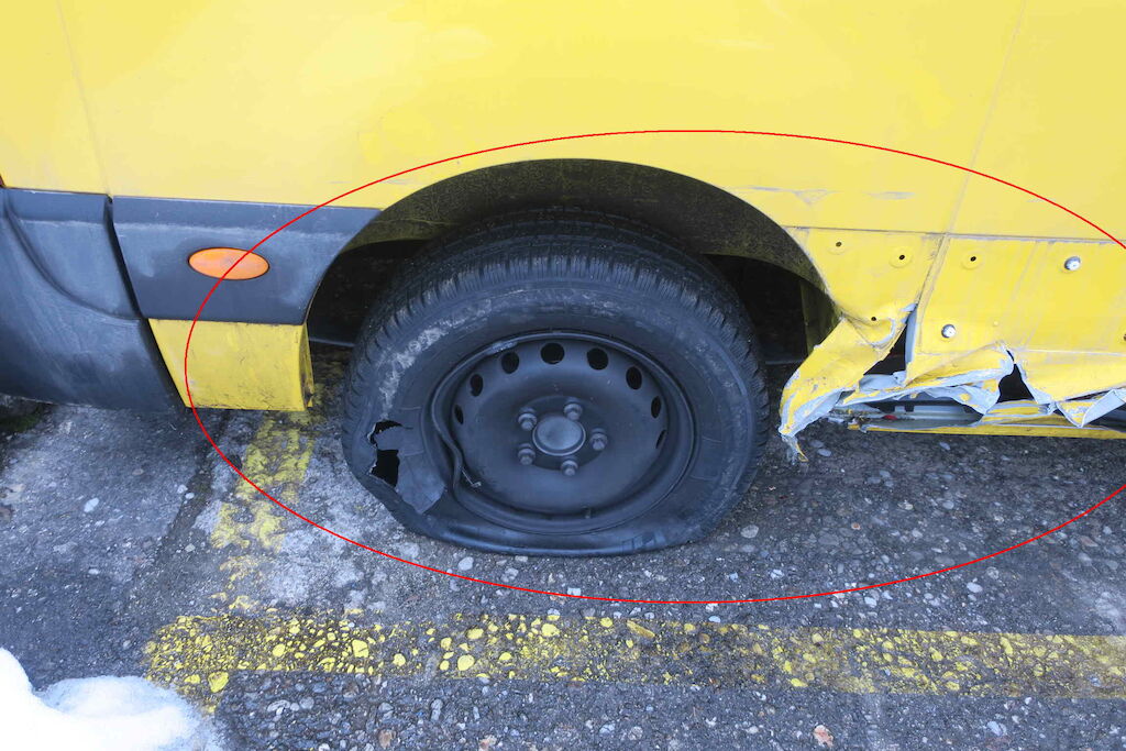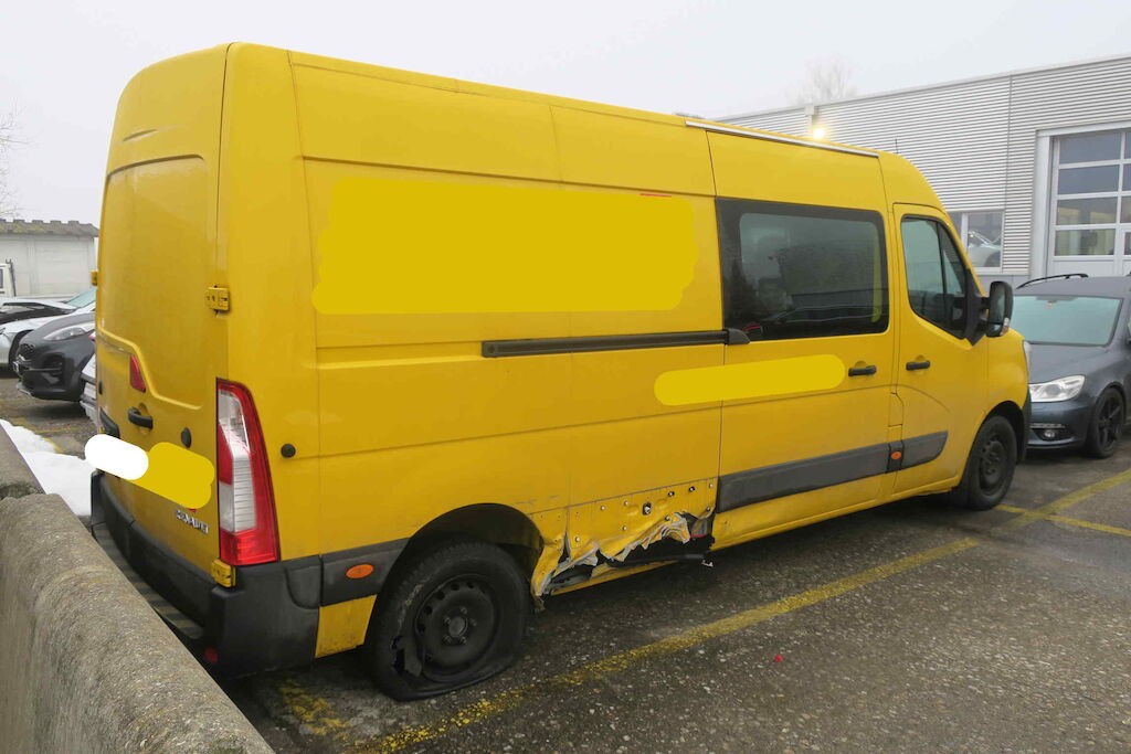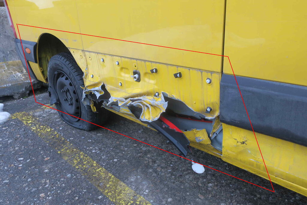 Schiebetüre, Seitenwand, Reifen, Felgen und Hinterachse rechts beschädigt
