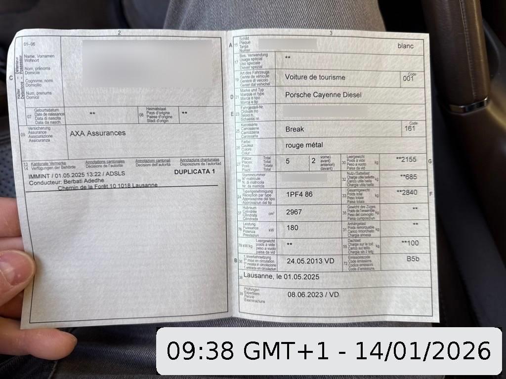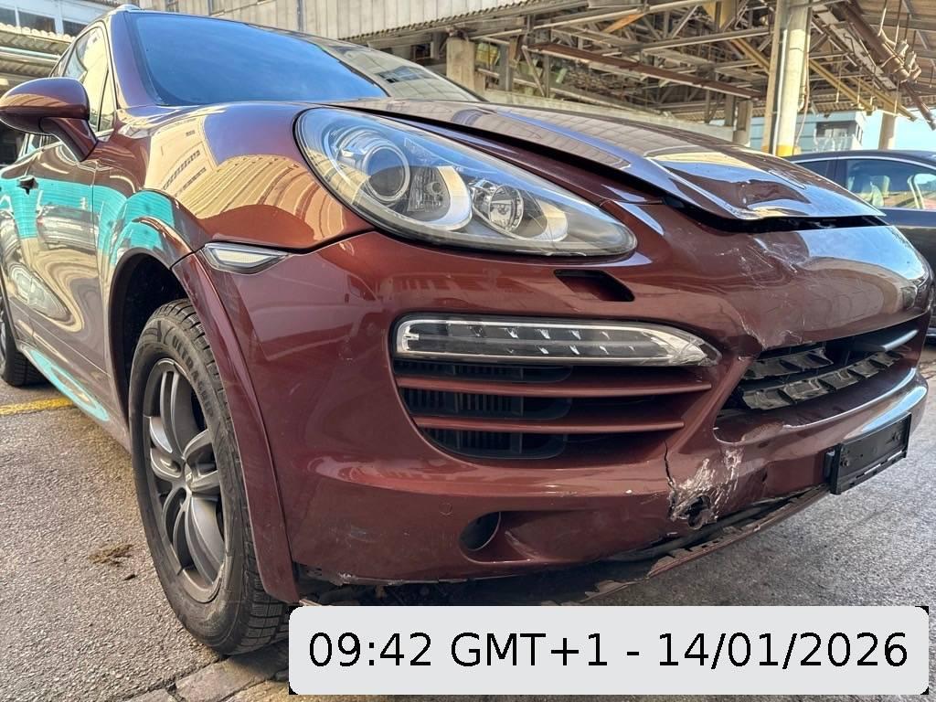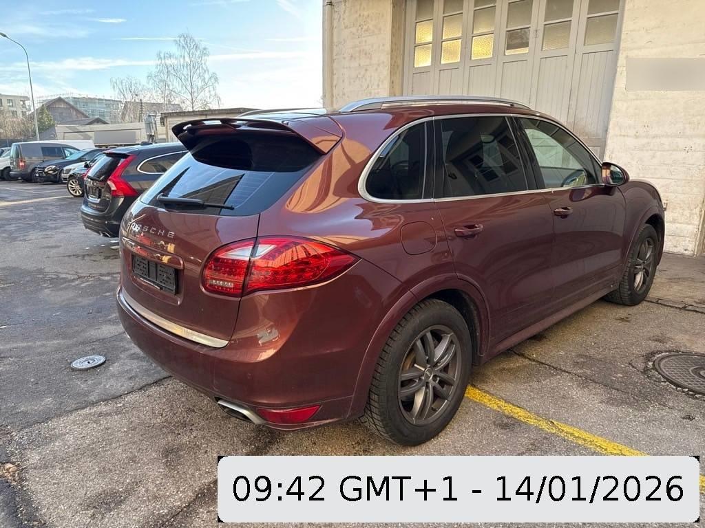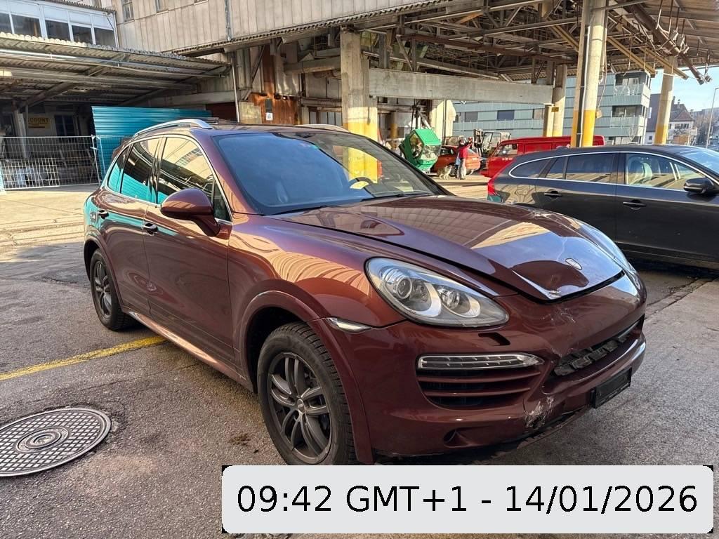 Tankdeckel-Entriegelung von innen, Airbag: Airbag Beifahrer deaktivierbar, Aktivkohlefilter, Lenkrad: Lenkrad längs- und höhenverstellbar, ISOFIX Kindersitzvorrichtung, Zweiklanghorn, Metallapplikationen, Steckdose 12V, Aussentemperaturanzeige, Kofferraum-Entriegelung von innen, Sitze: Rücksitzlehne geteilt abklappbar, Vordersitze höhenverstellbar, Licht: Nebelschlussleuchte, Dachspoiler, Bremsassistent (BAS), Scheibenwischer vorne mit Intervall, Stabilisatoren vorne und hinten, Assist: Tempomat, Leseleuchten vorne, Assist: Seitenaufprall-Schutzsystem, Mittelkonsole mit Ablagefach, 3-Punkt-Sicherheitsgurte auf allen Plätzen, Licht: Fahrlichtassistent (automatisches Fahrlicht), Steckdose, Partikelfilter und Oxydationskatalysator, Räder: Reifenreparatur-Set mit Kompressor, Vorbereitung für Anhängevorrichtung, Höhenverstellbare Gurten vorne, Getriebe: 8-Stufen-Automat sequentiell, Gurtstraffer vorne und hinten, Armauflage Mittelkonsole vorn mit integriertem Ablagefach, Tageskilometerzähler, Elektrische Fensterheber vorne + hinten, Fahrstabilisierungssystem Porsche – Stability-Management (PSM), Sitze: Komfortsitze vorne elektr. verstellbar, Leseleuchten hinten, Katalysator geregelt, Lackierung: Uni-Lackierung, Türgriffe aussen in Wagenfarbe, Nichtraucherausführung, Wartungsintervall-Anzeige, Allradantrieb permanent, Klimatisierungsautomatik, Auspuffanlage mit 2 Endrohren (links und rechts), Bremssättel schwarz lackiert, Getönte Scheiben, Bremsbelag-Verschleissanzeige, Elektronische Parkbremse, Heckscheibenheizung, Bordcomputer, Zentralverriegelung mit Fernbedienung, Gurtwarneinrichtung für Fahrer- und Beifahrersitz, Laderaumabdeckung, Polster: Leder-Ausstattung, 3 Kopfstützen hinten, 4 Leichtmetallräder Cayenne Rad 18J, Heckscheiben-Wisch-/Waschanlage, Wegfahrsperre elektronisch, Assist: Porsche Traction Management (PTM), Diebstahlwarnanlage mit Innenraumüberwachung, Ausstiegsleuchten in den Türen, Innenlicht-Abschaltverzögerung, Servolenkung, Digital Uhr, Reduktionsgetriebe, Adaptives Bremslicht, Automatikgurt in Fondmitte, Airbag: Airbag Fahrer und Beifahrer, Multifunktionsanzeige, Oeldruckanzeige, Antiblockiersystem (ABS), Ablagefach in Armlehne hinten, Drehzahlmesser, Licht: LED Heckleuchten, Airbag: Seitenairbag für Fahrer und Beifahrer, Fussraumbeleuchtung vorne und hinten, Licht: LED Blink- und Positionsleuchten, Aussenspiegel rechts und links beheizt, elektrisch verstell- / und einklappbar, Audiosystem CDR-31, Airbag: Window-Kopfairbags, Antriebsschlupfregelung (ASR)