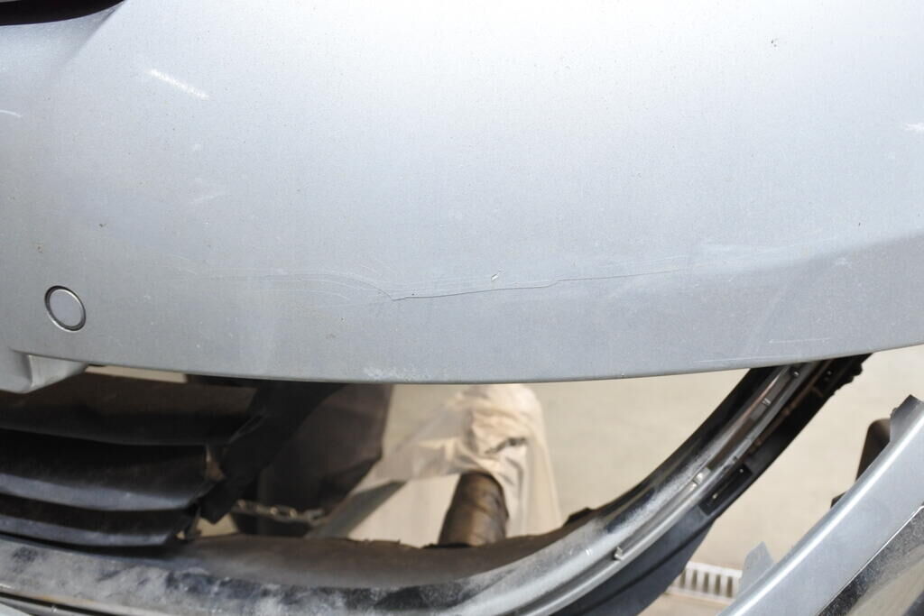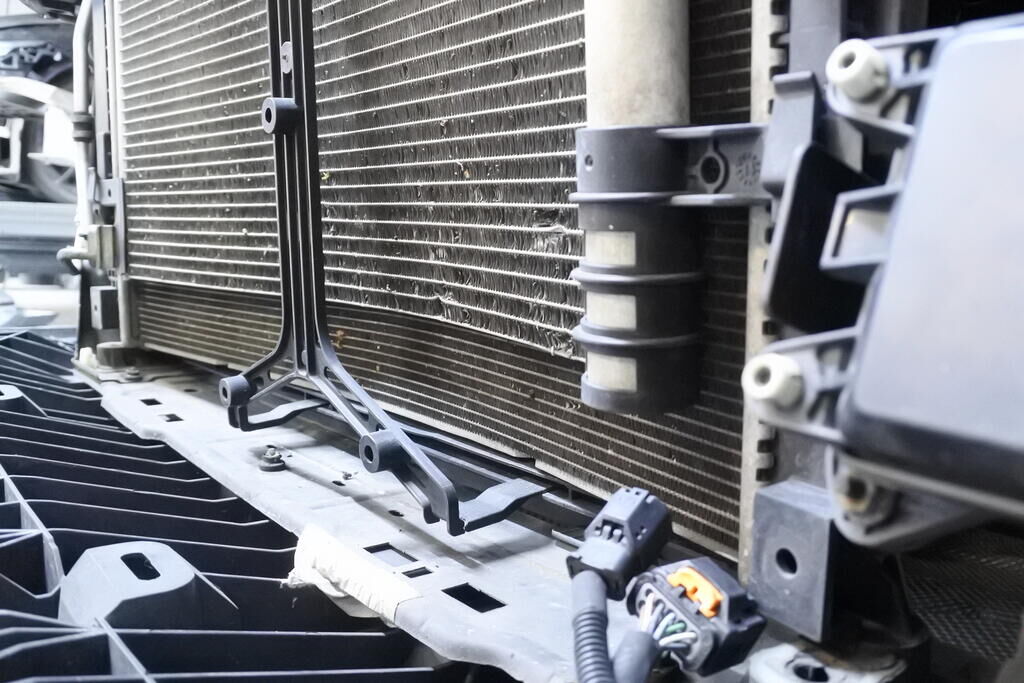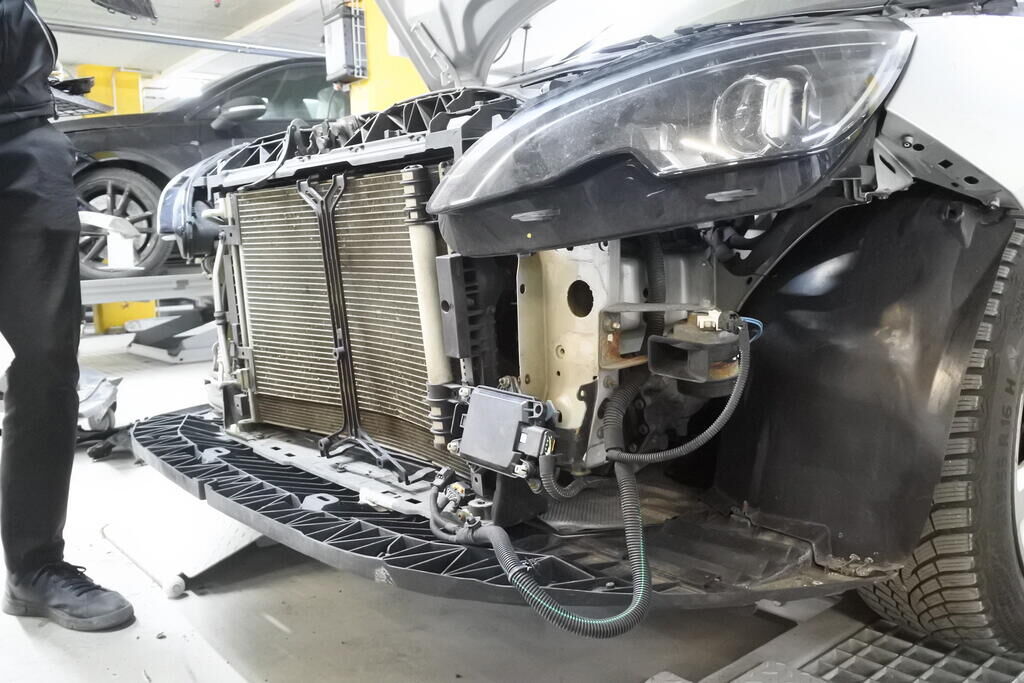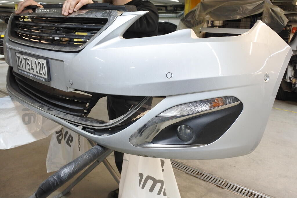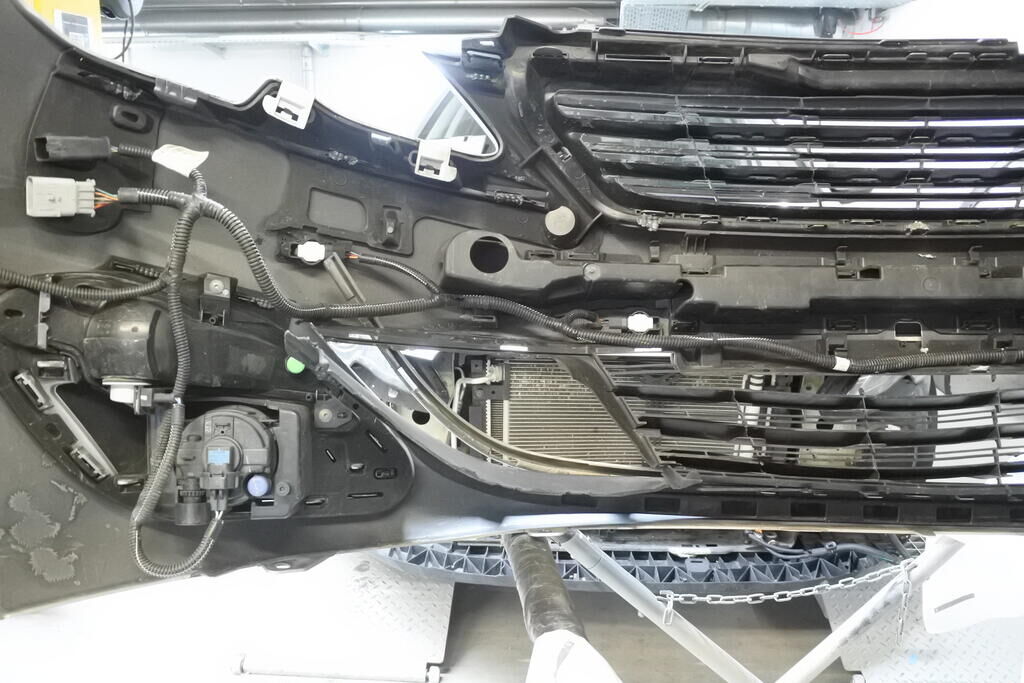 Die Stossstange mit Anbauteilen, die Kühlanlage, der Radar sowie die Frontstrebe sind eingedrückt und beschädigt.