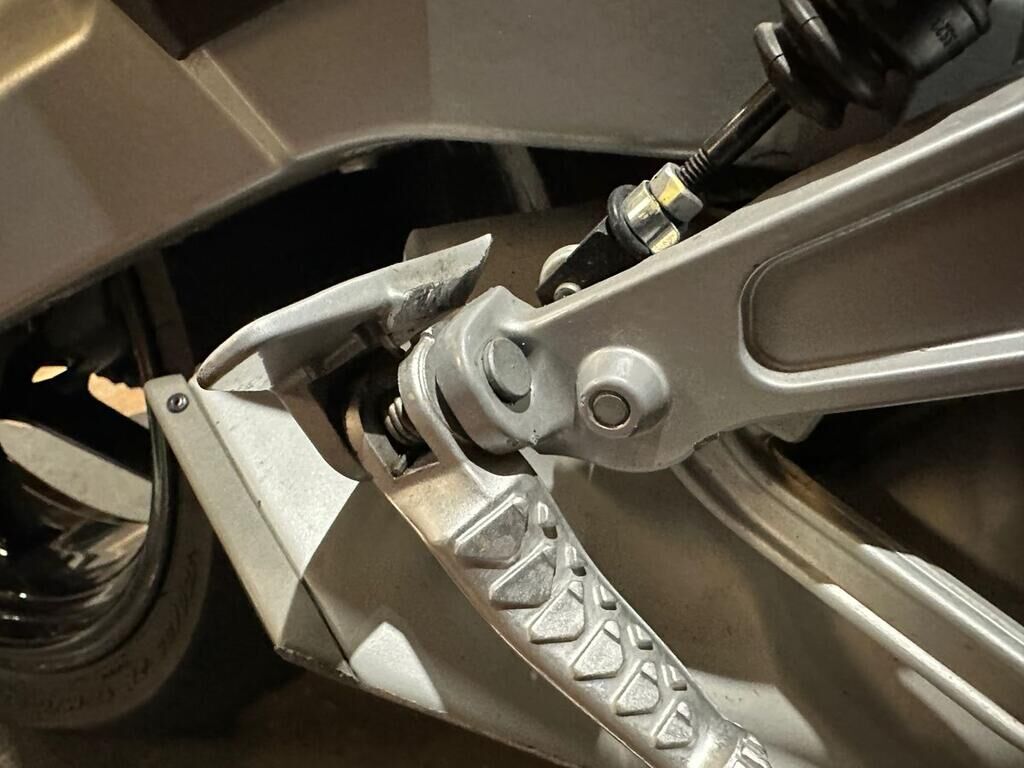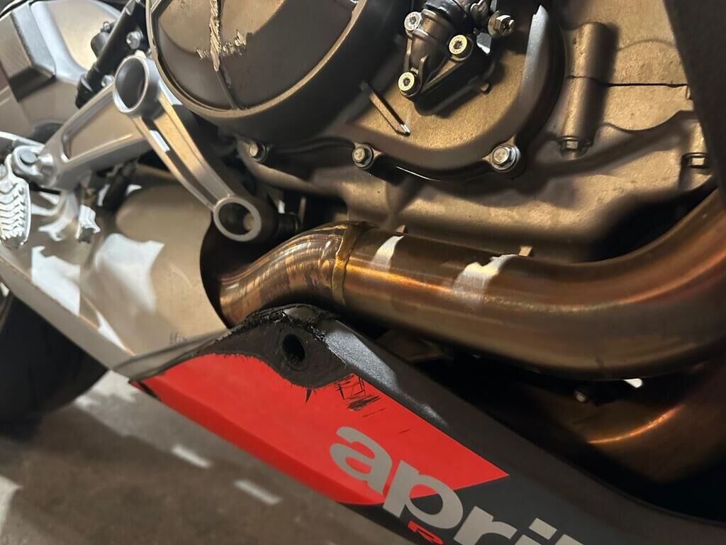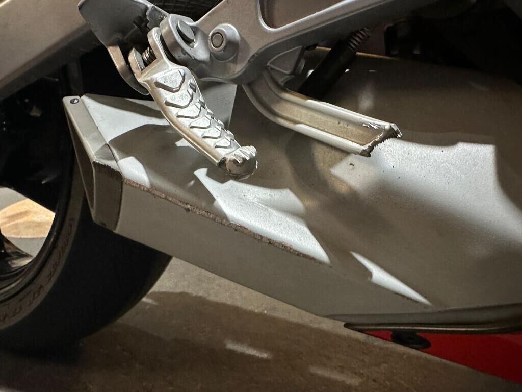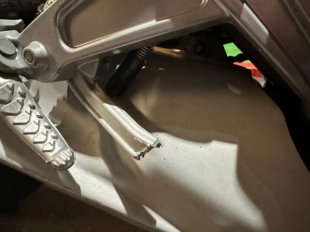 Deformation der Gabel, Lenker, Bremshebel, Tank, Verkleidungen, Motordeckel, Fusshebel, Fussraste, Hitzeschutz und der Schwinge hinten.