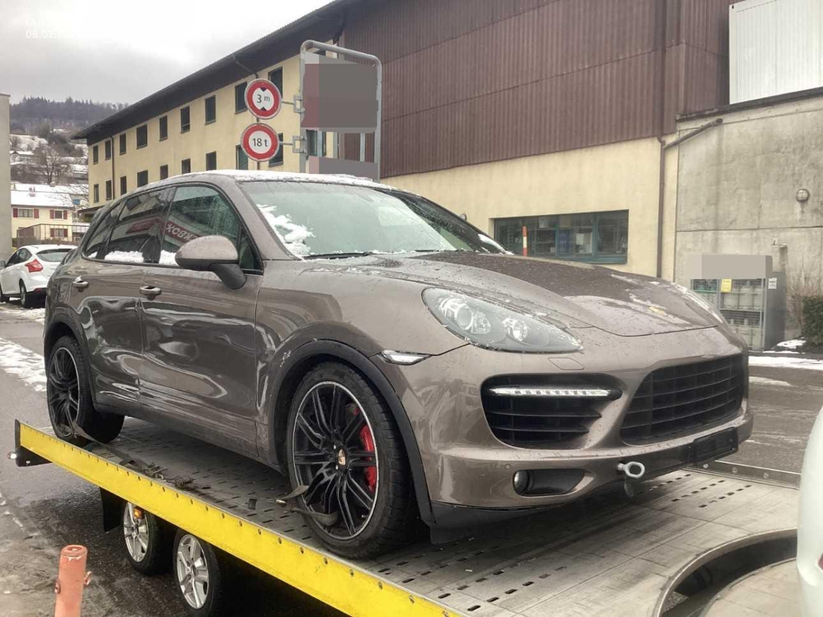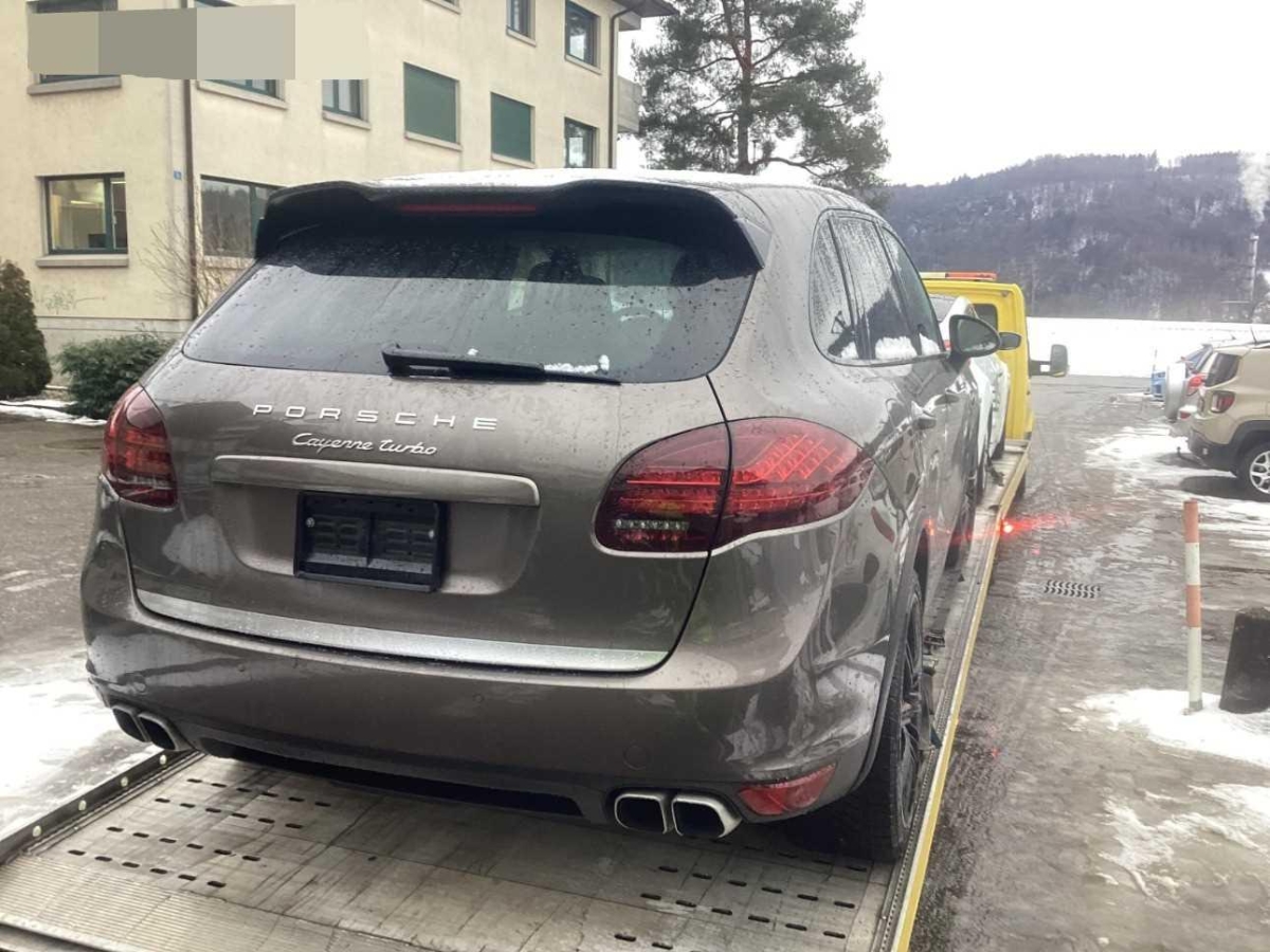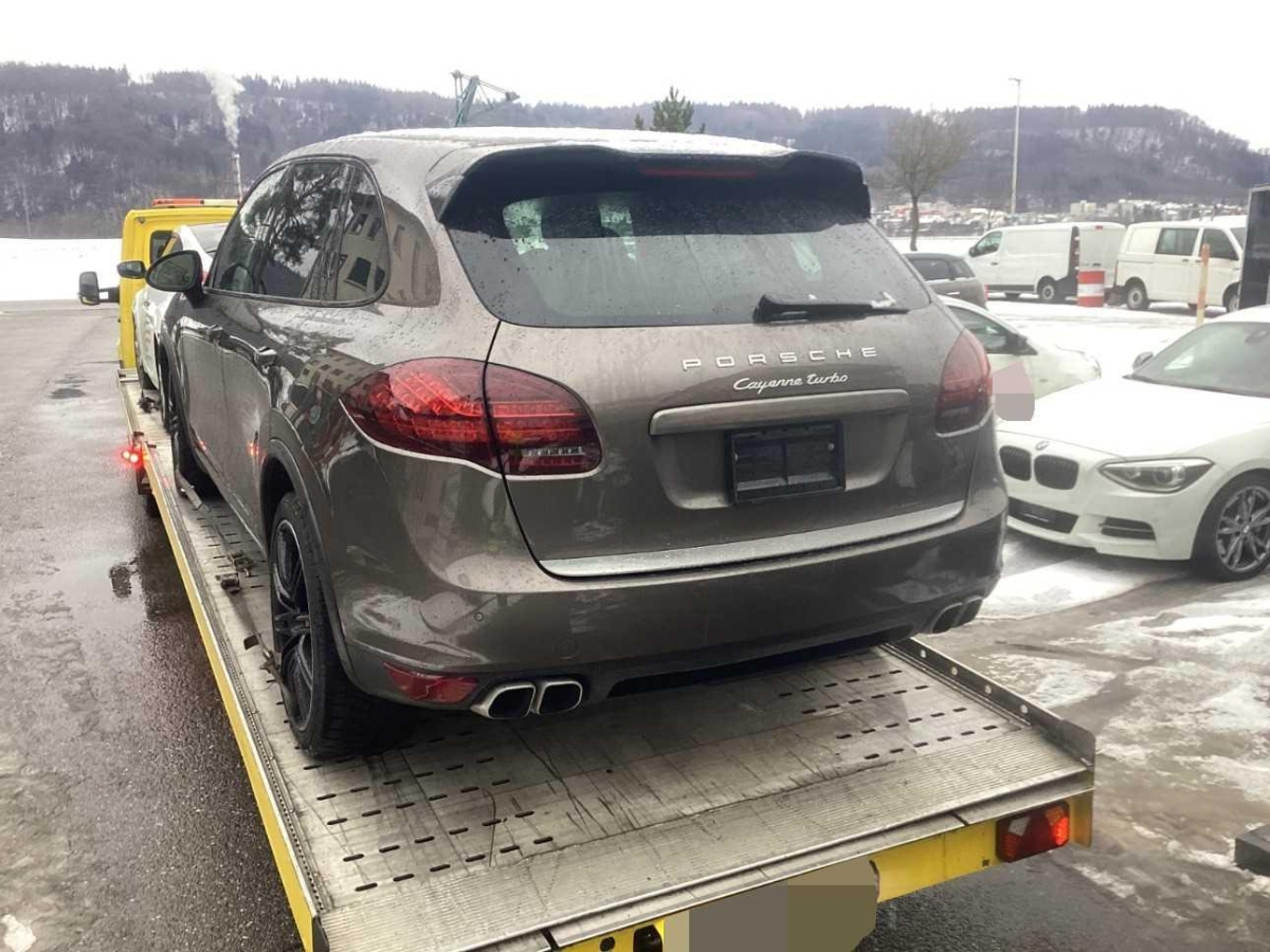 Fussraumbeleuchtung vorne und hinten, Dachhimmel in Alcantara, 4 Leichtmetallräder Cayenne Turbo Rad 19J, Elektrische Fensterheber vorne + hinten, Heckscheibenheizung, Sitze: Rücksitzlehne geteilt abklappbar, Vorbereitung für Anhängevorrichtung, Ausstiegsleuchten in den Türen, Bi-Xenon-Scheinwerfer inkl. Reinigungsanlage, schwarz, 3 Kopfstützen hinten, Räder: Reifenreparatur-Set mit Kompressor, Steckdose, Airbag: Window-Kopfairbags, Automatikgurt in Fondmitte, Tankdeckel-Entriegelung von innen, Aussenspiegel rechts und links beheizt, elektrisch verstell- / und einklappbar, Reduktionsgetriebe, Kofferraum-Entriegelung von innen, Innenlicht-Abschaltverzögerung, ISOFIX Kindersitzvorrichtung, Sitze: Sitzheizung vorne und hinten, Lenkradheizung, Licht: Nebelschlussleuchte, Elektronische Parkbremse, Zweiklanghorn, Tageskilometerzähler, Servolenkung, Digital Uhr, Antiblockiersystem (ABS), Vordersitze höhenverstellbar, Licht: Fahrlichtassistent (automatisches Fahrlicht), Porsche Active Suspension Management (PASM): Luftfederung inkl. Niveau- regulierung, Assist: Tempomat, Innenspiegel und Aussenspiegel links automatisch abblendend, Gurtwarneinrichtung für Fahrer- und Beifahrersitz, Höhenverstellbare Gurten vorne, Lederausstattung Glattleder einfarbig, Gurtstraffer vorne und hinten, Getriebe: 8-Stufen-Automat sequentiell, Heckscheiben-Wisch-/Waschanlage, Türgriffe aussen in Wagenfarbe, Oeldruckanzeige, Wegfahrsperre elektronisch, Aluminium-Paket, Dachspoiler, Lackierung: Metallic-Lackierung, Räder: Reifendruckkontrollsystem ( RDK ), Adaptives Bremslicht, Wartungsintervall-Anzeige, Leseleuchten hinten, Mittelkonsole mit Ablagefach, Klimatisierungsautomatik, Bremsassistent (BAS), Assist: Seitenaufprall-Schutzsystem, Licht: LED Heckleuchten, Steckdose 12V, Bordcomputer, 6-Kolben-Aluminium-Monobloc-Festsattelbremsen vorne, Scheibenwischer vorne mit Intervall, Antriebsschlupfregelung (ASR), Park Distance Control vorne und hinten, Sitze: Komfortsitze vorne elektr. verstellbar, Ablagefach in Armlehne hinten, 3-Punkt-Sicherheitsgurte auf allen Plätzen, Einstiegsschienen vorne, Allradantrieb permanent, Laderaumabdeckung, Sportauspuffanlage, Bremsbelag-Verschleissanzeige, Armauflage Mittelkonsole vorn mit integriertem Ablagefach, Diebstahlwarnanlage mit Innenraumüberwachung, Multifunktionsanzeige, Auspuffanlage mit 2 Endrohren (links und rechts), Katalysator geregelt, Leseleuchten vorne, Aussentemperaturanzeige, Zentralverriegelung mit Fernbedienung, Fahrstabilisierungssystem Porsche – Stability-Management (PSM), Airbag: Airbag Beifahrer deaktivierbar, Metallapplikationen, Kraftstofftank 100 Liter, Getönte Scheiben, Assist: Porsche Traction Management (PTM), Media: Bose Surround Soundsystem, Adaptive Sportsitze inkl. Komfort- Memory-Paket, Airbag: Airbag Fahrer und Beifahrer, Airbag: Seitenairbag für Fahrer und Beifahrer, Porsche Communication Management (PCM) – inklusiv erweitertem Navigationsmodul, Licht: LED Blink- und Positionsleuchten, Drehzahlmesser, Aktivkohlefilter