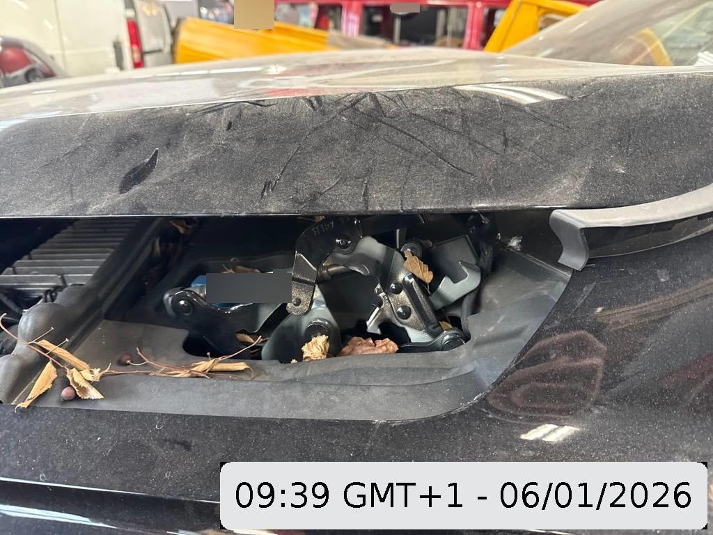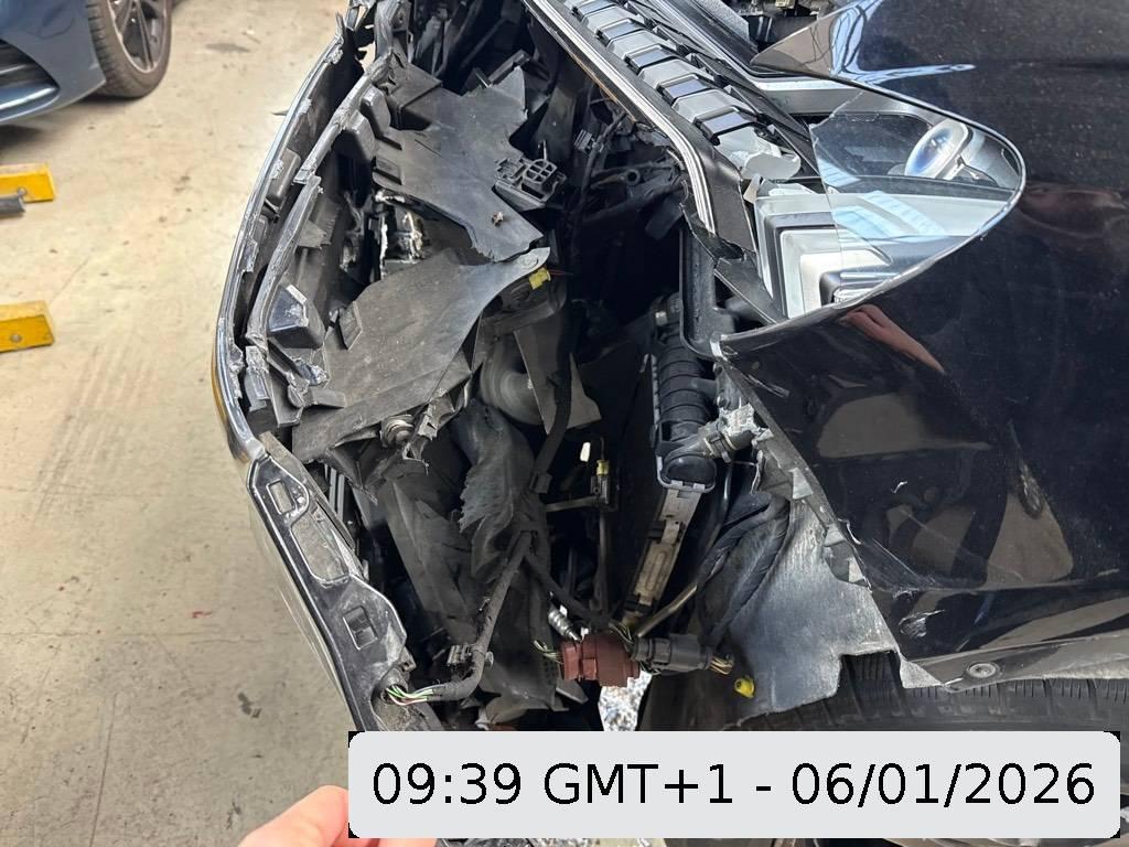 Diverse Anbauteile, Diverse Gebrauchspuren, Federbein vorne links, Front, Front links, Frontscheibe, Klimakühler, Kotflügel links, Kühler, Kühlgitter, Ladeluftkühler, Lenkung, Motorhaube, Rad vorne links, Radaufhängung vorne links, Radhaus vorne links, Scheinwerfer links, Seite links, Stosstange vorne, Türe hinten links, Türe vorne links, Vorderachse