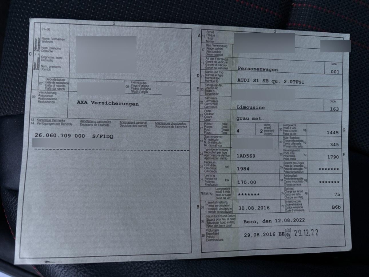 Dachspoiler, Garantie: 2 Jahre ohne Kilometerbegrenzung (ab 1. Inv.), Xenon Plus-Lichtanlage inkl. LED Tagfahrlicht und LED Rückleuchten inkl. Scheinwerfer-Waschanlage, Airbag: Airbag Fahrer und Beifahrer, Fahrer-Informationssystem, Räder: Reifenreparatur-Set (Tire Fit), Räder: Reifendruck-Kontrollanzeige, MMI Radio, Schaltknauf in speziellem Design, Audi drive select, Leichtmetallräder Parallelspeiche 17J, Stoff-/Leder-Ausstattung, Kopfstützen hinten, Frontscheibe mit Color-Band, Interieurelemente mono.pur, Multifunktions-Sportlederlenkrad 3-Speichen, Fussstütze und Pedalkappen in Edelstahl, Heckscheibenheizung, Seitenairbag für Fahrer und Beifahrer, Media: Digitaler Radioempfang (DAB), Dachhimmel schwarz, Wärmeschutzverglasung, Modellbezeichnungen (Logo & Model), Elektronische Differentialsperre (EDS), Höhenverstellbare Gurten vorne, LED Blinker im Aussenspiegel, Verzurrösen, Seitenaufprall-Schutzsystem, Ausströmermanschetten schwarz hochglanz, Scheibenwischer vorne mit Intervall, Make up-Spiegel links, Aluminium-Applikationen, Lenkrad tiefenverstellbar, Aussenspiegel in Alu, Getriebe: 6-Gang-Getriebe manuell, Warndreieck, Gurtstraffer vorne, S Sportfahrwerk, Steckdose 12V, Einstellbare Lendenwirbelstütze für den Fahrer und Beifahrer, Kopfstützen vorne höhenverstellbar, Antriebsschlupfregelung (ASR), Aussenspiegel rechts und links elektrisch verstell- und beheizbar und Scheibenwaschdüsen beheizbar, Sportsitze vorne mit Kreuzstütze, Elektrische Fensterheber, Adaptives Bremslicht, Scheinwerfer-Waschanlage, Wagenheber, Klima: Pollenfilter (Staubfilter), Klima: Klimatisierungsautomatik, Aschenbecher und Zigarettenanzünder, 3-Punkt-Sicherheitsgurte auf allen Plätzen, LED Innenlichtpaket, Getönte Scheiben, Start/Stop-Funktion, Sonnenblende zweifach, ISOFIX Kindersitzvorrichtung, Wegfahrsperre elektronisch, Airbag: Window-Kopfairbags, Fernbedienung für Zentralverriegelung, Teppichfussmatten vorne und hinten, Licht: LED Heckleuchten, Elektronisches Stabilitäts-Programm (ESP), Assist: Bremsassistent (BAS), Innenspiegel abblendbar, Servolenkung, Allradantrieb permanent, Sitze: Vordersitze höhenverstellbar, Licht: Nebelschlussleuchte, Sitze: Rücksitzlehne abklappbar, Digitales Display, Make up-Spiegel rechts, Katalysator geregelt, Zentralverriegelung mit Fernbedienung, Bremsenergie-Rückgewinnung, Nebelscheinwerfer