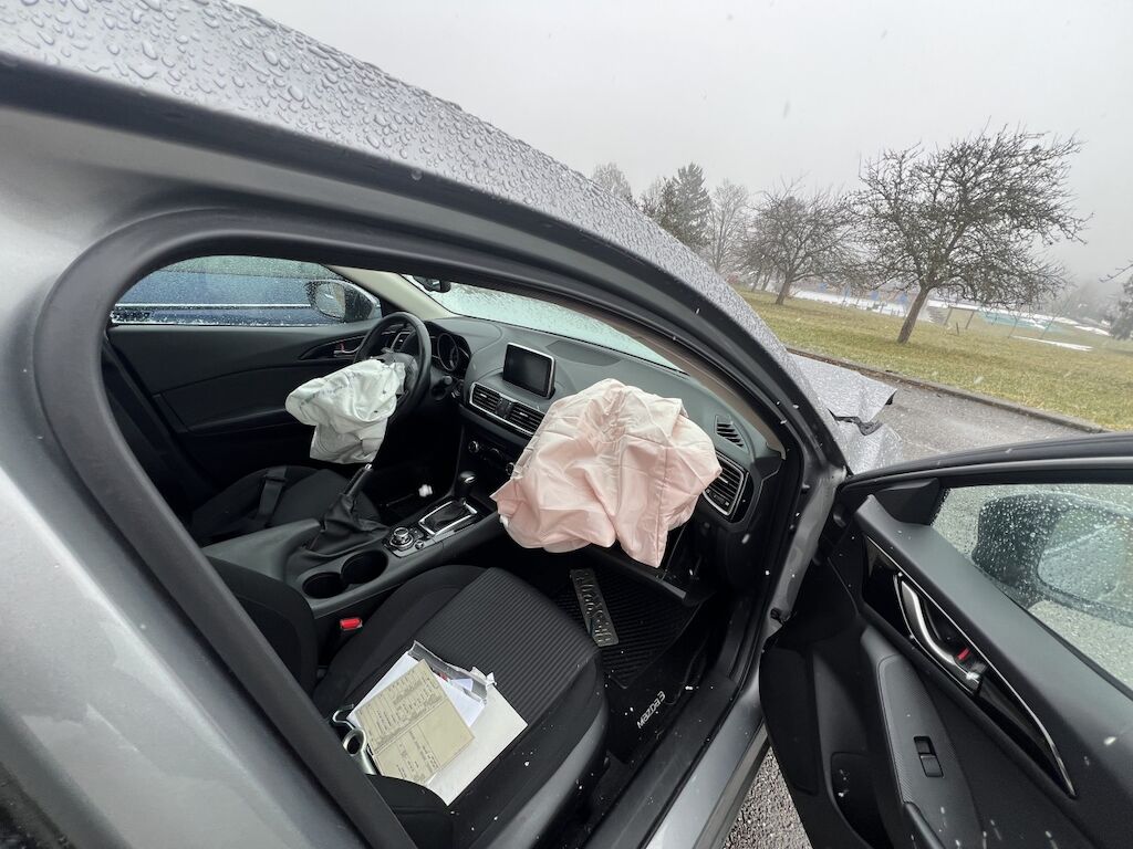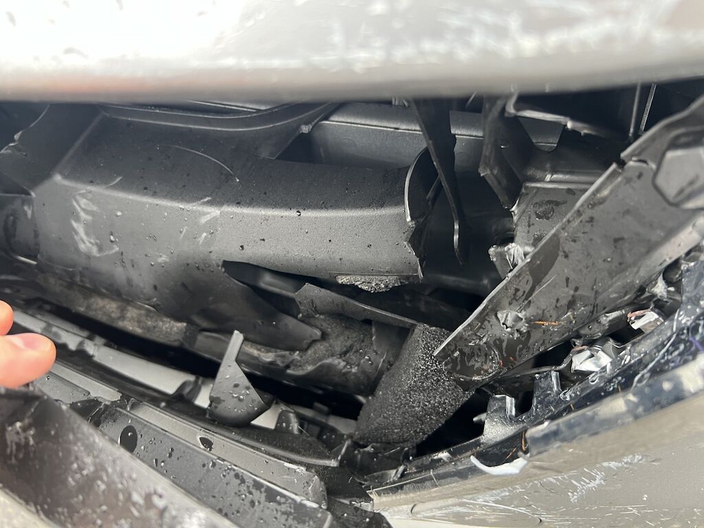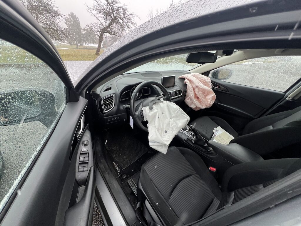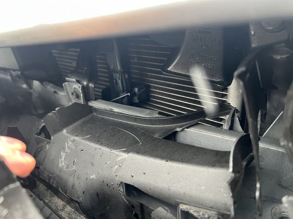 Front mit Anbauteilen eingedrückt und gestaucht. Verkleidung, beide Kotflügel, Motorhaube, etc. gestaucht. Scheinwerfer, Luftführungen, Kühlanlage, Frontmaske, etc. beschädigt. Frontairbags und Gurtstraffer wurden aktiviert.