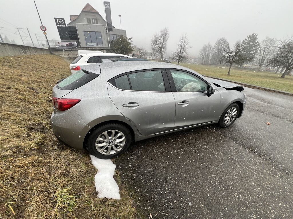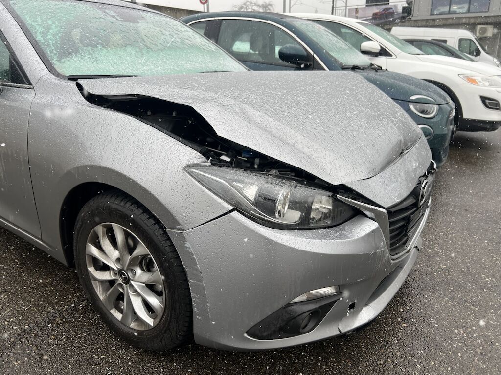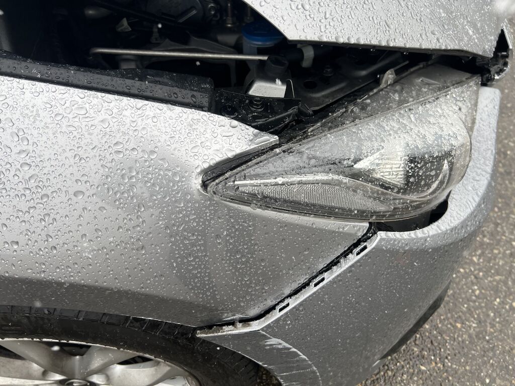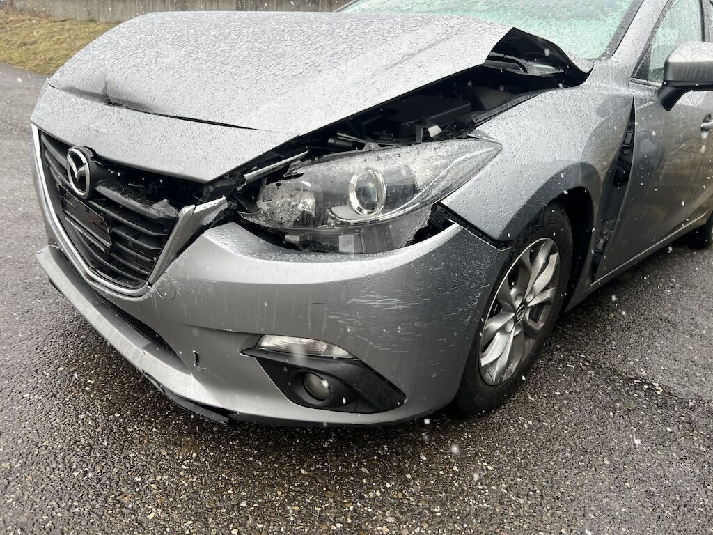 Front mit Anbauteilen eingedrückt und gestaucht. Verkleidung, beide Kotflügel, Motorhaube, etc. gestaucht. Scheinwerfer, Luftführungen, Kühlanlage, Frontmaske, etc. beschädigt. Frontairbags und Gurtstraffer wurden aktiviert.