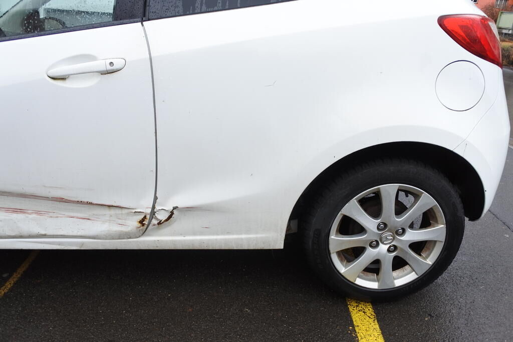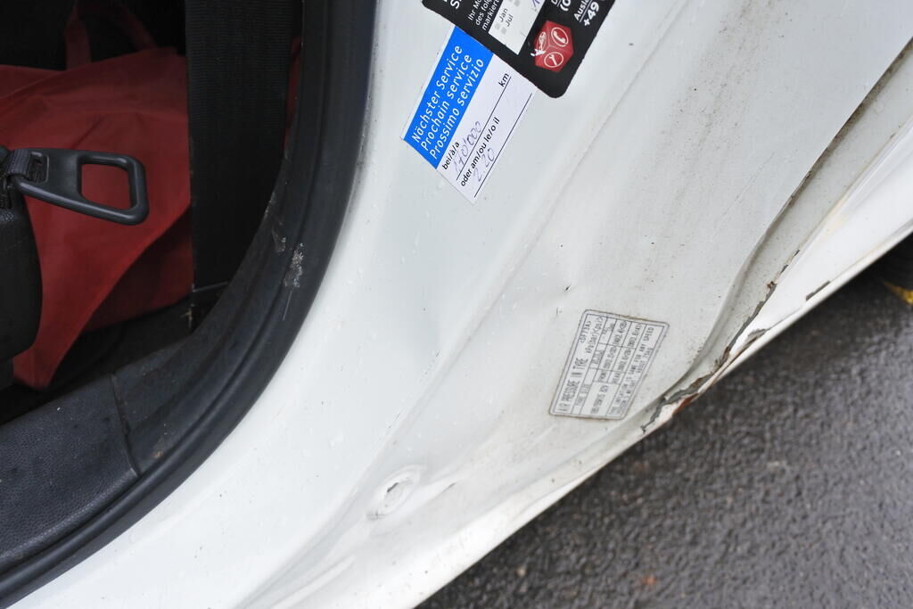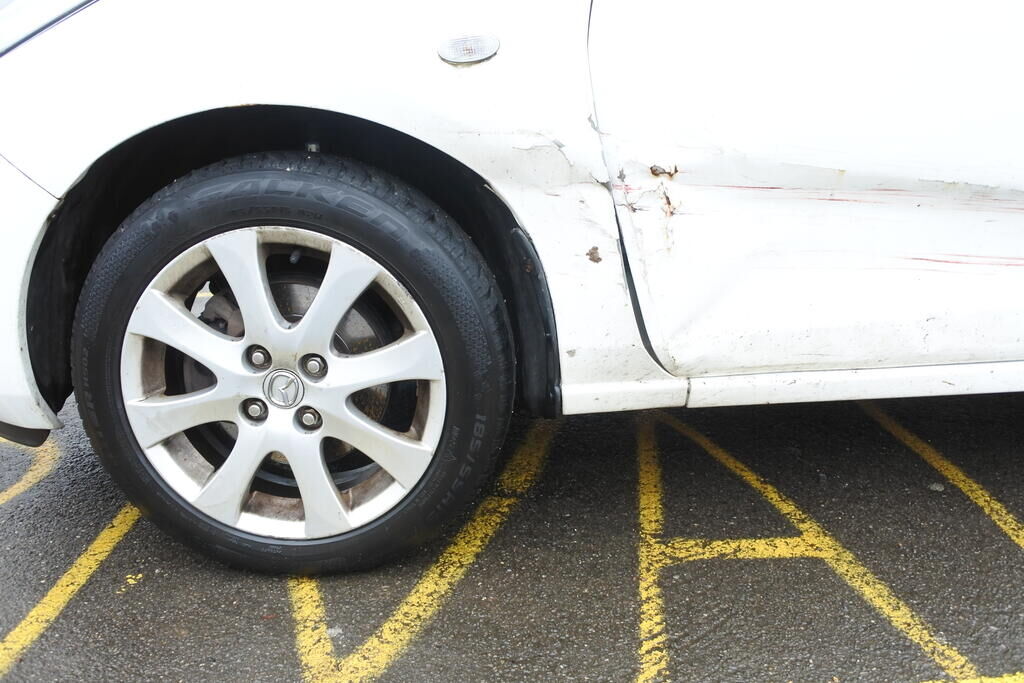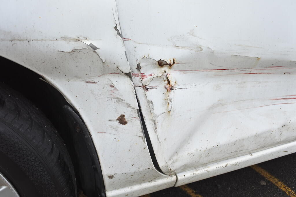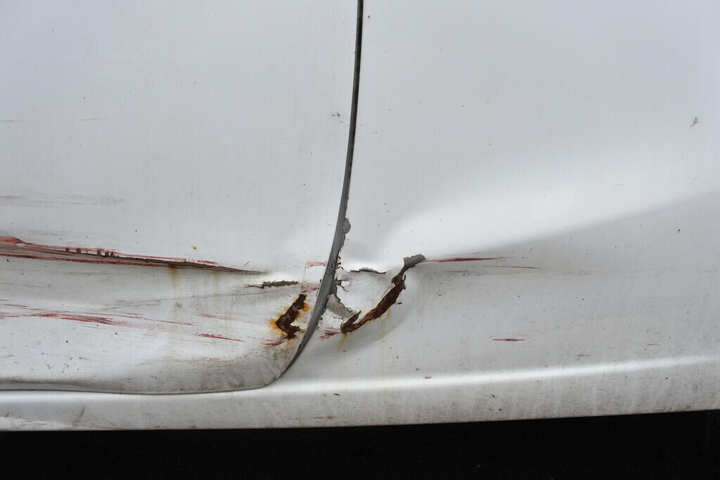 Der Kotflügel mit Auskleidung, die Fahertür sowie die Seitenwand sind beschädigt.