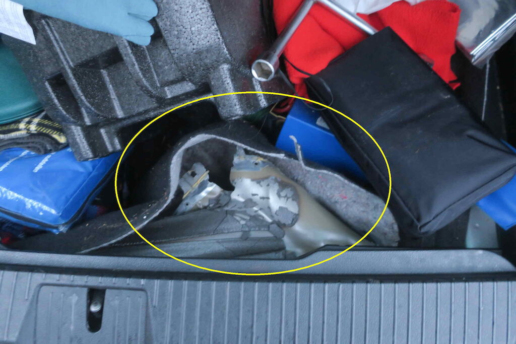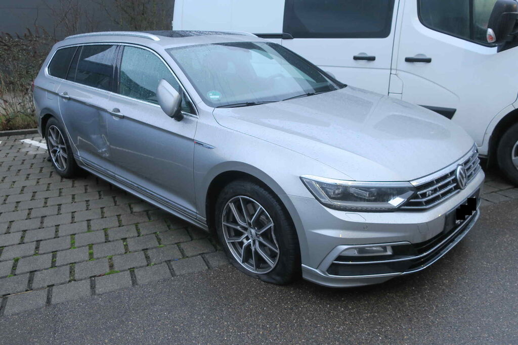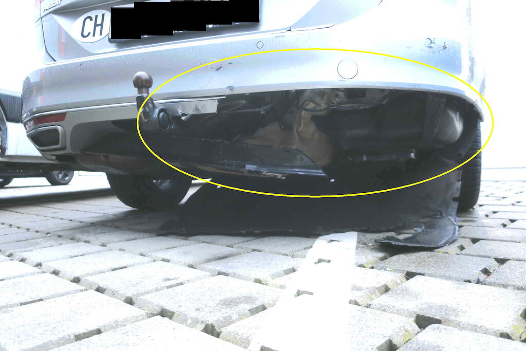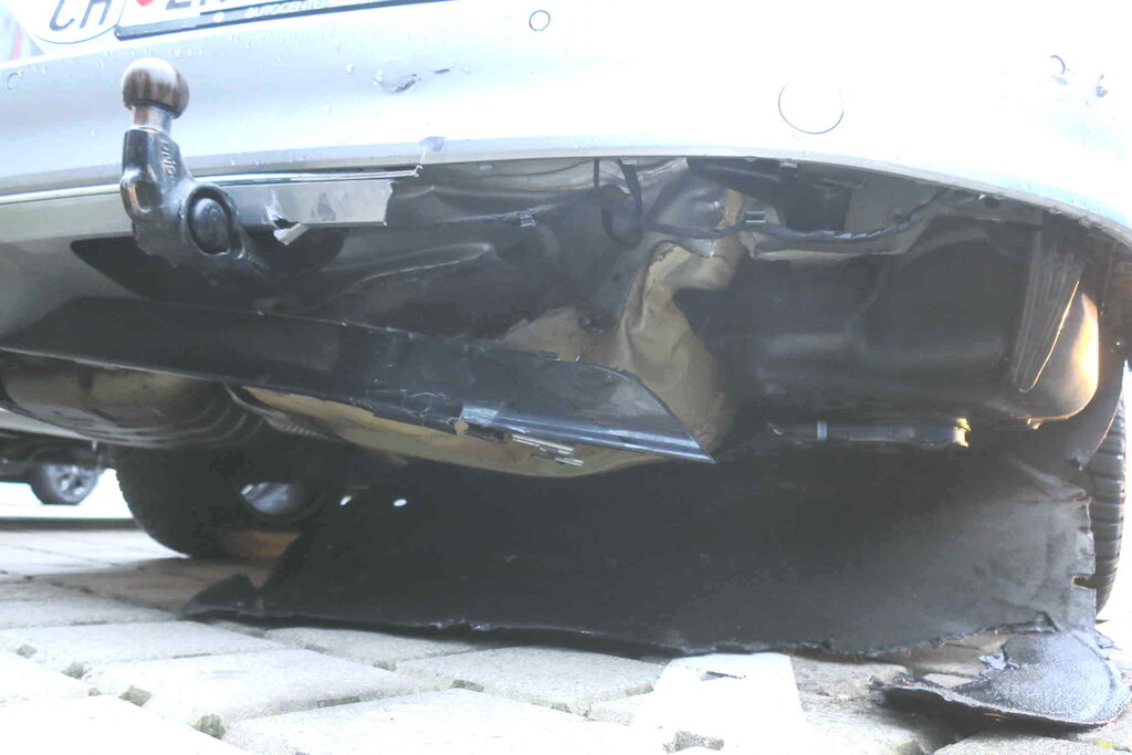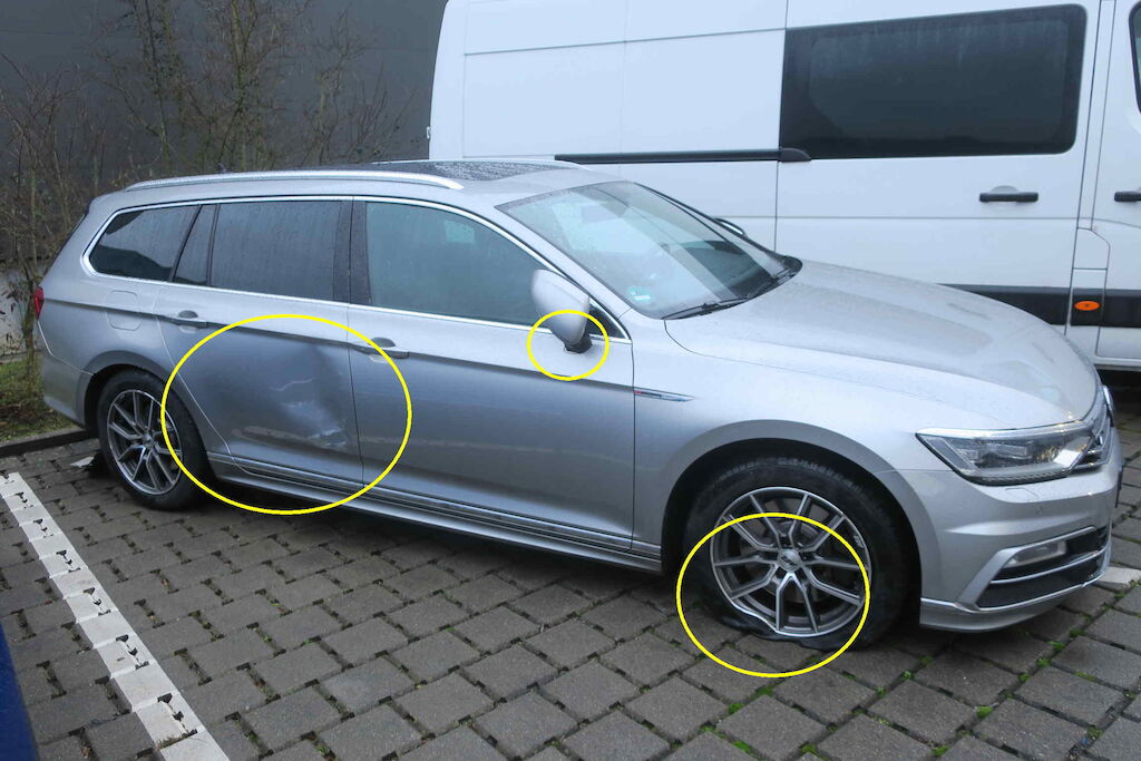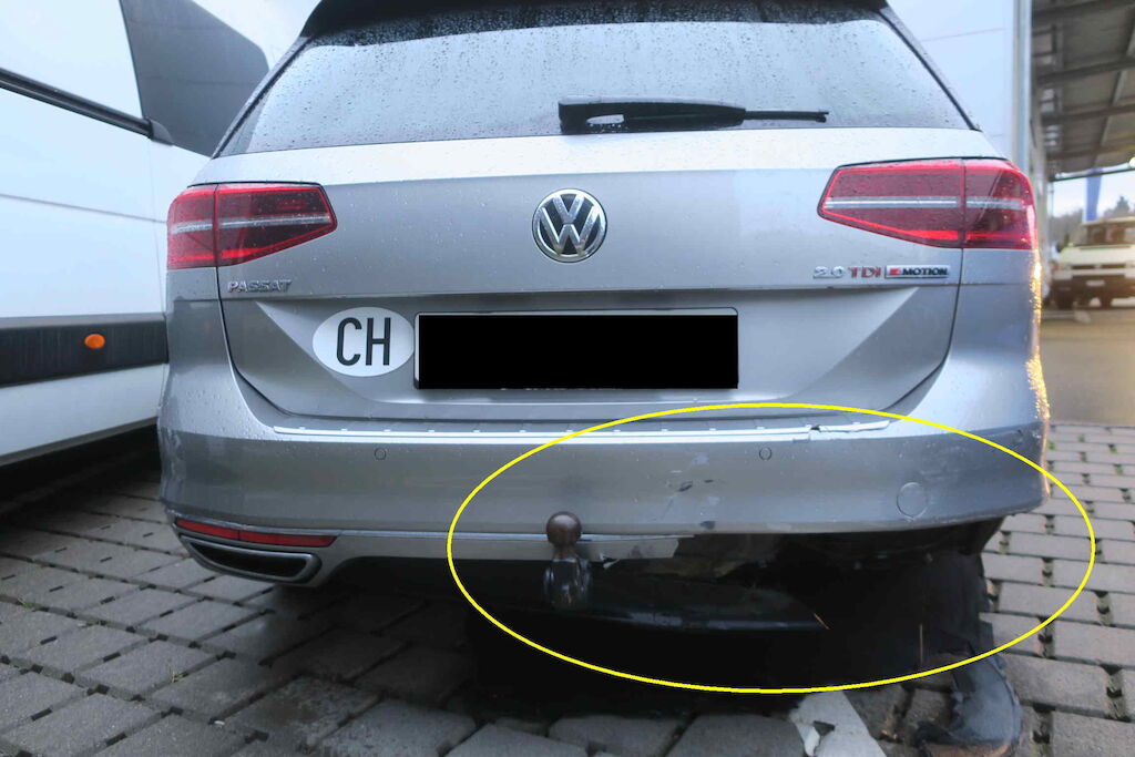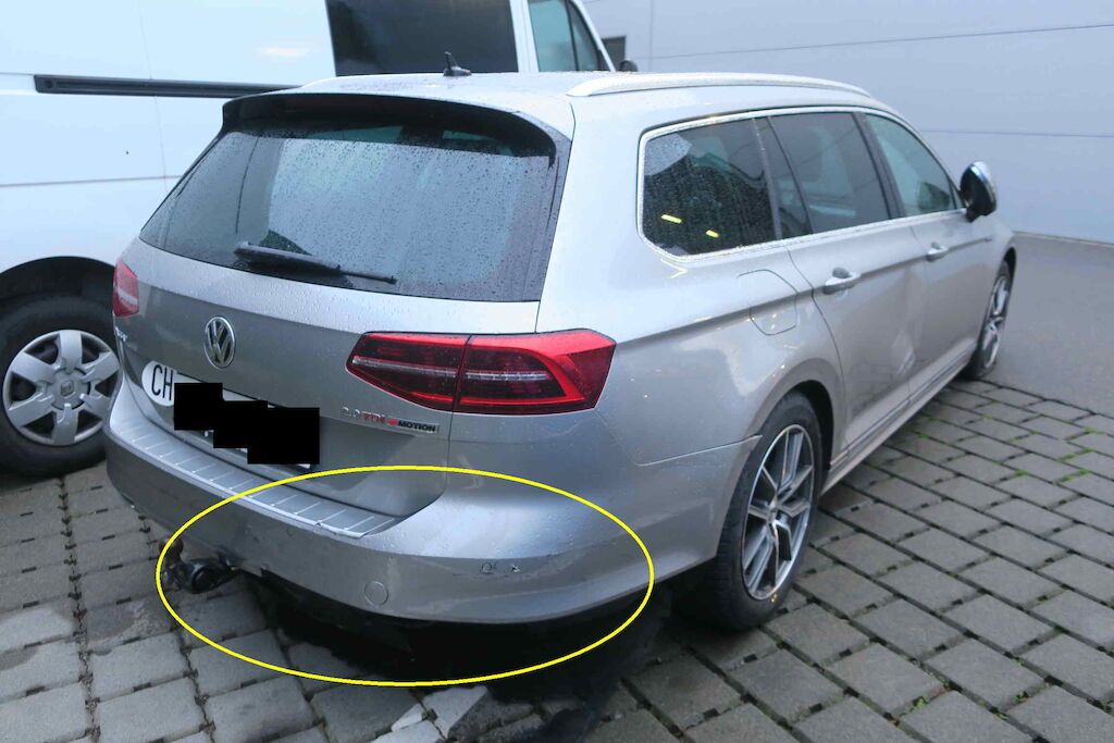 Seite rechts: Rad vo., Aussenspiegel, Türe hi., Rad hi. / Heck rechts unten: Heckblech, Kofferboden sind massiv eingedrückt, Anhängerkupplung ist deformiert.