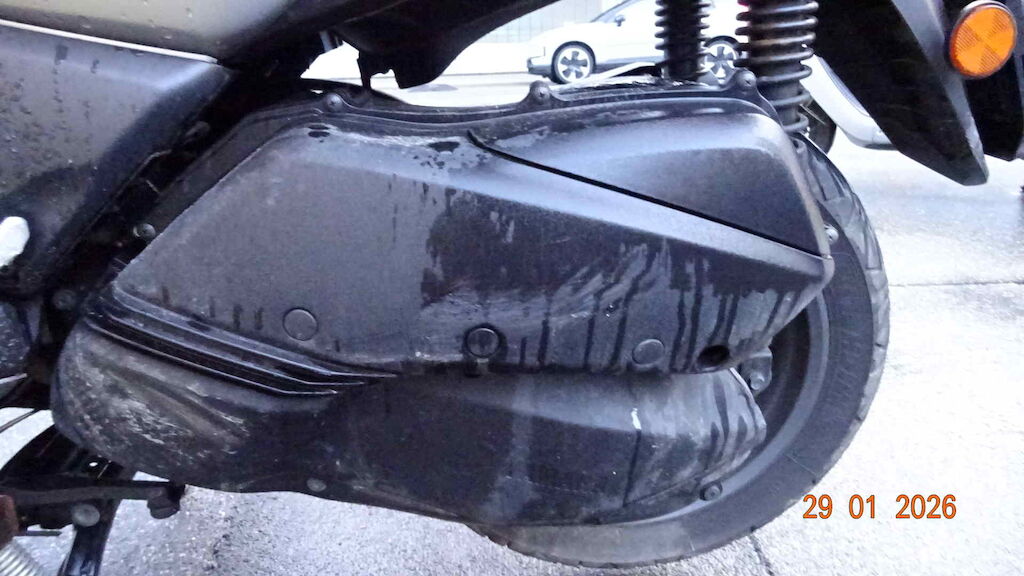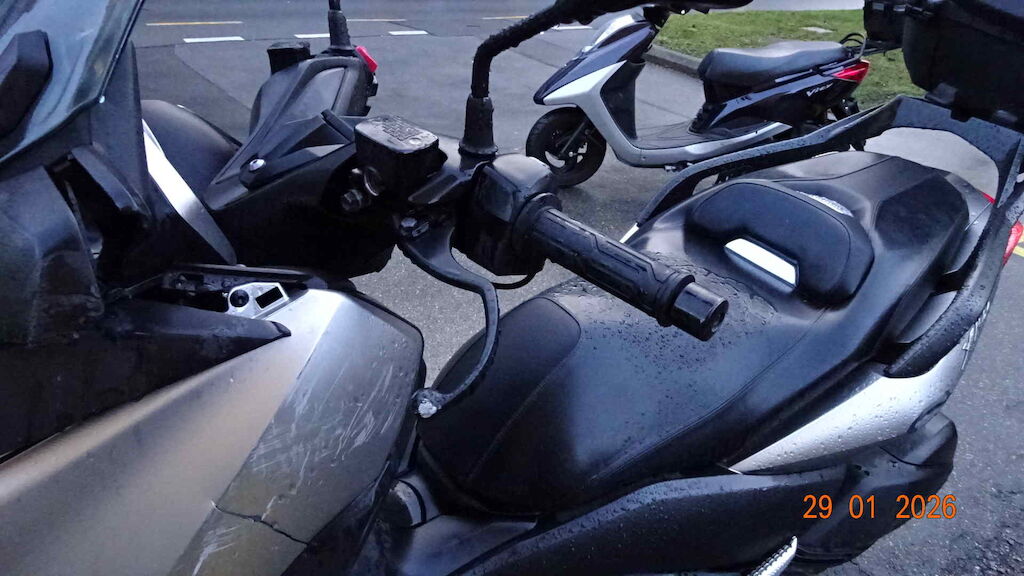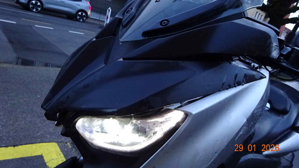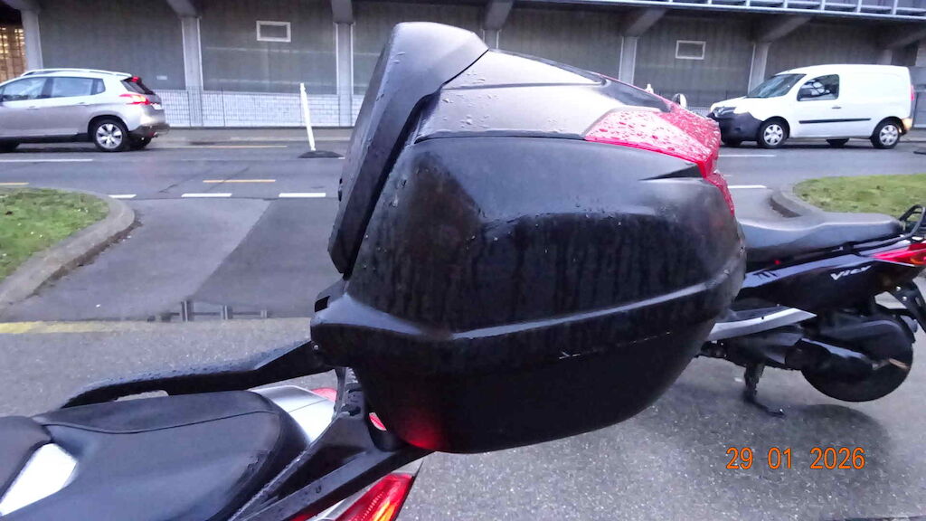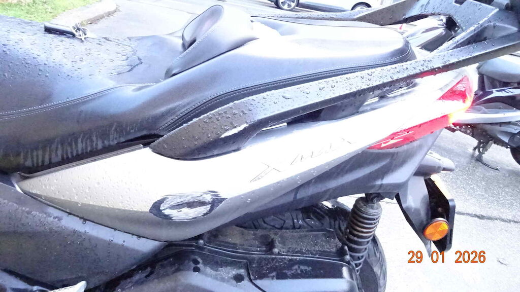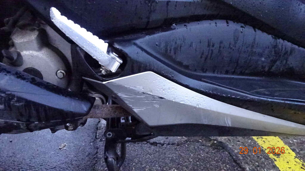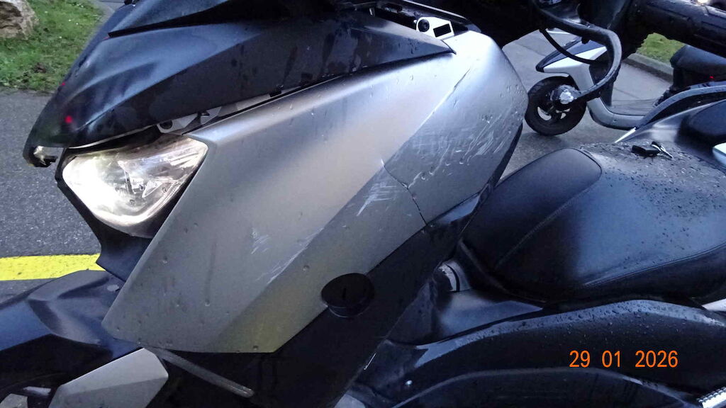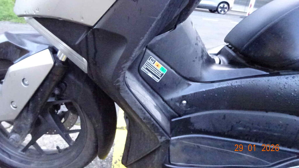 Choc arrière droite et chute côté – Carenage arrière, échappement et bas de caisse à droite, phare, cache phare, retro, levier frein, embout, carenage, latérale, bas de caisse, carenage arrière, filtre à air et top caisse côté gauche