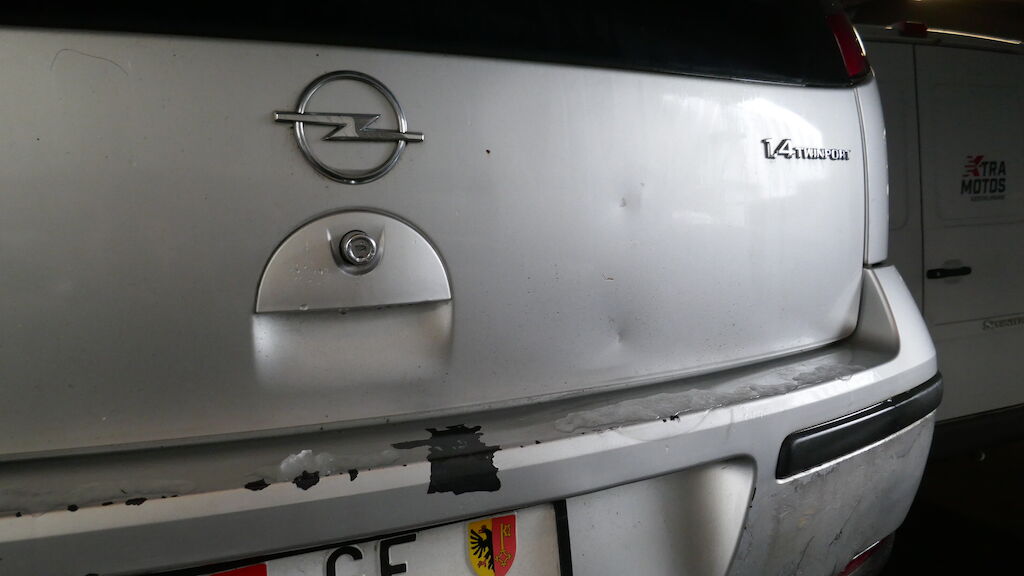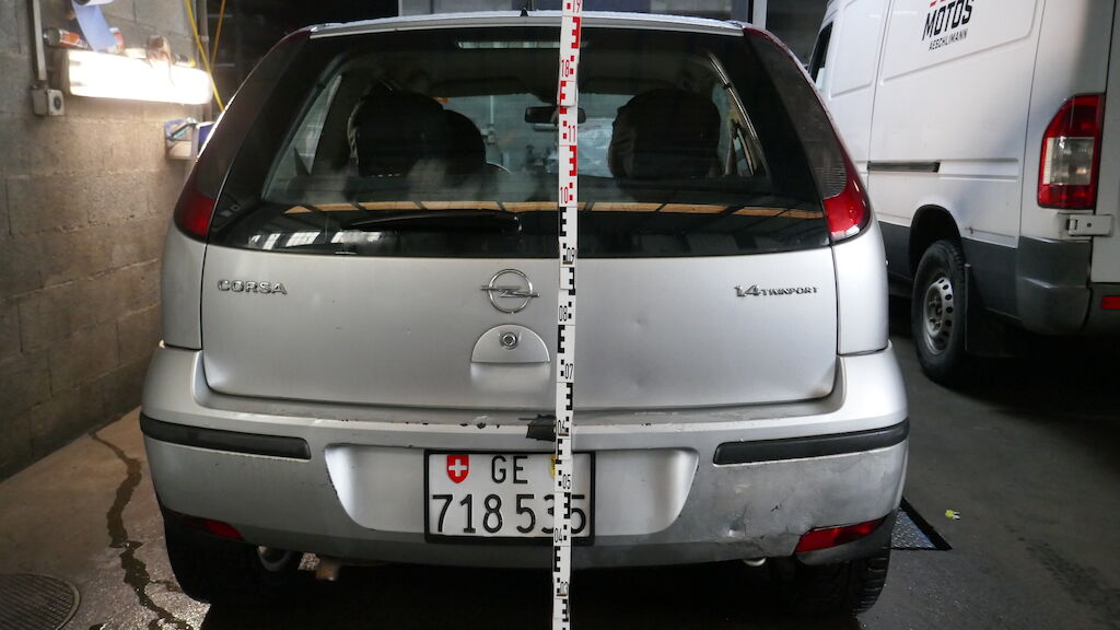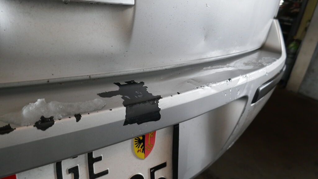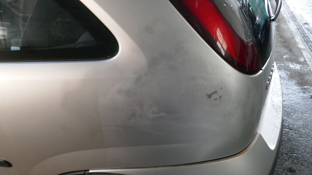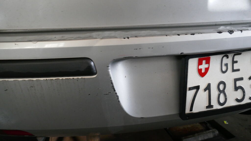 Choc arrière : Pare-chocs arrière, hayon enfoncé, déformé, éraflé.
