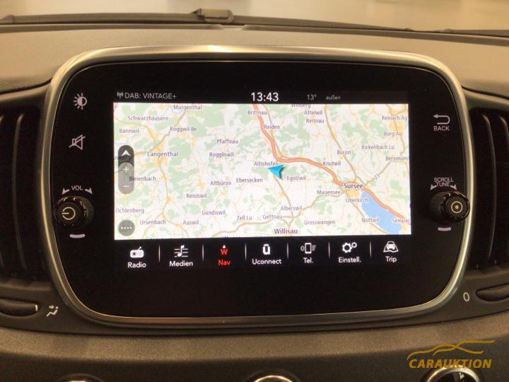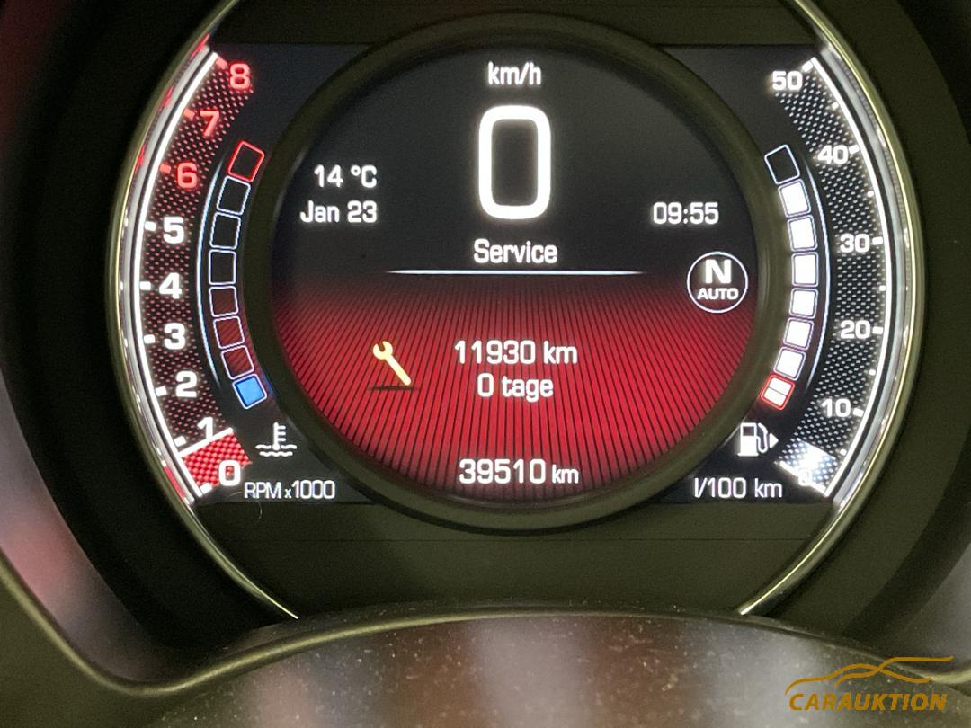 Wegfahrsperre elektronisch, Aussentemperaturanzeige, Zigarettenanzünder, Einstiegsleisten in Aluminium, Gurtstraffer mit Gurtkraftbegrenzer vorne, Autoradio mit Touchscreen, Bedienelement am Lenkrad, Bluetooth, Multimediasystem Uconnect (Freisprecheinr.,USB, AUX),DAB+, Rücksitzlehne geteilt abklappbar, 3-Punkt-Sicherheitsgurte auf allen Plätzen, Aussenspiegel rechts und links beheizbar und elektrisch verstellbar, Elektronischer Bremskraftverteilung EBD, Drive Steering Torque DST, Katalysator geregelt, Beide Make up-Spiegel beleuchtet, Auspuffanlage mit 4 Endrohren, Antiblockiersystem (ABS), Räder: Reifenpannen-Kit, Abarth-Kit Grau, Tankdeckel abschliessbar, Lederlenkrad mit Dekoreinlagen, ISOFIX Kindersitzvorrichtung, Multifunktionales Instrumentendisplay, Brembo-Bremse und lackierte Bremszangen, Airbag: Knie-Airbag für Fahrer, Pedalerie mit Aluminiumauflage, Teppichfussmatten, Klima: Klimatisierungsautomatik, Bremssättel schwarz lackiert, Lenkrad-Wippschaltung (Paddles), Abblendlichtausschaltverzögerung ‘Follow me home’, Multifunktions-Sportlenkrad in Leder, Akustisches Warnsignal bei nicht angelegtem Sicherheitsgurt, Beifahrersitz mit mechanischem Positionsspeicher (Easy-Entry), Licht: Tagfahrlicht, Getriebe: Sequentielles 5-Gang-Getriebe mit Automatikfunktion, Anti-Submarining-Airbags für Fahrer und Beifahrer, Ledersitze der Marke ‘Frau’, Bordcomputer, Schalt- / Wählhebel in Aluminiumoptik, Dekoreinlagen in Aluminium, Servolenkung, Elektrische Fensterheber vorne, Sitze: Fahrersitz höhenverstellbar, Airbag: Window-Kopfairbags, Airbag: Seitenairbags, Assist: Bremsassistent (BAS), Airbag: Airbag Fahrer und Beifahrer, Luftfilter für staubreiche Länder, Assist: Elektronisches Stabilitäts-Programm (ESP) mit Antischlupfregelung (ASR) und Hill Holder, Warnblinkautomatik bei Vollbremsung, Heckscheiben-Wisch-/Waschanlage, Uconnect LIVE, Wärmeschutzverglasung, Zentralverriegelung mit Fernbedienung, Licht: Nebelscheinwerfer, Getönte Scheiben Privacy, Licht: Bi-Xenon Lichtanlage
