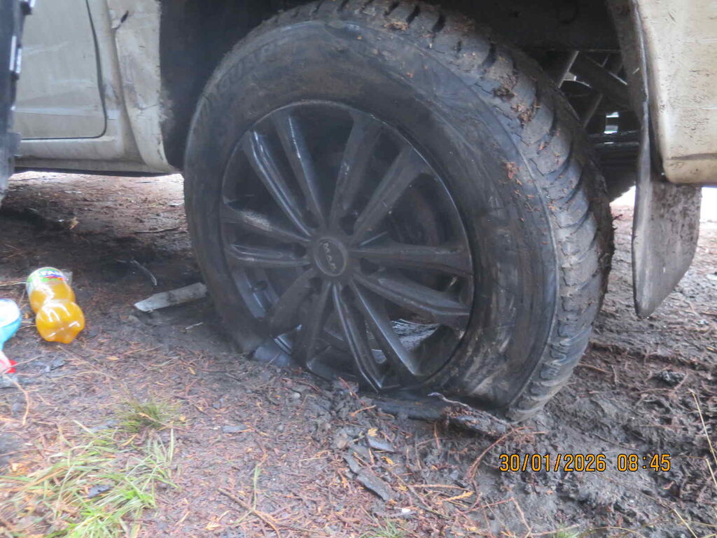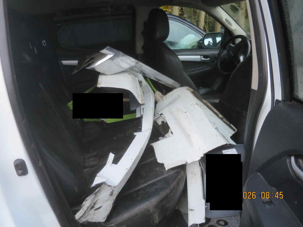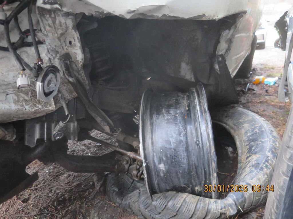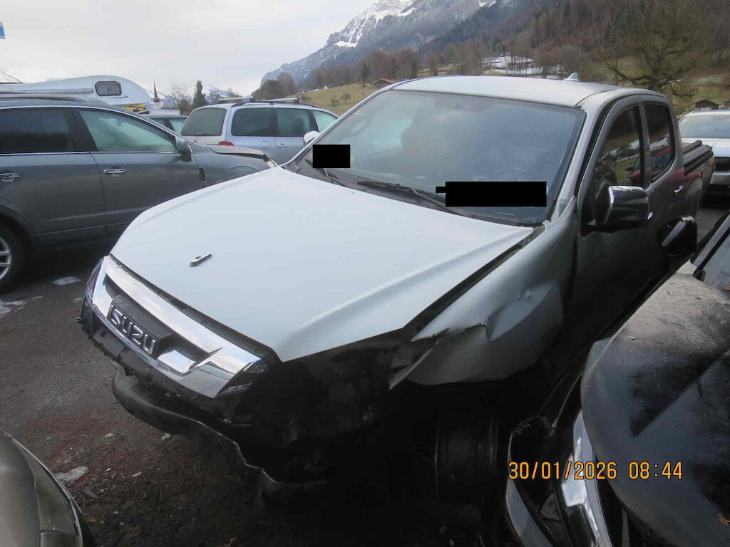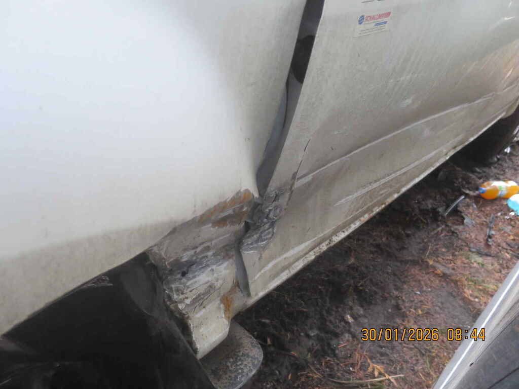 Ecke vl stark deformiert, Radaufhängung vl beschädigt, Motor unklar, komplette Seite links deformiert, Kotflügel vr und Seitenwand hr deformiert