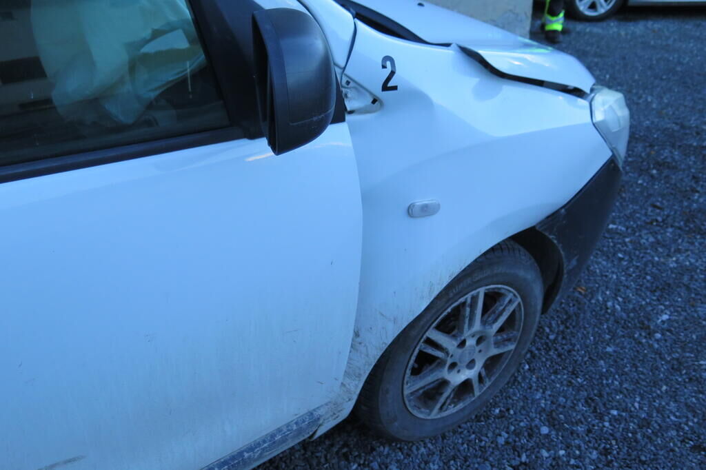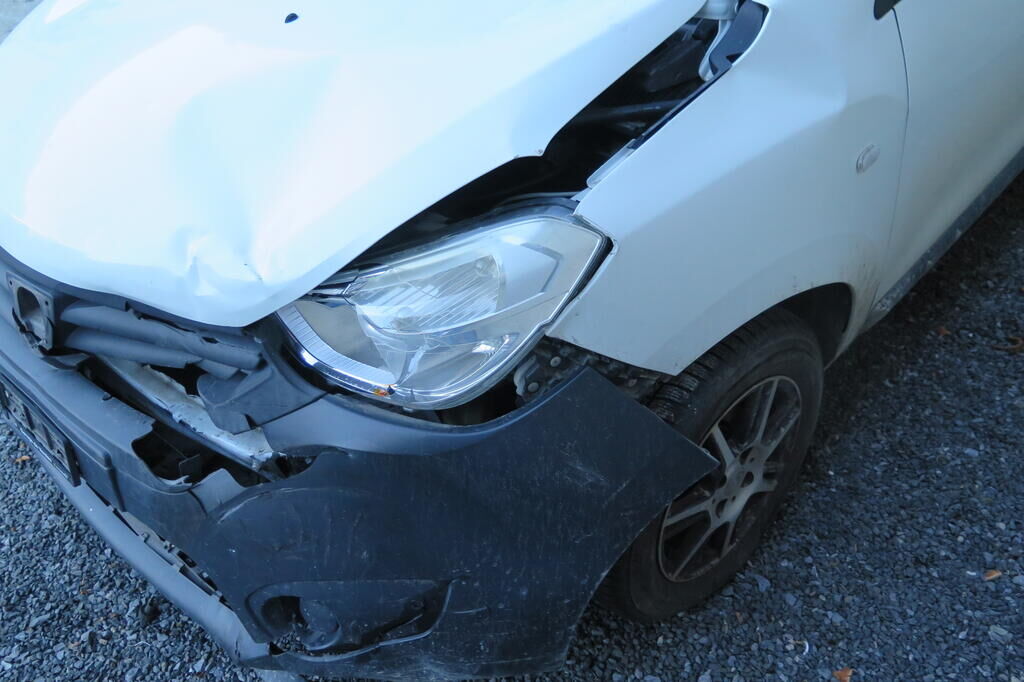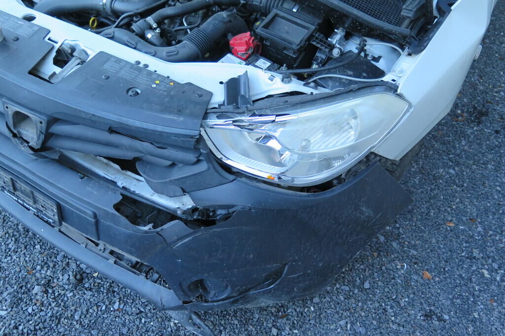 Partie avant gauche écrasée, bloc avant déporté sur la droite, train avant faussé, airbags déployés.