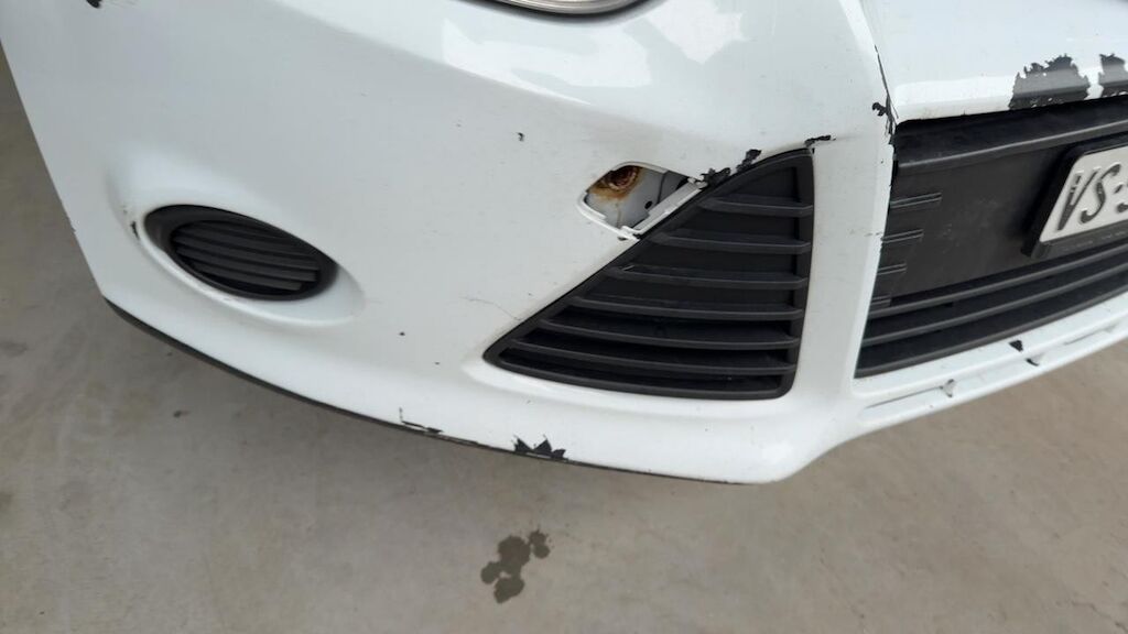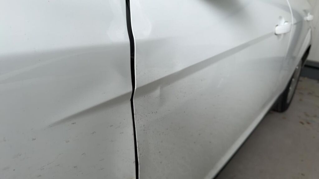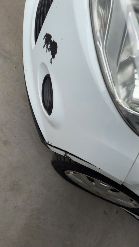 Dommage flanc avant gauche: aile porte pliées déformées embouties enfoncées endommagées, angle d’enveloppe de pare chocs cassé arraché endommagé.