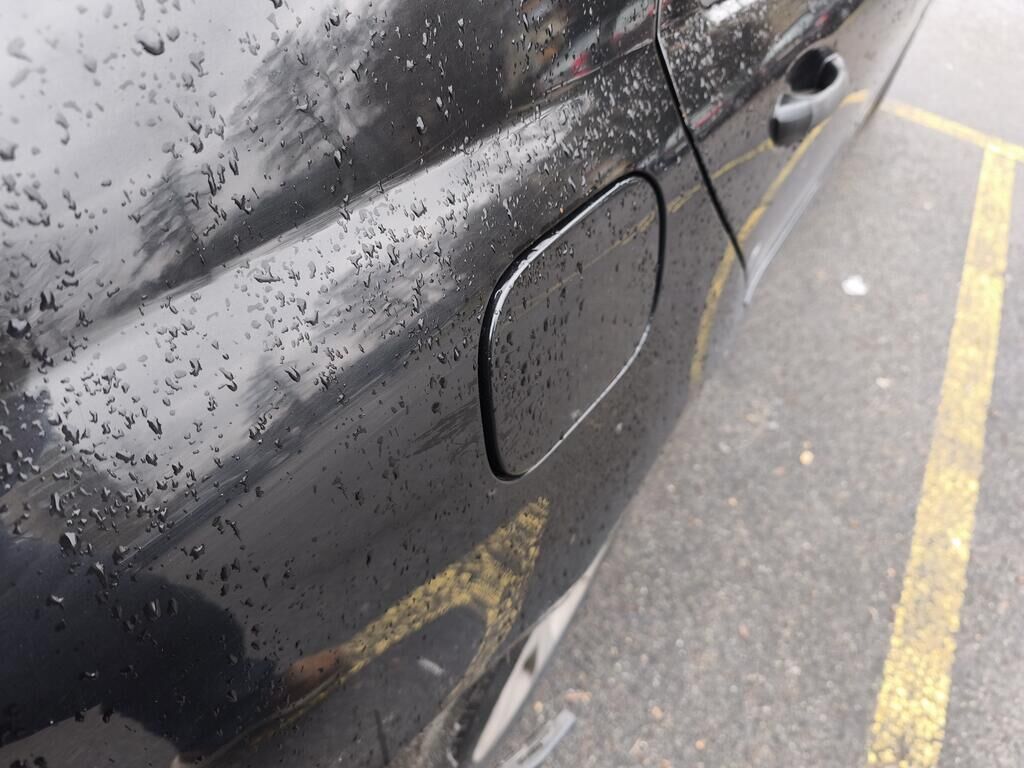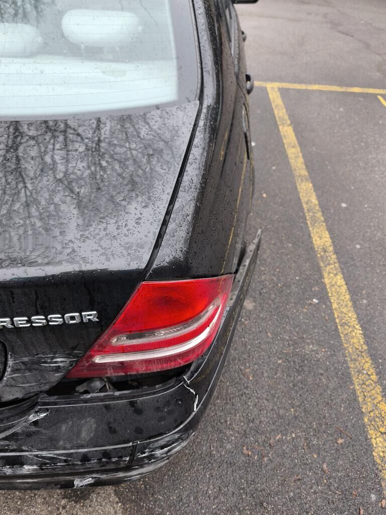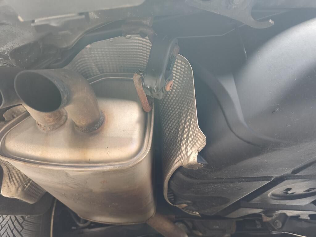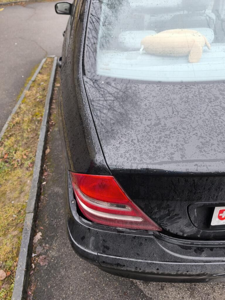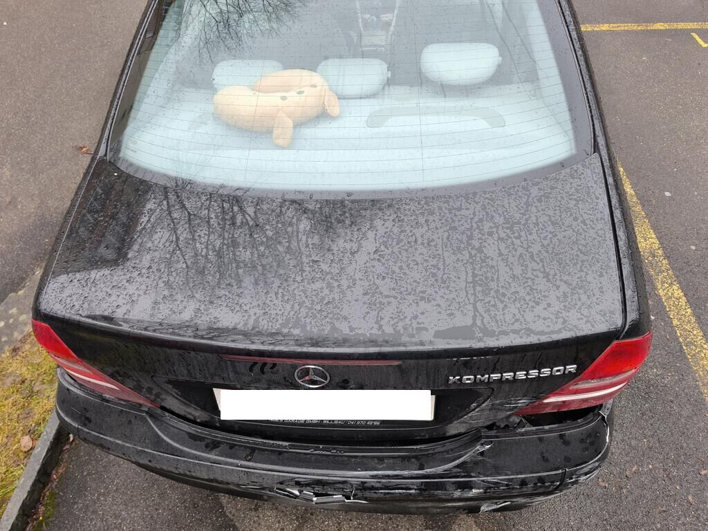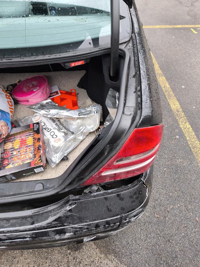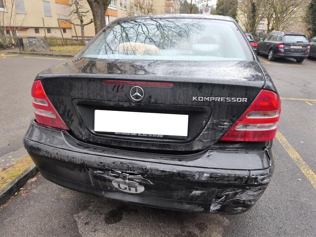 Das Heck des Fahrzeuges ist beschädigt und nach links verschoben (gestaucht)! Stossstange, Träger, Heckblech, Seitenwände, Heckdeckel und Auspuffanlage sind beschädigt worden.