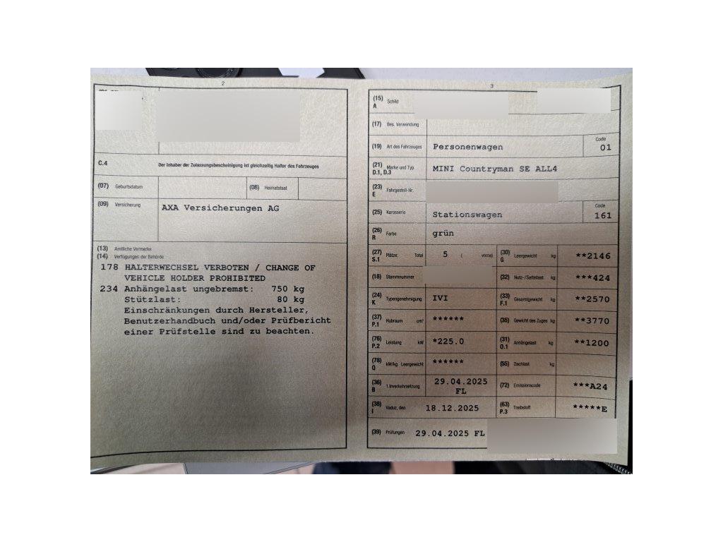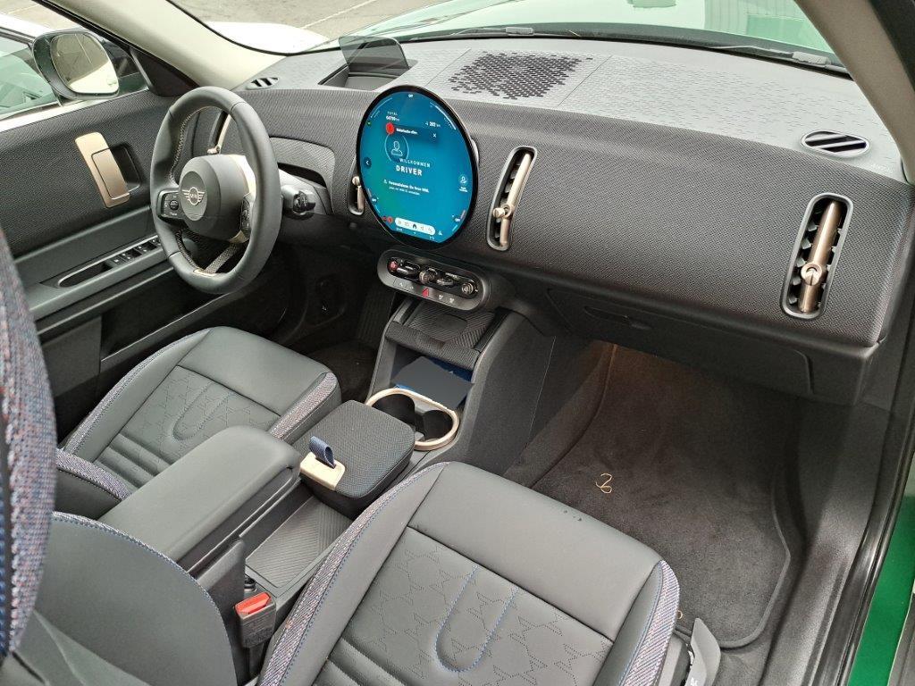 Paket: Classic Trim (Lenkrad: Lenkradheizung, Lenkrad: Sport-Lederlenkrad, Polster: Vescin-/Stoff Kombination), Sitze: Vordersitze heizbar, Innenspiegel automatisch abblendbar, Wireless Charging Ablage, Dach in schwarz, Komfortzugang beinhaltet folgende Funktionen: – schlüsselloser Zugang zum Fahrzeug – Welcome-Inszenierung ab ca. 3m Annäherung ans Fahrzeug – automatische Entriegelung bei ca. 1m Annäherung ans Fahrzeug (in Fahrzeugrichtung) – automatische Verriegelung beim Entfernen vom Fahrzeug ab ca. 2m beinhaltet den Digital Key‘ mit folgenden Funktionen: – Ver- und Entriegeln sowie Starten des Fahrzeugs unter Verwendung eines kompatiblen Smartphones – Key Card mit NFC-Technologie – digitaler Schlüssel für da, Licht: LED Scheinwerfer mit erweiterten Umfängen – Bi-LED-Licht für Abblendlicht und Fernlicht – LED-Heckleuchte – Abbiegelicht in LED-Technologie (adaptive Lichtverteilung mit erhöhter Seitenausleuchtung für Stadt-, Überland- und Autobahnverkehr, Schlechtwetter) – Drei charakteristische Licht-Signaturen (Tagfahrlicht-Signatur, Front und Heckleuchte) über Lichtmenü wählbar, inklusive dazugehöriger Welcome- und Goodbye-Inszenierung, Panorama-Glasdach – zweigeteiltes Glasdach – vordere Glashälfte anhebbar – Schiebefunktion mit programmierter Komfortposition – integrierter Windabweiser – Einklemmschutz – Komfortöffnung und -schließung über Fahrzeugschlüssel – im Innenraum zwei individuell und stufenlos einstellbare Abschattungssysteme (vorn/hinten) mit hohem Abschattungsgrad (95%), Lackierung: Metallic-Lackierung, MINI Experience Modes – Die MINI Experience Modes bieten intensive und klar differenzierte Modi, die den Gesamteindruck des MINI Innenraums verändern. Der Kunde erlebt unterschiedlich Charaktere auf verschiedenen Wahrnehmungsebenen., Alarmanlage – Inkl. Überwachung der Türen, Front- und Heckklappe, Innenraumschutz, Neigungsalarmgeber, Notstromsirene und Diebstahlsicherung., Anhängerkupplung – Betätigungsschalter im Gepäckraum – Anhängerkupplung kann elektrisch ein- und ausgeschwenkt werden – inklusive Anhänger-Stabilisierungskontrolle – Angaben zu Anhängerlast und Deichselstützlast beachten., Räder: 18″ Leichtmetallräder Asteroid Spoke – 7,5 J×18 / Bereifung 225/55 R 18, AC-Laden Professional – 22kW AC-Laden, Licht: Fernlichtassistent, Sonnenschutzverglasung – reduzierte Sonneneinstrahlung (Lichtdurchlässigkeit 20%) in Fond- und Heckverglasung – vermindert die Aufheizung des Fahrzeuginnenraums – geringere Einsehbarkeit von außen nach innen – Frontscheibe und Fahrer-/Beifahrertür-Verglasung unverändert zur Serie, Head-Up Display – Anzeige verschiedener Informationen wie Navigationsinformationen, Geschwindigkeitsbegrenzungen, Warnhinweise, etc. (ausstattungsabhängig)., Paket: Innen- und Aussenspiegelpaket – Außenspiegel mit Bordsteinautomatik (auf Beifahrerseite bei Einlegen des Rückwärtsganges) und elektrischer Anklappfunktion – Logoprojektion Außenspiegel Fahrer- und Beifahrerseite – Außenspiegel Fahrerseite mit automatischer Abblendung – Memoryfunktion, Gepäcktrennnetz