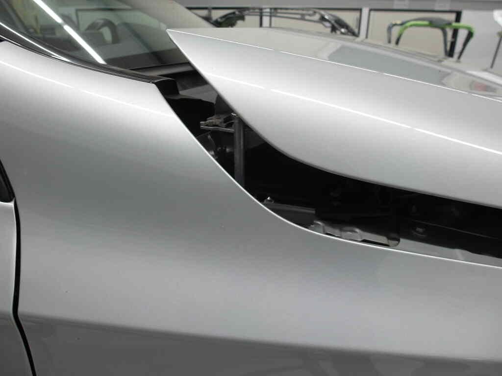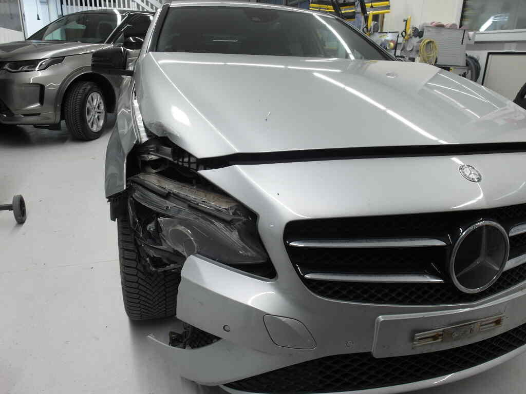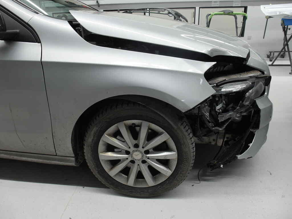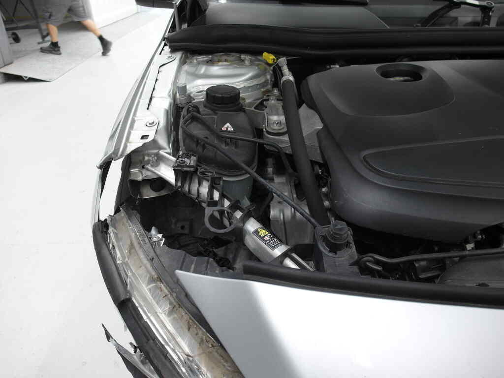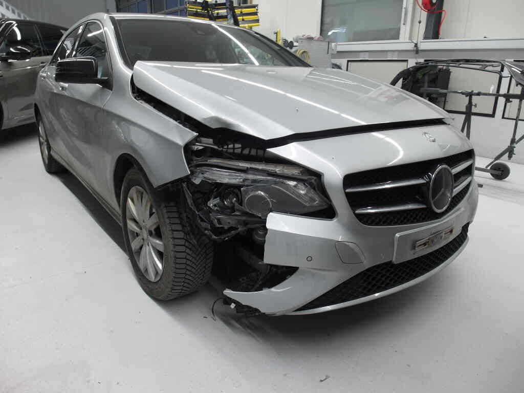 Kollision mit Pfosten, Front rechts beschädigt, Kotflügel r verformt, Deckel v verformt, Fussgängerschutz ausgelöst, Scheinwerfer r defekt, Längsträger r oben verformt, Front innen verformt