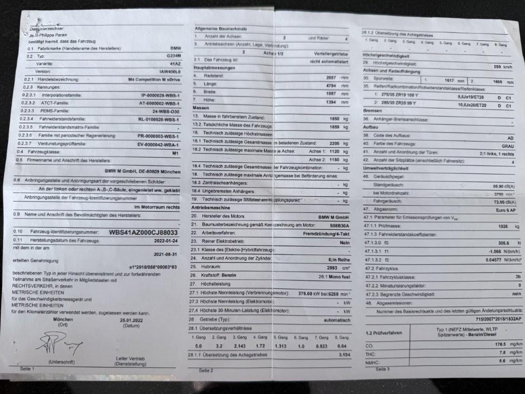 Paket: Innen- und Aussenspiegelpaket, Assist: Park Distance Control vorne und hinten, Servotronic, Media: HiFi Lautsprechersystem – Digitaler Verstärker, 205 W Verstärkerleistung 10 Lautsprecher: – 1 Mitteltöner in der Armaturentafel – 3 Hochtöner in den Spiegeldreiecken und der Instrumententafel – 4 Mitteltöner in den Türverkleidungen vorne und hinten – 2 Zentralbässe unter den Vordersitzen, Getriebe: 8-Stufen-Sportautomat Steptronic, Alarmanlage, Aussenspiegel rechts und links beheizt und elektrisch verstellbar, asphärisch gewölbtes Spiegelglas, Fahrwerk: M Sportdifferential – Aktives M Differenzial – M spezifisch abgestimmtes, elektronisch geregeltes Hinterachs-Lamellensperrdifferential mit zusätzlichen Kühlrippen an Gehäuseunterseite – vollvariable Einstellung des Sperrgrads, je nach Fahrsituation und Fahrbahnbeschaffenheit zwischen 0 und 100%. Verbesserung von Traktion, Agilität, Stabilität sowie Fahrverhalten: – Traktion: Zuweisung von ‘mehr Drehmoment’ auf das Rad mit besserer Bodenhaftung – Agilität: gesteigertes Querbeschleunigungs- und Fahrdynamikpo, Fahrwerk: Adaptives M Fahrwerk – M spezifische Regelung der Stoßdämpfer Charakteristik. Einstellbar in die Modi ‘Comfort’, ‘Sport’ und ‘Sport Plus’ – Vorderachse: M spezifische Doppelgelenk-Federbeinvorderachse – Hinterachse: M spezifische 5-Lenker-Hinterachse, BMW Garantie: BMW Service Plus – Gewährleistung und Gratis-Reparatur bis 100’000 km oder 3 Jahre. Es gilt das zuerst Erreichte – Verschleissreparaturen, wie Ersatz von Bremsbelägen und Bremsscheiben, sowie sonstige Reparaturen übernehmen wir mit BMW Originalteilen während 100’000 km oder 3 Jahren. Zudem profitieren Sie von bis zu sechs saisonalen Räderwechseln (zwei pro Jahr) und dem Austausch der Wischerblätter. – Gratis-Service bis 100’000 km oder 10 Jahre. Es gilt das zuerst Erreichte,, Elektrische Fensterheber vorne, Warndreieck, Start-/Stop-Knopf, Licht: Nebelschlussleuchte, Lenkrad: Lenkrad längs- und höhenverstellbar, Dach in CFK Optik, Ambientes Licht – Mit Ambiente-Lichtdesigns – Umfasst 11 vordefinierte wählbare Lichtdesigns in 6 Farben (Orange, Grün, Blau, Flieder, Bronze und Weiss) – Ambiente Wasserfallbeleuchtung – Ambiente Fussraumbeleuchtung – Ambiente Kartentaschenbeleuchtung – Ambiente Ablagefachbeleuchtung der Mittelkonsole – Konturbeleuchtung in Instrumententafel und Türverkleidung – Ambiente Türöffnerbeleuchtung, Intelligenter Notruf, Sitze: M Sportsitze vorne, Auto Start Stop Funktion, Airbag: Airbag Fahrer und Beifahrer, M Hochglanz Shadow Line mit erweiterten Umfängen – Außenspiegelkappen und Heckspoiler in Schwarz Hochglanz – Endrohrblenden in Schwarzchrom, Elektronische Wegfahrsperre, Scheibenwaschdüsen beheizt, Schaltpunktanzeige, Parkbremse, elektromechanisch, Leuchtweitenregulierung, Innenspiegel, automatisch abblendend Abblendsteuerung mittels eingebauter Sensorik, die das von hinten einfallende Licht misst und bei berechneter Blendung den Innenspiegel entsprechend abblendet, Media: Freisprecheinrichtung mit USB-Schnittstelle, Innenbeleuchtung, Paket: Connected Package Professional, Räder: Radschraubensicherung, Media: DAB+ Tuner, BMW Garantie: Repair Inclusive – 3 Jahre/100.000 km Gültigkeit: 3 Jahre oder 100.000 Kilometer – es gilt das zuerst Erreichte, Antiblockiersystem (ABS), Media: BMW Live Cockpit Professional – Anzeigeverbund bestehend aus einem volldigitalem 12,3″ Instrumentendisplay und einem hochauflösendem 10,25″ Control Display – BMW Operating System 7, Navigationsfunktion – Intuitive Bedienmöglichkeiten wahlweise über den BMW Intelligent Personal Assistant – Persönliches Nutzerkonto Vierfach-Tuner mit Diversity-Empfang, RDS und TMC – 2 USB-Anschlüsse zum Laden und zur Übertragung von Daten, Bluetooth/WiFi-Schnittstelle – 4G LTE Connectivity: festverbaute SIM-Karte mit 4G Netz, Active Guard, Sitze: Sitzheizung für Fahrer und Beifahrer, Katalysator geregelt, 3-Punkt-Sicherheitsgurte auf allen Plätzen, Airbag: Airbag Beifahrer deaktivierbar, Räder: Reifendruck-Kontrollanzeige, Media: ConnectedDrive Services, Lenkrad: M Lederlenkrad, Klima: Klimaautomatik – 3-Zonen-Klimaautomatik mit erweiterten Umfängen – Beschlag- und Solarsensor – Aktivkohlefilter für Frisch- und Umluft – Standlüftung mit Timer und Direktbetrieb – Digitales Display Mittelkonsole hinten, Lenkrad: Multifunktionslenkrad, Speed Limit Info, Airbag: Seitenairbag für Fahrer und Beifahrer, Regensensor, M Drive Professional – M Track Mode – M Laptimer – M Traction Control (10-stufig) – M Drift Analyser, Licht: Begrüssungslicht, Paket: Ablagenpaket Innenraum: Klappfach Instrumententafel unten, Fahrerseite Gepäckraum: – Trennetz an Seitenverkleidung links/rechts – Taschenhaken beidseitig im Gepäckraum – zusätzliche 12V Steckdose, Assist: Crash-Sensor, Sitze: Lordosenstütze für Fahrer und Beifahrer – Verstellung von Höhe und Tiefe in der Rückenlehne, Assist: Geschwindigkeitsregelung mit Bremsfunktion Geschwindigkeitsregelung ab ca. 30 km/h auch bei Bergabfahrten durch zusätzlichen Bremseingriff, Bedienung über Multifunktionslenkrad, Anzeige der Wunschgeschwindigkeit und des Betriebsmodus in der Instrumentenkombination, Fahrer kann Funktion jederzeit übersteuern., Räder: Reifen Pannen Anzeige, Getränkehalter, Dekor: Interieurleisten schwarz hochglänzend mit Akzentleisten Perlglanz Chrom, Seitenaufprallschutz, Einstiegsleisten, BMW Mobile Care – BMW Mobile Care: Pannen- und Unfallhilfe – Die BMW Pannen- und Unfallhilfe ist an 365 Tagen im Jahr rund um die Uhr im In- und Ausland für Sie da und das bis zu fünf Jahre nach der Erstzulassung Ihres Fahrzeugs., Sitze: Durchladesystem, Licht: Heimleuchten, Dynamische Stabilitäts Control (DSC) mit erweiterten Umfängen, Kennzeichenbeleuchtung in LED, Polster: Leder Merino mit erweiterten Umfängen Schwarz, Räder: 19″/20″ M Schmiederäder Doppelspeic