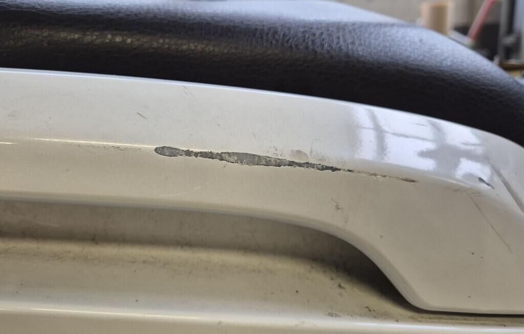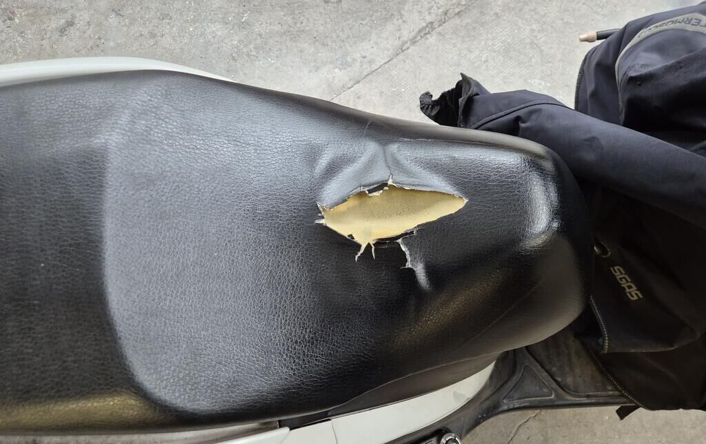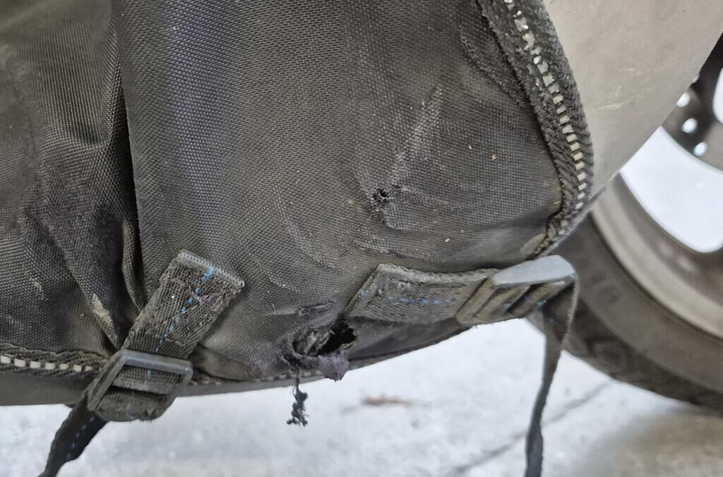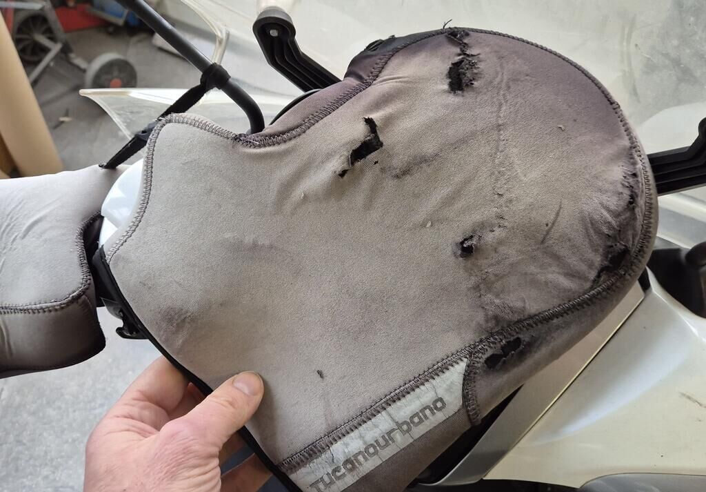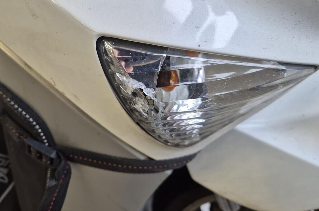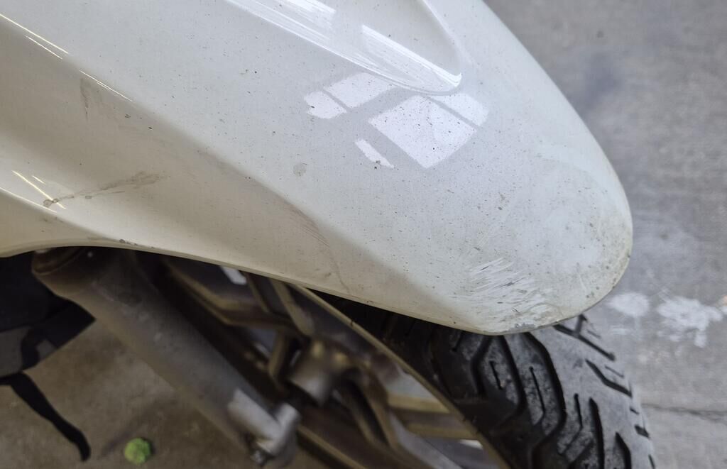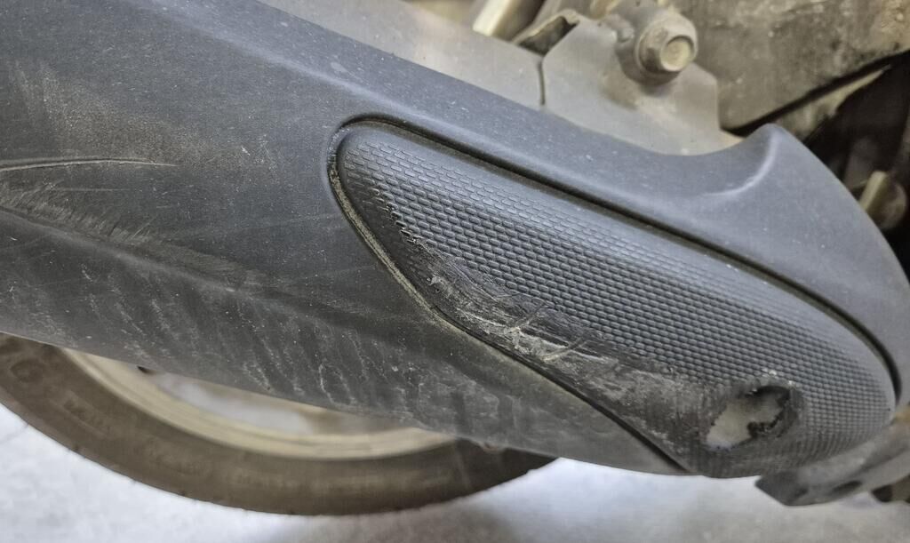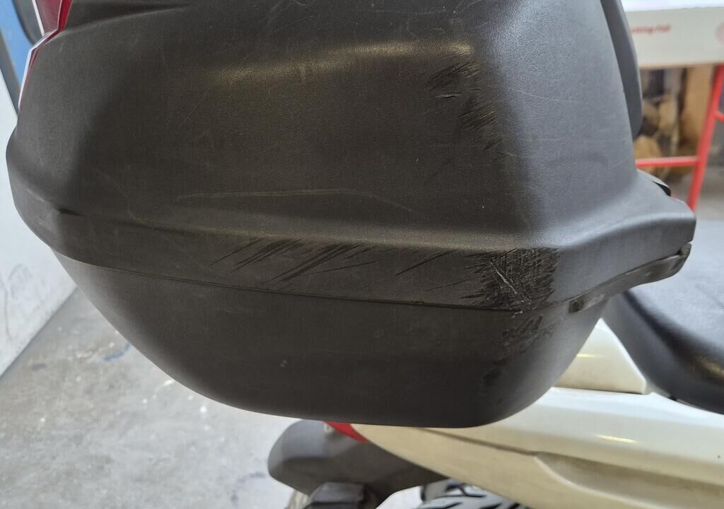 Garde-boue avant, clignoteur avant, carénage avant, bas de caisse, couverture thermique, pare-brise, top case, poignée passager, écran thermique échappement; endommagés.