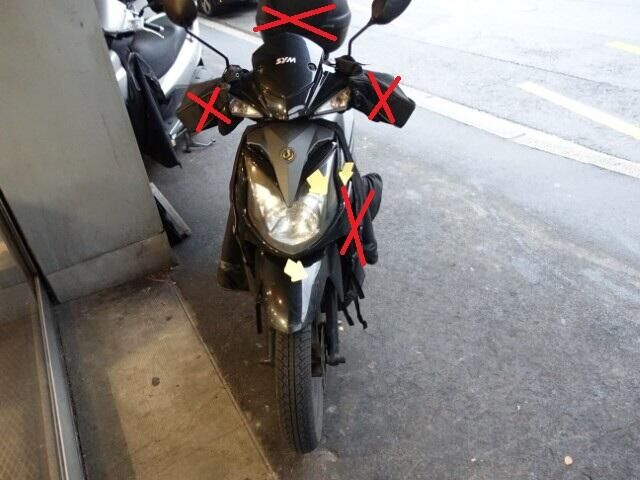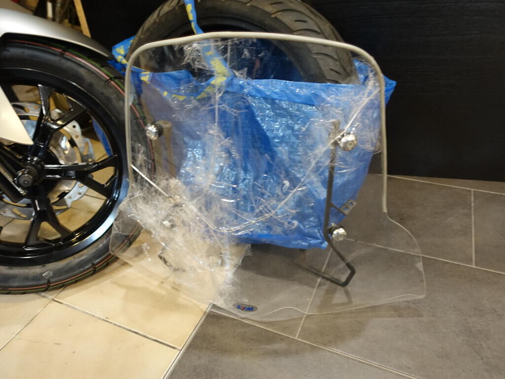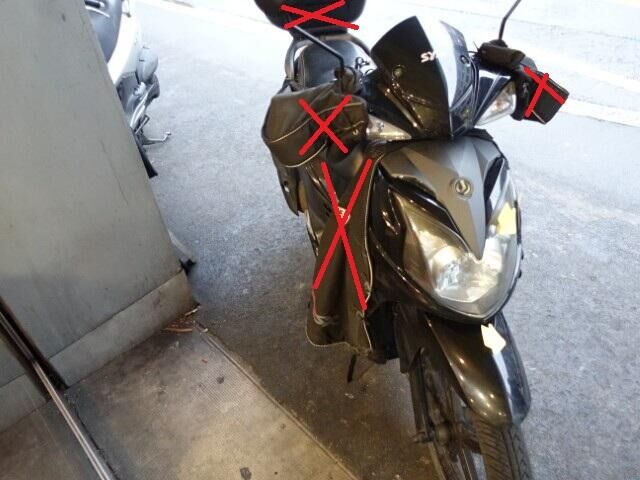 Pare-brise – Guidon – Carénage AV – Garde boue AV – Phare – Rétroviseur D – Aile AR G.