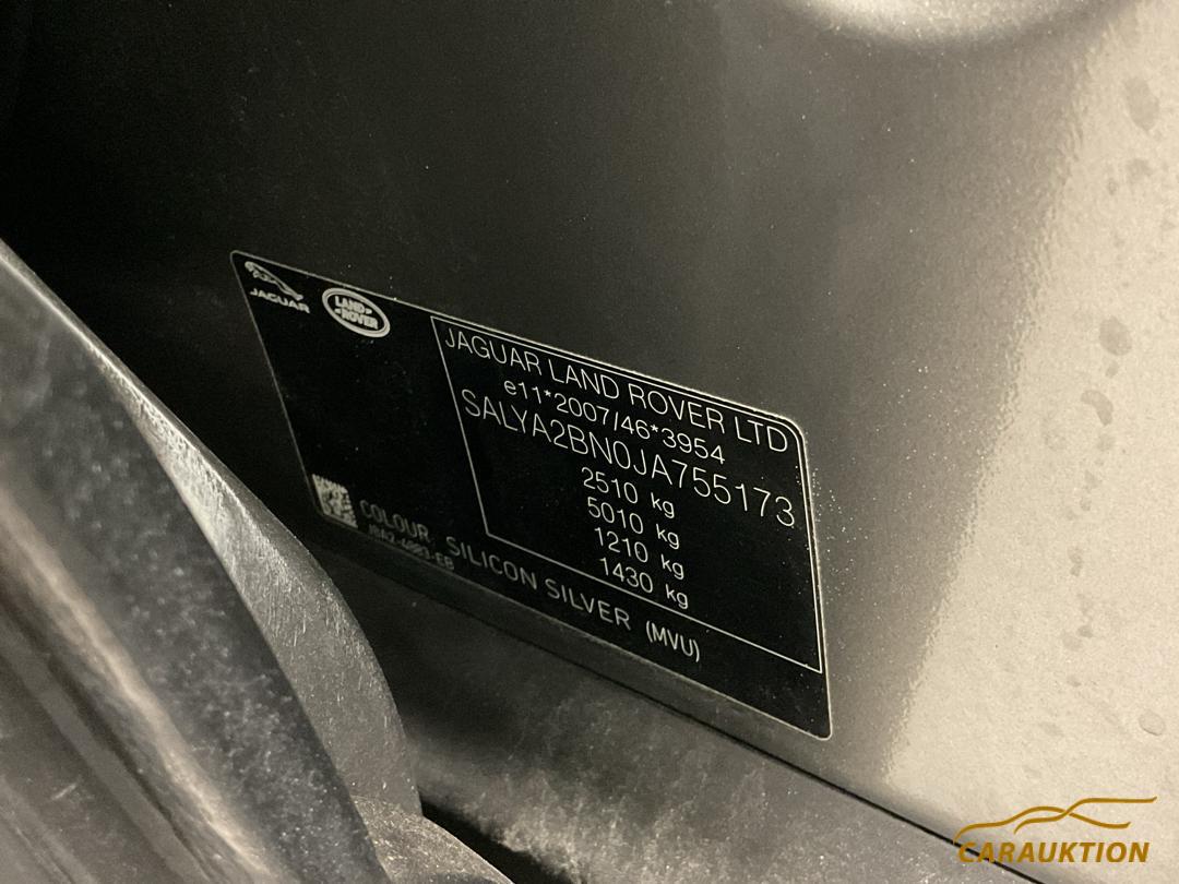 Navigation Pro, Notbrems-Assistent, Terrain Response, Airbag Fahrer und Beifahrerseite, InControl Apps, Heckklappe elektrisch mit Freihandfunktion, Keine Gewähr auf die Angaben der Serienausstattungen, Ledersitze, Seitenairbag Fahrer und Beifahrerseite, Dieselpartikelfilter, Servolenkung elektrisch, Pedale in Edelstahl, Alarmanlage, Lenkrad-Wippenschaltung in Chromoptik, ABS Antiblockiersystem, Stop + Start System, Knieairbag Fahrer, Park Distance Control hinten, Rückfahrkamera, Zwei Zonen-Klimaautomatik, Meridian Sound System, Spurverlassenswarnung, Isofix-Kindersitzbefestigung, Pro Service WiFi, Berganfahrhilfe, HDC Hill Descent Control/ Bergabfahrkontrolle, TCS Elektronische Traktionskontrolle, EBD Elektronischer Bremskraftverteiler, InControl Remote, Dachhimmel schwarz/ Stoff, Geschwindigkeitsregler und – begrenzer, Regensensor, Windowbags vorne + hinten, Aussenspiegel el.verstell-heiz-anklappbar/abblendbar, DSC Dynamische Stabilitäts-Control, Free Service 4 Jahre/ 100’000 km, Elektronische Parkbremse, LED-Scheinwerfer mit Waschanlage, CBC Kurvenbremskontrolle, Aluminiumdekor, Reifendruck-Sensoren TPMS, Bluetooth-System, Reifen-Reparatur Set, Rücksitzbank im Verhältnis 40/20/40, Adaptives variables Fahrwerk, Innenspiegel automatisch abblendbar