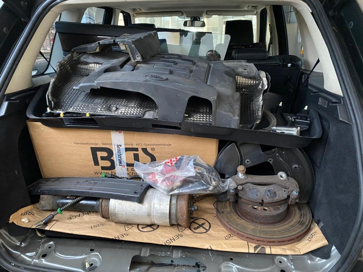Leichtmetallräder 15 Speichen 20J, Antriebsschlupfregelung (ASR), Alcantara-/Leder-Ausstattung, Licht: Nebelschlussleuchte, Antiblockiersystem (ABS), Bremsassistent (BAS), Abbiegelicht, Licht: Fahrlichtautomatik, Armlehnen vorne, Dachspoiler, Innenspiegel automatisch abblendbar, Radiovorbereitung, Antenne, Entstörung und 8 LS, Scheibenwaschdüsen beheizt, Sitze: Rücksitzlehne geteilt abklappbar, Airbag: Seitenairbag für Fahrer und Beifahrer, Bi-Xenon-Scheinwerfer inkl. Reinigungsanlage, Tageskilometerzähler, Assist: Bergabfahrhilfe (Hill Descent Control, HDC), iPod + USB Anschluss, Lenkrad: Multifunktionslenkrad in Leder, Airbag: Window-Kopfairbags, Start-/Stop-Knopf, Reduktionsgetriebe, Lenkrad längs- und höhenverstellbar, Drehzahlmesser, Sperrdifferential, Harman/Kardon-Soundsystem, Elektronisch geregelte Luftfederung, Partikelfilter und Oxydationskatalysator, Airbag: Airbag Fahrer und Beifahrer, Beide Make up-Spiegel beleuchtet, Niveauregulierung automatisch, Regensensor für Scheibenwischer vorne, Wegfahrsperre elektronisch, Holzapplikationen Walnuss, Verbundglasseitenscheiben, Elektrische Fensterheber vorne + hinten, Kopfstützen hinten höhenverstellbar, Teppichfussmatten, Aussenspiegel rechts und links beheizt, elektrisch verstell- / und einklappbar, Vordersitze elektrisch verstellbar mit Memory, inkl. Lenksäule und Aussen- spiegel, Getönte Scheiben, Klimatisierungsautomatik, Park Distance Control vorne und hinten, Sitze: ISOFIX Kindersitzvorrichtung, Seitenaufprall-Schutzsystem, Einstiegsschienen, Dynamische Stabilitätskontrolle (DSC), DVD-Navigationssystem Touchscreen, Assist: Rückfahrkamera, Steckdose, 6-Stufen-Automat Command Shift, Laderaumabdeckung, Nebelscheinwerfer, Frontscheibe Verbundglas, Gurtstraffer vorne, Bordcomputer, Höhenverstellbare Gurten vorne, Licht: Drittes Bremslicht, 3-Punkt-Sicherheitsgurte auf allen Plätzen, Frontscheibenheizung, Kreuzstütze für Fahrersitz elektrisch verstellbar, Radio/CD-Player, Kopfstützen vorne höhenverstellbar, Scheibenwischer vorne mit Intervall, Leuchtweitenregulierung automatisch, Zentralverriegelung mit Fernbedienung, Assist: Elektronische Parkbremse, Diebstahlwarnanlage, Vorder- und Rücksitze heizbar, Servolenkung, Heckscheibenheizung, Tempomat, Notrad, Allradantrieb permanent, Wassertemperaturanzeige, Cupholder vorne und hinten
