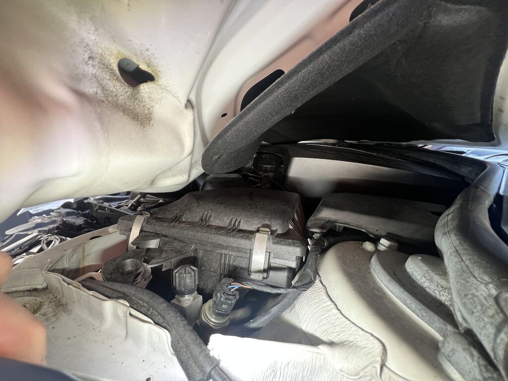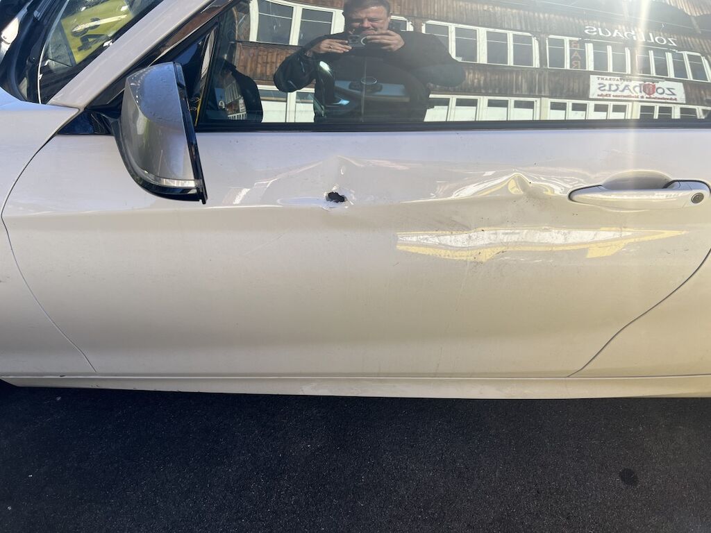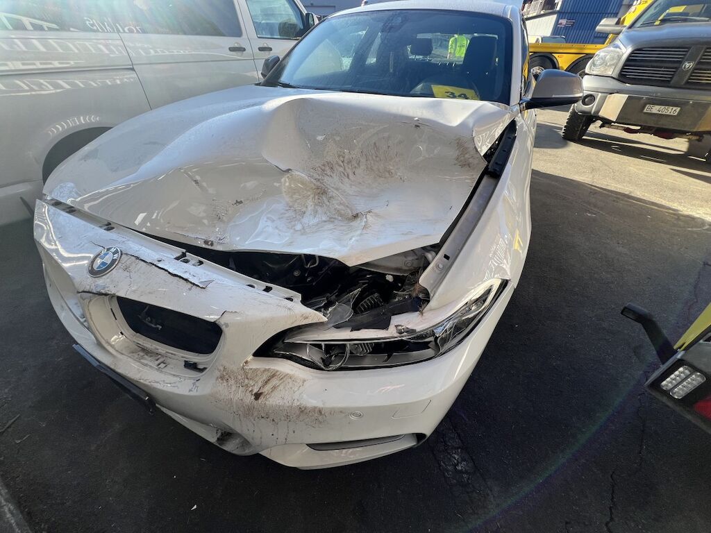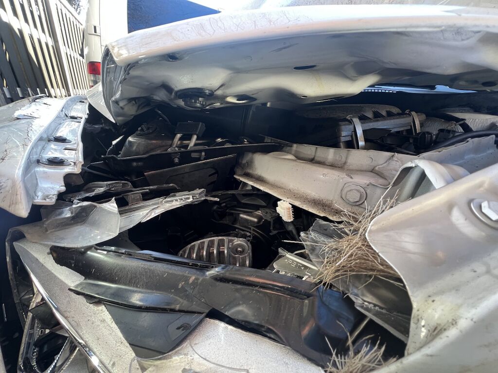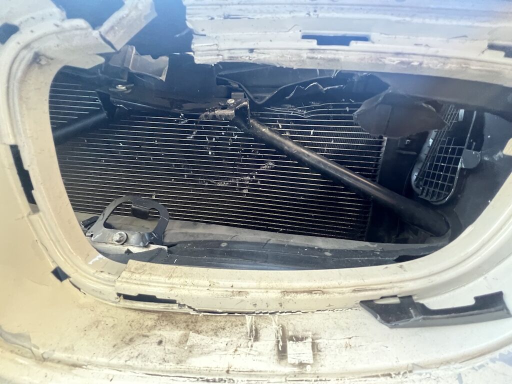 Front mit Anbauteilen eingedrückt und aufgestaucht. Scheinwerfer und div. Anbauteile gebrochen. Frontträger und Frontmaske nach innen gedrückt. Div. Luftführungen, Kondensator, Kühler, Lüfter, Luftfiltergehäuse, etc. beschädigt. Beide Kotflügel def. Türe und A-Spiegel v.l. beschädigt. Motor läuft, hat aber Kontakt mit Fremdteilen. Kl. Risiko.