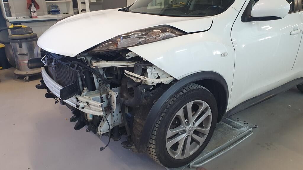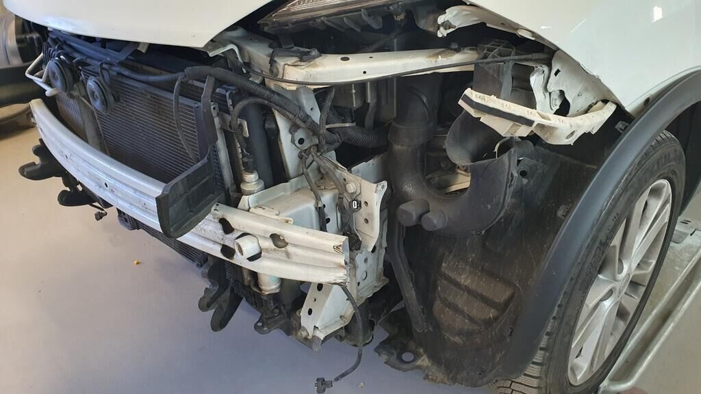 Bloc avant décalé sur la droite, pare-chocs avant, renfort, aile avant gauche, longerons endommagés