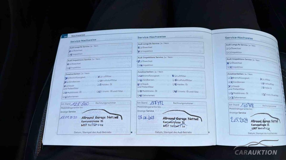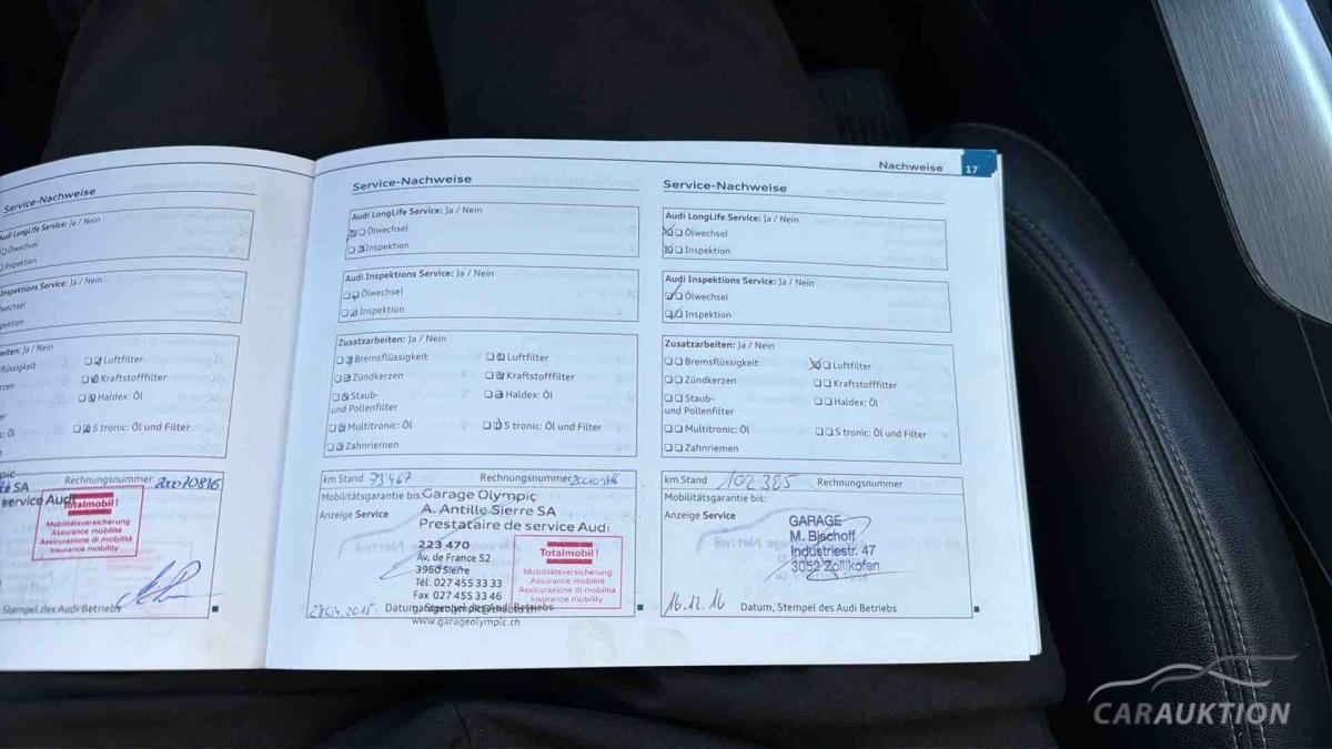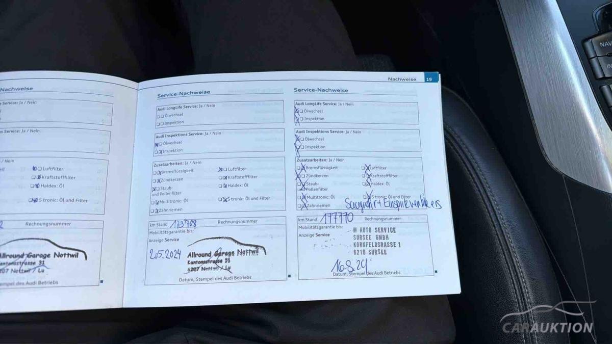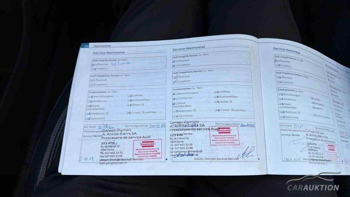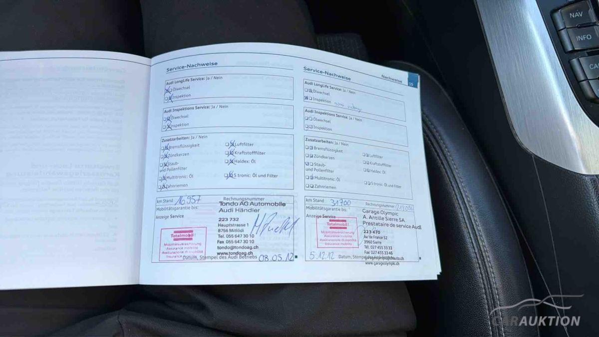 Audi music interface, Außenspiegel elektr. verstell- und heizbar, beide, Dachreling, Einparkhilfe vorn und hinten, optisch (APS Plus), Fahrassistenz-System: Licht- und Regensensor und Fernlichtassistent, Fahrer-Informations-System (FIS) mit Farbdisplay, Geschwindigkeits-Regelanlage (Tempomat), Innenspiegel mit Abblendautomatik, Komfort-Klimaautomatik 3-Zonen, Lenkrad (Sport/Leder – 3-Speichen) mit Multifunktion, Licht-Paket, Mittelarmlehne vorn, Multi-Media-Interface MMI Navigation, Perleffekt-Lackierung, Reserverad als Notrad, Servolenkung elektronisch gesteuert, Sitzheizung vorn, Sound-System DSP / Audi Sound-System, Sport-Fahrwerk, Xenon-Scheinwerfer Plus (Abblend- und Fernlicht), Bluetooth Schnittstelle, MMI Navigation, Fahrerinformationssystem mit Farbdisplaymit Effizienzprogramm