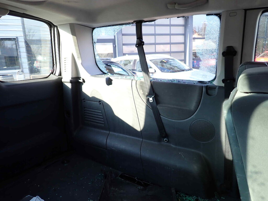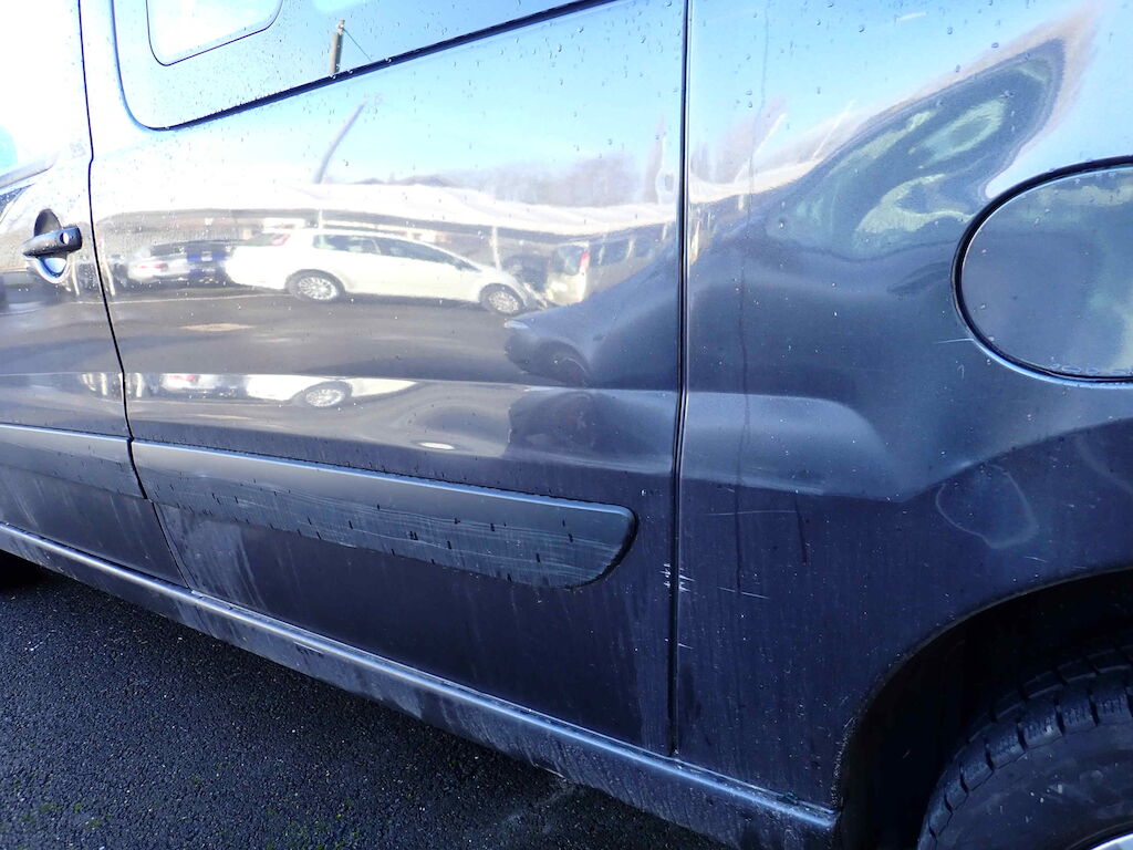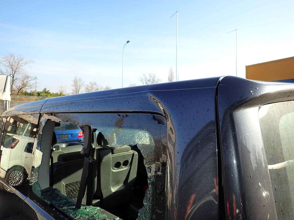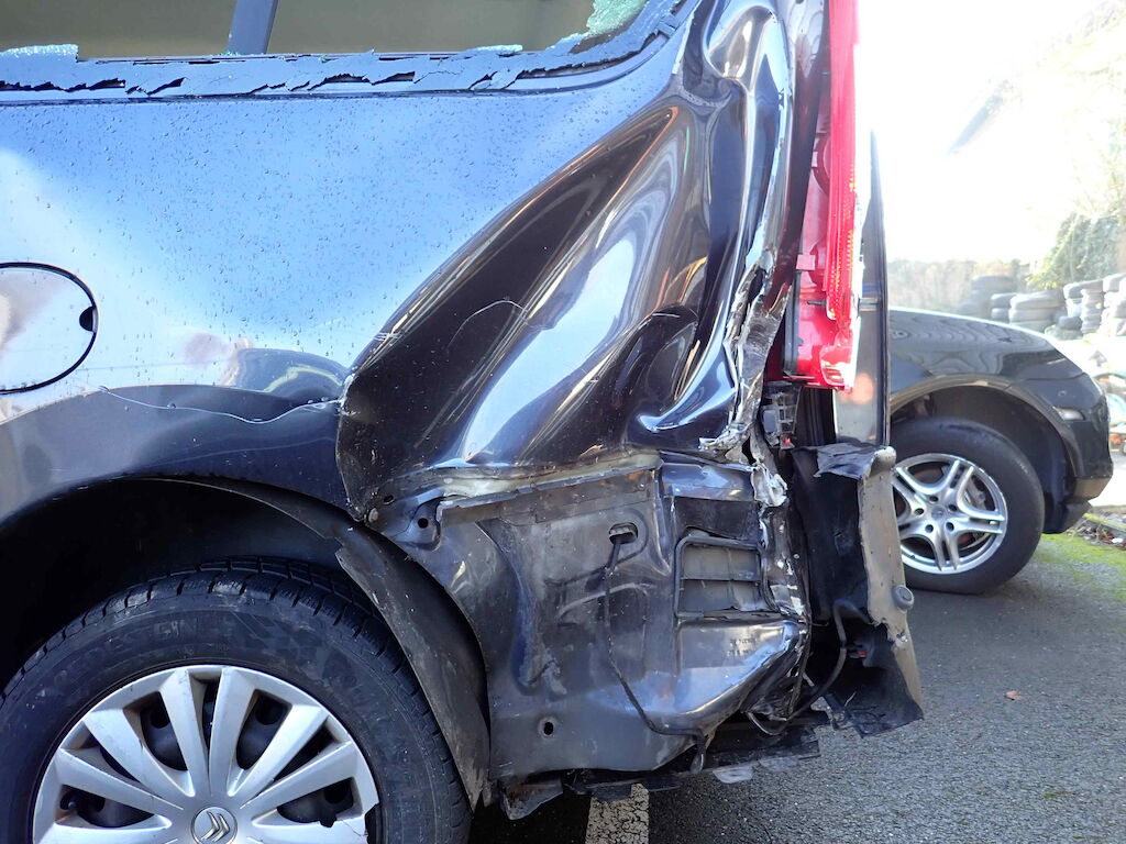 Choc arrière gauche: pare-chocs, capteur de parc, feu, tôle de fermeture, montant, panneau latéral arrière, panneau latéral central, vitre latérale arrière, hayon, enjoliveur de roue, endommagés.