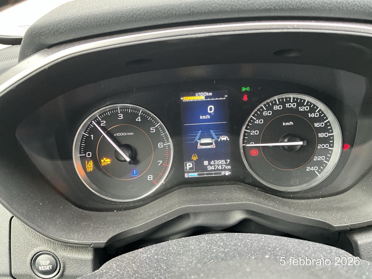 Dachreling, Katalysator geregelt, Airbag: Airbag Fahrer und Beifahrer, Servolenkung, 12-Volt-Steckdose vorne, Lenkrad: Lenkrad längs- und höhenverstellbar, Licht: Nebelscheinwerfer, Assist: EyeSight Fahrerassistenz-System: Adapt.Tempomat,Spurhalte-,Spurleit-,Not- brems-,Kollisionschutz-,Anfahr-/Assisten, Dunkel getönte Seitenscheiben hinten, Seitenaufprall-Schutzsystem, Cupholder, Pollenfilter (Staubfilter), Heckscheiben-Wisch-/Waschanlage mit Intervall, Scheinwerfer-Waschanlage, Getönte Scheiben, Blinker in Aussenspiegel, 12-Volt-Steckdose hinten, Aussentemperaturanzeige, Assist: Totwinkel-Assistent, Innenspiegel automatisch abblendbar, Klima: Fussheizung (vorne, hinten), Laderaumabdeckung, Gurtkontrolle, Ablagefach, Licht: LED-Abbiegelicht, Lenkrad: Lenkrad-Wippschaltung (Paddles), Räder: Reifendruck-Kontrollanzeige, Media: Navigationssystem, Stopp-/Start-System, Licht: Tagfahrlicht, Klima: Individuell einstellbares Heiz-/ Frischluft-System, Airbag: Window-Kopfairbags, Licht- und Regensensor, Assist: Querverkehrsassistent hinten, Assist: Bremsassistent (BAS), Klima: 2-Zonen-Klimaautomatik, Multifunktionsanzeige, Radiovorbereitung, Dachantenne und, Zentralverriegelung mit Fernbedienung, Aktive Kopfstützen, Touchscreen, Pedalerie mit Aluminiumauflage, Airbag: Knie-Airbag für Fahrer, Licht: Nebelschlussleuchte, 4 Leichtmetallfelgen 18J mit Pneu, Digital Uhr, Media: USB+AUX-Anschluss, Kopfstützen vorne höhenverstellbar, 3-Punkt-Sicherheitsgurte auf allen Plätzen, ABS, EBD elektronische Bremskraftverteilung, Sitze: Fahrersitzhöhen- und Neigungsverstellung, Keyless Entry / -Start, Licht: Fernlicht-Assistent, Reifenpannen-Kit, ISOFIX Kindersitzvorrichtung, Scheibenwischer-Enteiser, 4 Scheibenbremsen, Assist: Berganfahrhilfe (Hill Holder), Polster: Stoff-Ausstattung, Airbag: Seitenairbag für Fahrer und Beifahrer, Elektronisches Stabiliäts-Programm (VDC), Tankdeckel-Entriegelung von innen, Media: Bluetooth Freisprecheinrichtung, Sitze: Vordersitze heizbar, Lenkrad: Multifunktionslenkrad, Elektrische Fensterheber vorne + hinten, Wegfahrsperre elektronisch, Höhenverstellbare Gurten vorne, Radio CD, MP3 und WMA, Hill Descent Control (HDC), Gurtstraffer mit Gurtkraftbegrenzer, Frontspoiler, DAB+ (Digital Audio Broadcasting), Licht: Drittes Bremslicht, Drehzahlmesser, Tageskilometerzähler, Lackierung: Uni-Lackierung, Lenkrad: Lenkrad und Schalthebelgriff in Leder, Allradantrieb permanent, Aussenspiegel rechts und links beheizt, elektrisch verstell- / und einklappbar, 6 Lautsprecher, Assist: Rückfahrkamera mit Monitor, Scheibenwischer vorne mit Intervall, Getriebe: 7-Stufen-Automat CVT sequentiell, Sitze: Rücksitzlehne geteilt abklappbar