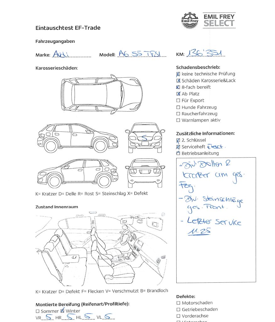 | Keine Gewähr auf die Angaben der Sonder- und Serienausstattung / keine mechanische Prüfung. Fahrzeug wurde unzerlegt expertisiert / keine Haftung für allfällige, nach Demontage bekanntwerdenden Mängel. Fahrzeugbereifung und Ausstattung gemäss Fotos / Fahrzeugkauf auf eigenes Risiko ab Platz ohne Nachwährschaft. – Div. Dellen und Kratzer am gesamten Fahrzeug. – Div. Steinschläge an ges. Front. – Letzter Service 11.2025 |