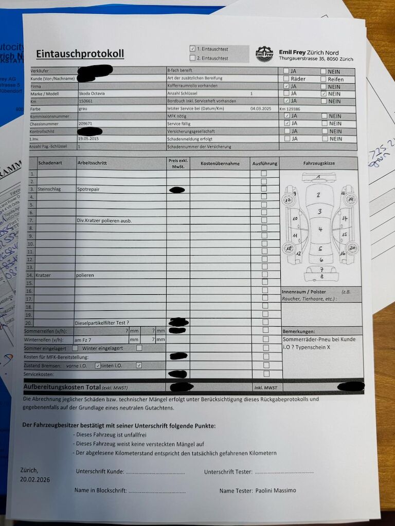 | Keine technische Prüfung (Werkstatttest) vorgenommen Diverse Schäden an Karosserie/Lack. Fahrzeug ab Platz, ohne Garantie und Aufbereitung. DPF/FAP Filter nicht kontrolliert Keine Gewähr auf die Angaben der Sonder- und Serienausstattung / keine mechanische Prüfung. Fahrzeug wurde unzerlegt expertisiert / keine Haftung für allfällige, nach Demontage bekanntwerdenden Mängel. Fahrzeugbereifung und Ausstattung gemäss Fotos / Fahrzeugkauf auf eigenes Risiko ab Platz ohne Nachwährschaft. – Div. Kratzer am Fahrzeug – Steinschlag auf der Frontscheibe |