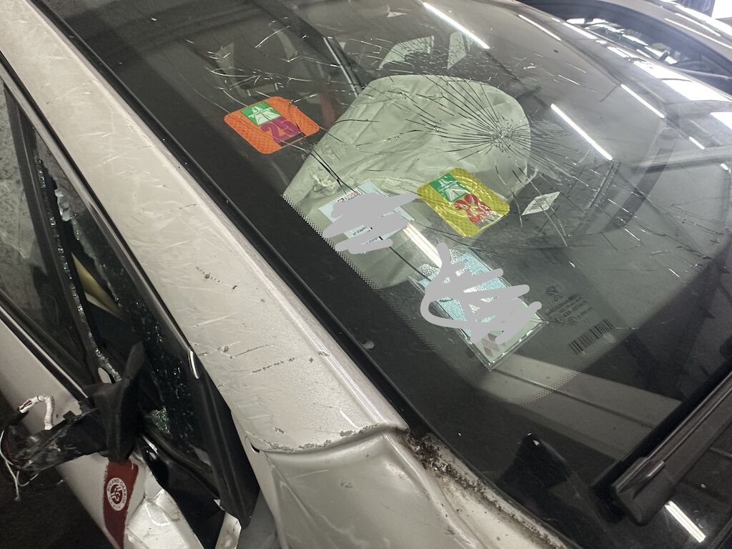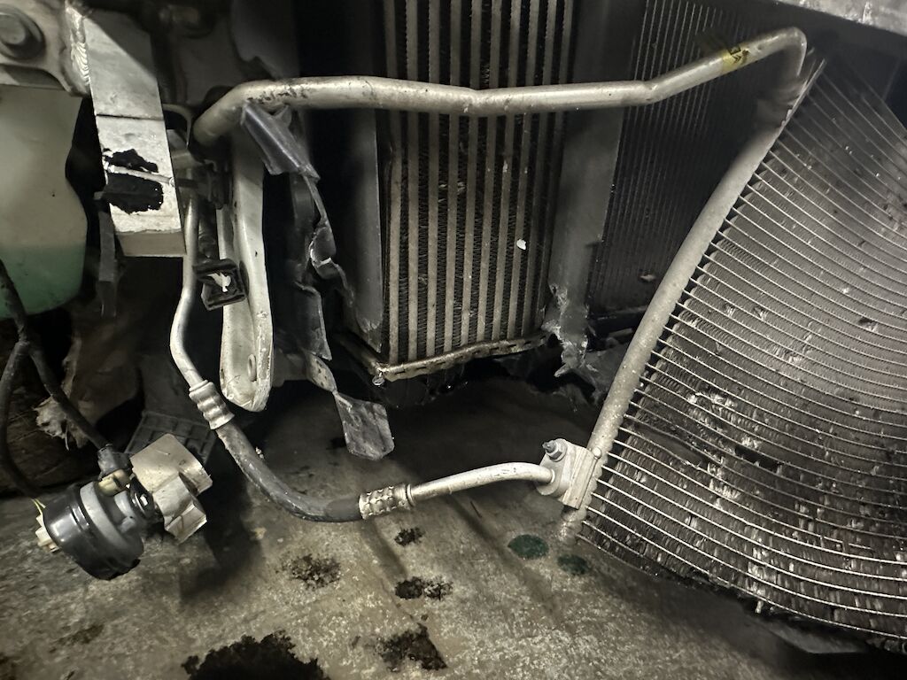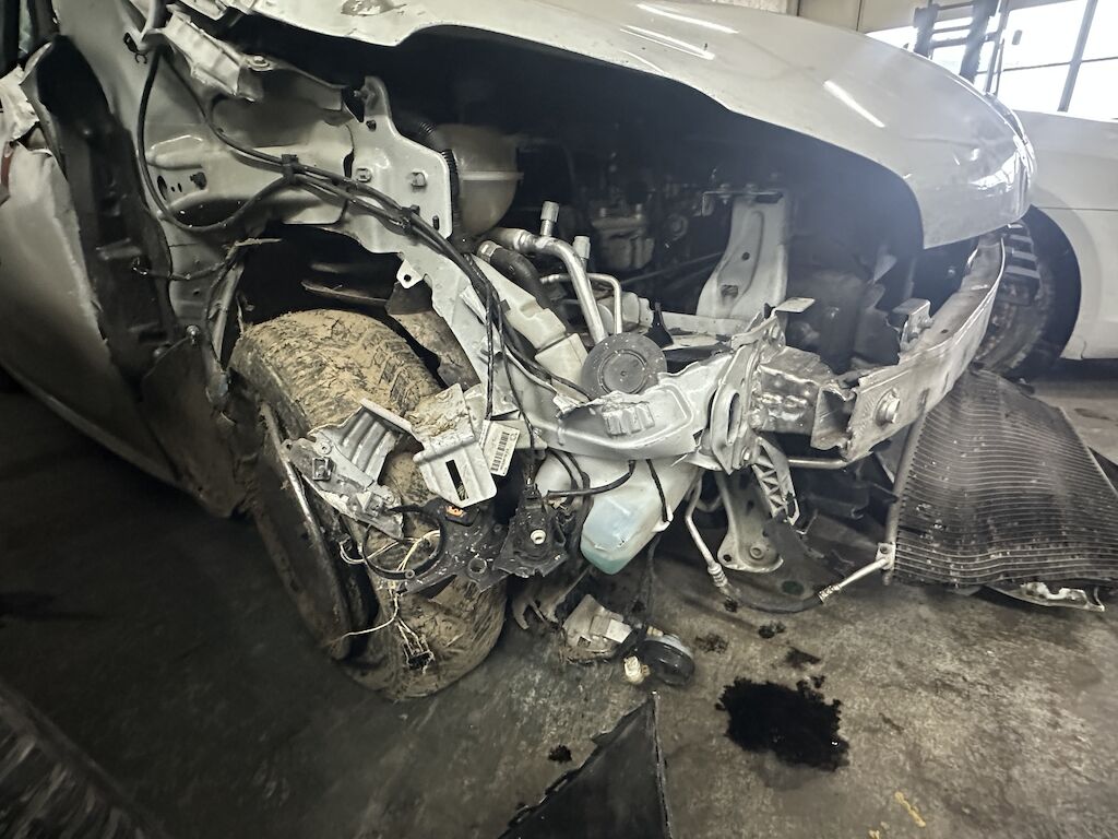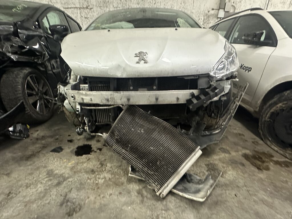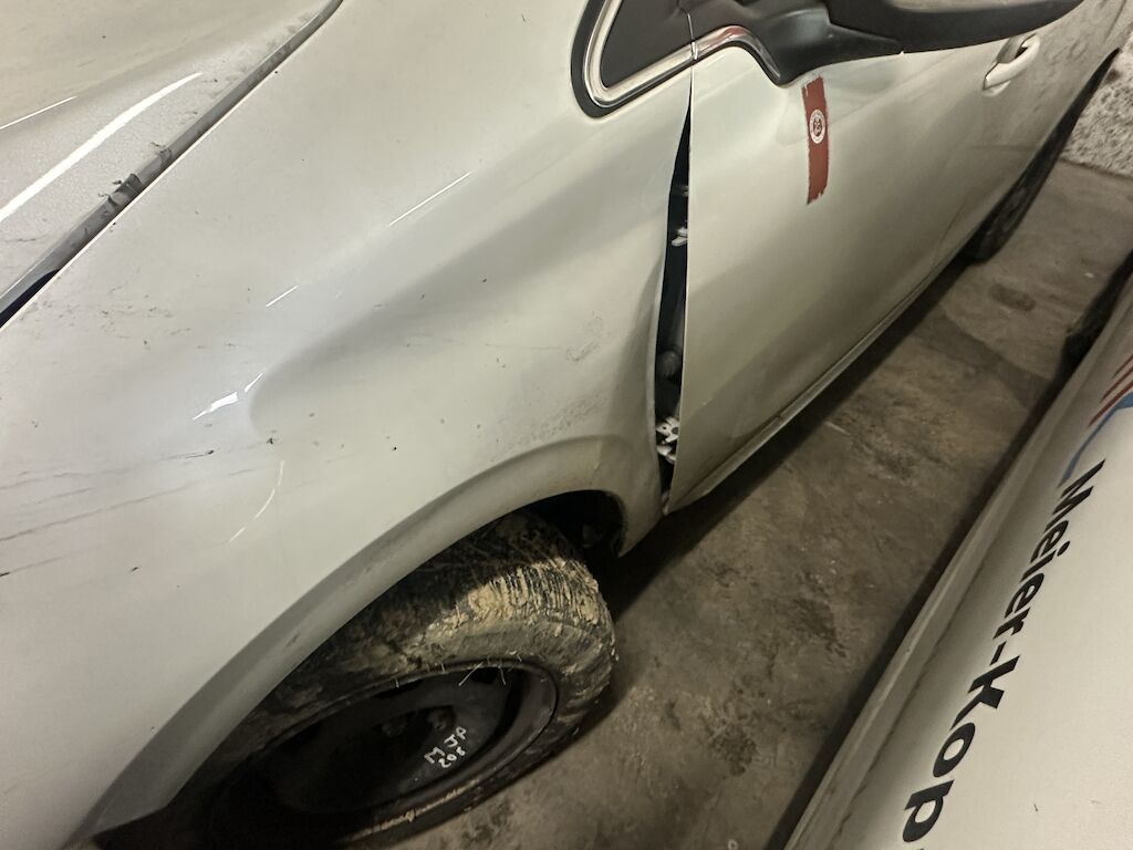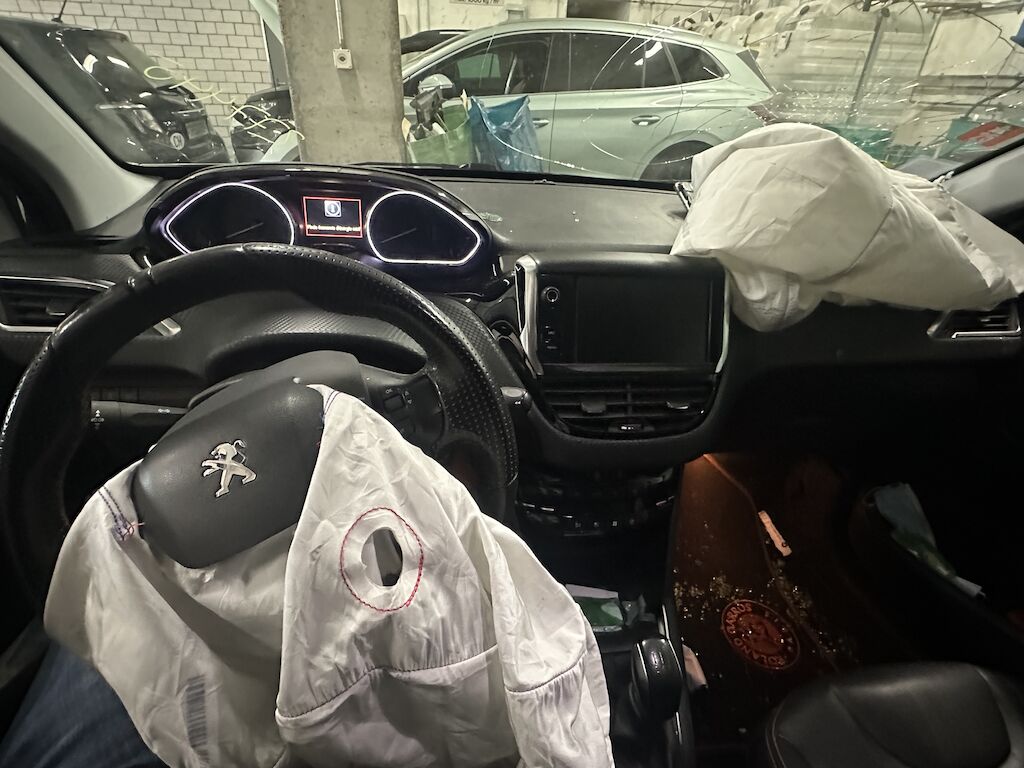 Anprall vorne, rechts, unten. Dabei wurden die Stossstange, die Haube, beide Scheinwerfer, alle Kühler, der Kotflügel rechts, die Beifahrertüre, die A-Säule rechts, beide Radaufhängungen inkl. Felge und Reifen rechts und diverse Bauteile in den Anprallbereich e beschädigt. Ausgelöst wurden der Fahrer-, der Beifahrer, der Kopf-Airbag rechts und der rechter Seiten-Airbag mit den dazugehörigen Gurtstraffer. Weitere Schäden am Unterboden möglich. Das Kupplungspedal bleibt unten hängen. Die Fahrzeugfront ist nach links verzogen.