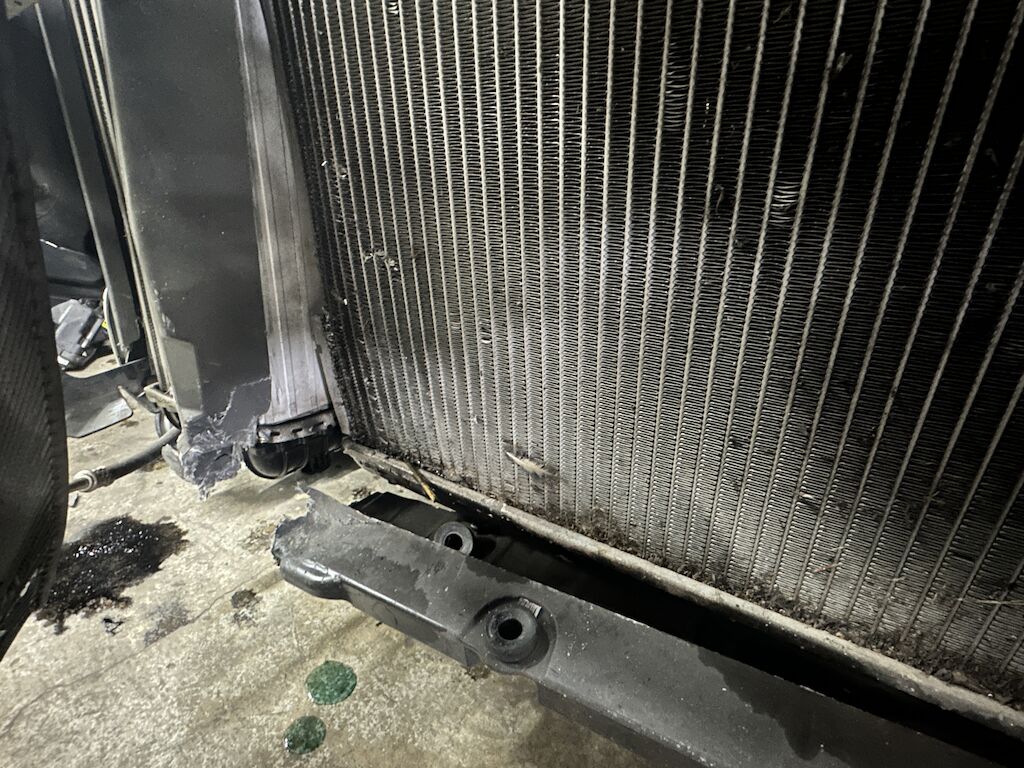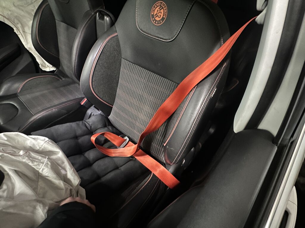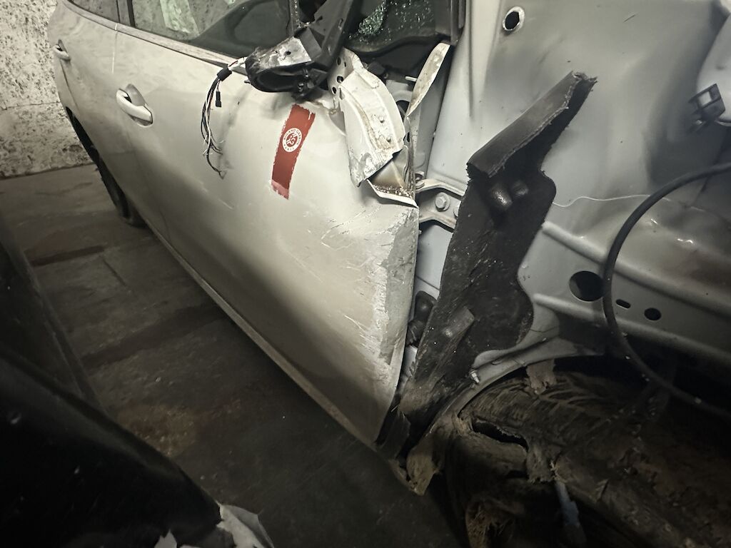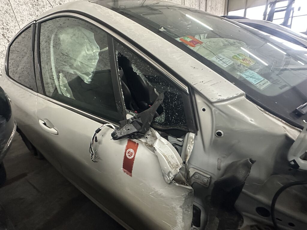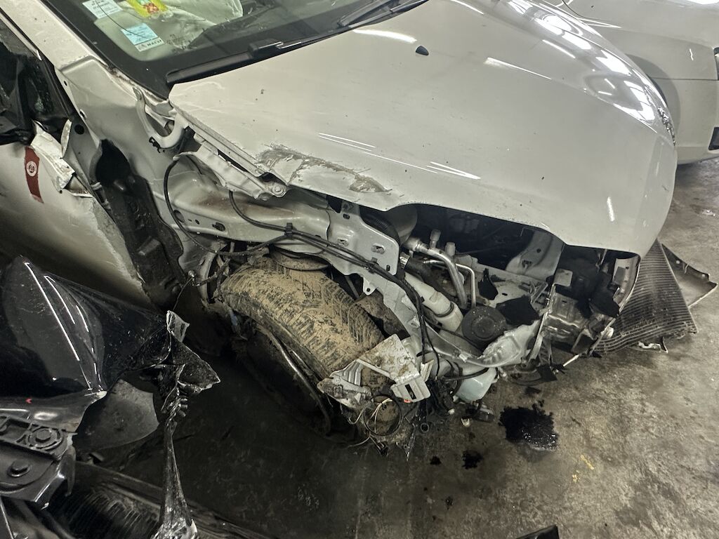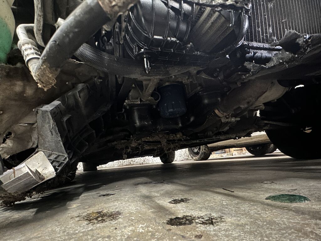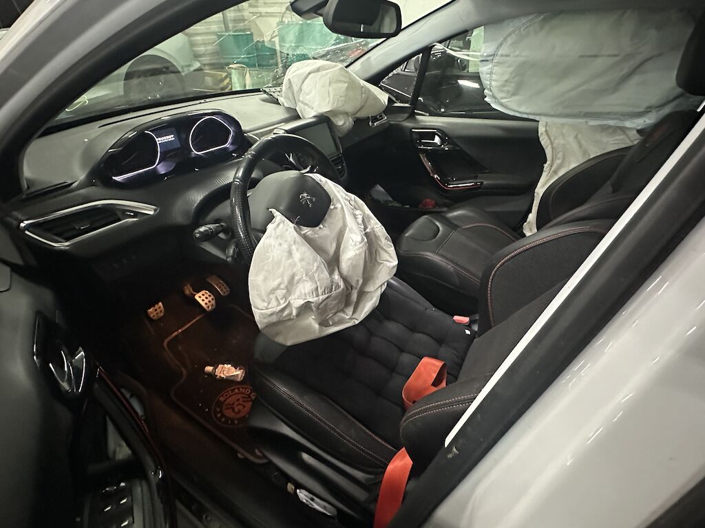 Anprall vorne, rechts, unten. Dabei wurden die Stossstange, die Haube, beide Scheinwerfer, alle Kühler, der Kotflügel rechts, die Beifahrertüre, die A-Säule rechts, beide Radaufhängungen inkl. Felge und Reifen rechts und diverse Bauteile in den Anprallbereich e beschädigt. Ausgelöst wurden der Fahrer-, der Beifahrer, der Kopf-Airbag rechts und der rechter Seiten-Airbag mit den dazugehörigen Gurtstraffer. Weitere Schäden am Unterboden möglich. Das Kupplungspedal bleibt unten hängen. Die Fahrzeugfront ist nach links verzogen.