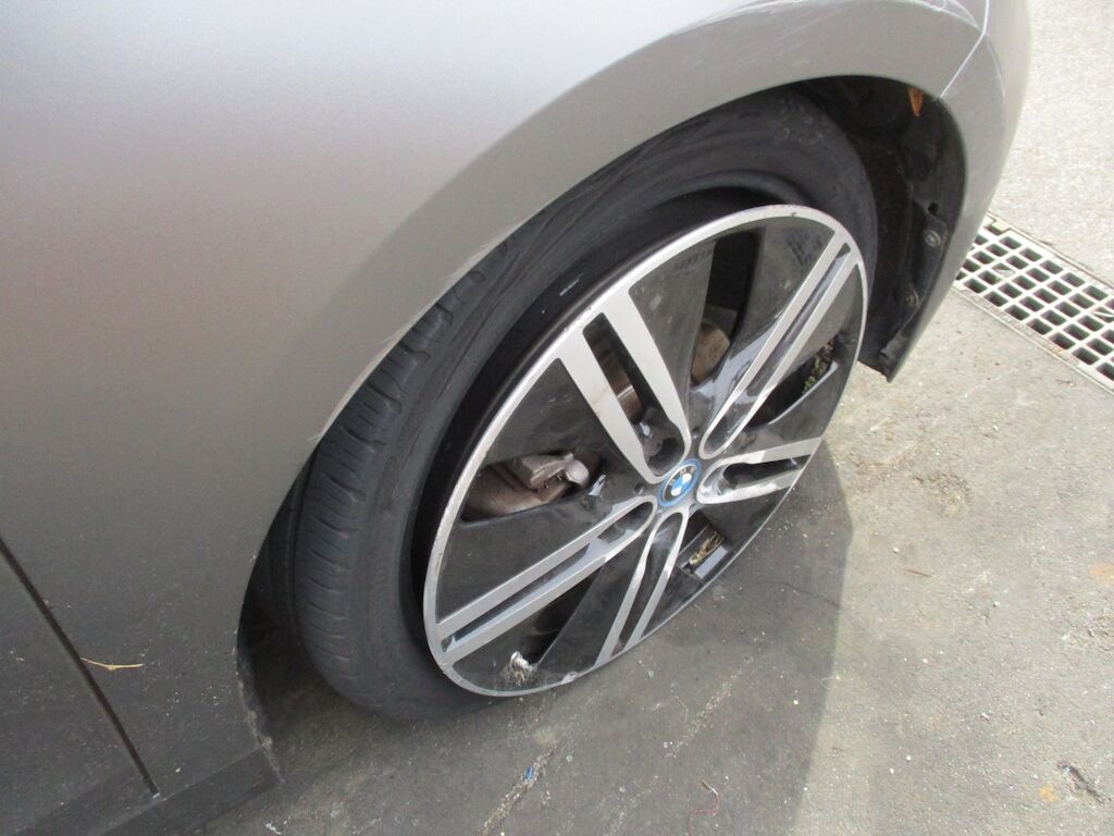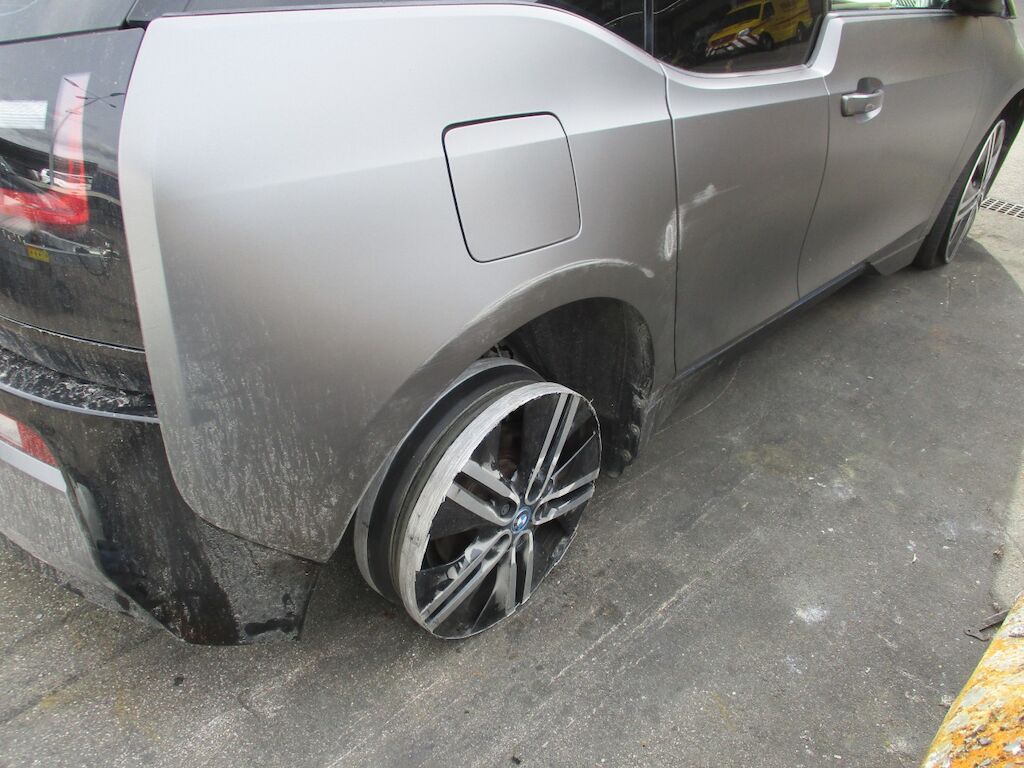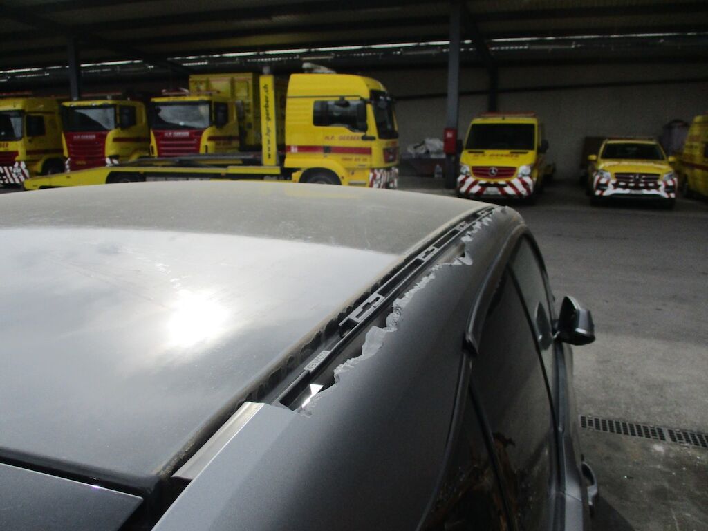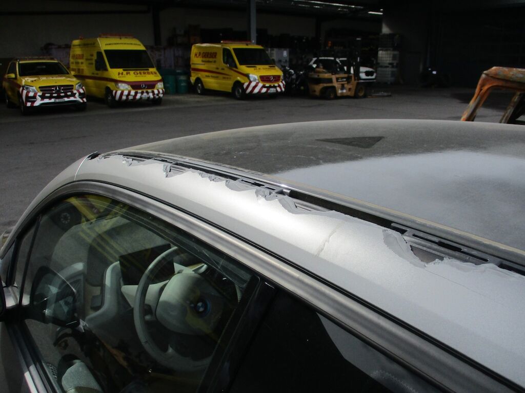 Das Auto weist Schäden an der Front und an den Dachrahmen auf Die Frontscheibe ist zertrümmert Die Stossstange ist eingedrückt. Beide rechten Räder sind zerstört. Die Türe und die Seitenwand HR sind angeschürft.