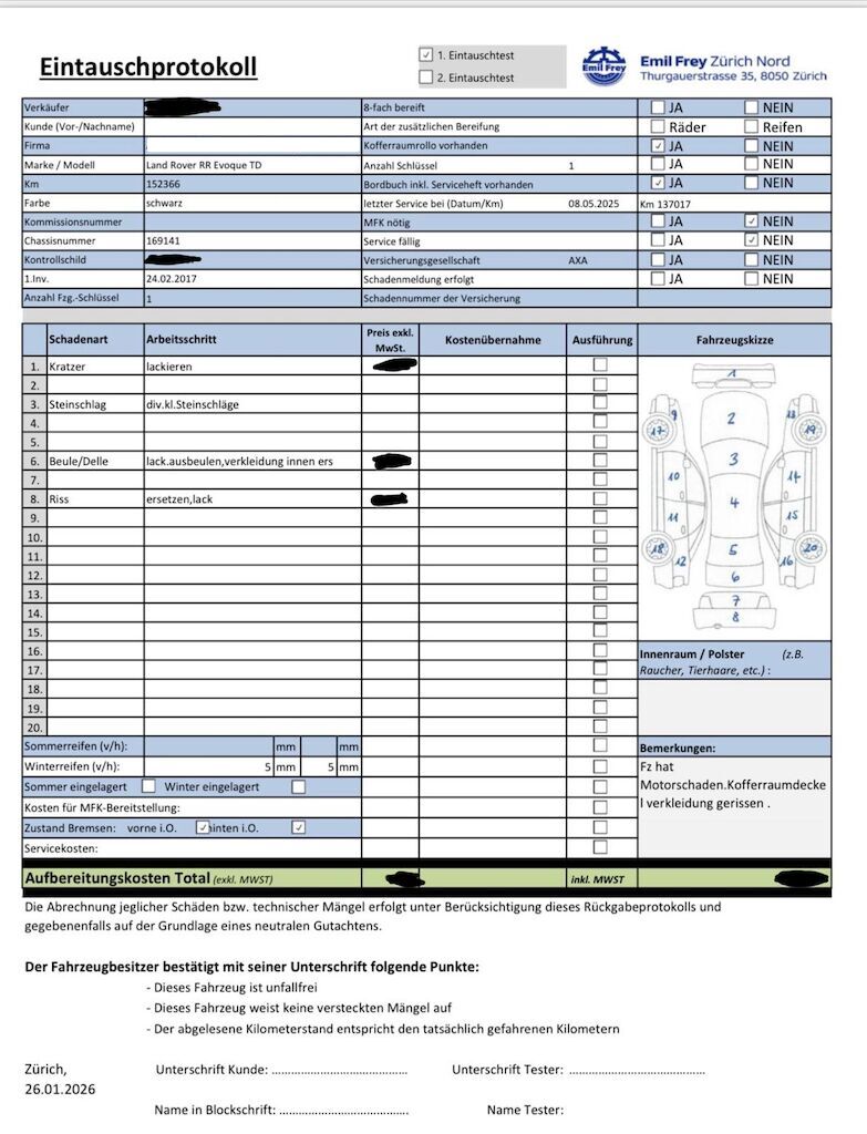 | Keine technische Prüfung (Werkstatttest) vorgenommen Diverse Schäden an Karosserie/Lack. Fahrzeug ab Platz, ohne Garantie und Aufbereitung. Keine Gewähr auf die Angaben der Sonder- und Serienausstattung / keine mechanische Prüfung. Fahrzeug wurde unzerlegt expertisiert / keine Haftung für allfällige, nach Demontage bekanntwerdenden Mängel. Fahrzeugbereifung und Ausstattung gemäss Fotos / Fahrzeugkauf auf eigenes Risiko ab Platz ohne Nachwährschaft. Keine technische Prüfung (Werkstatttest) vorgenommen Diverse Schäden an Karosserie/Lack. Fahrzeug ab Platz, ohne Garantie und Aufbereitung. – Div. Kratzer und Dellen am gesamten Fahrzeug. – Stossstange hinte defekt – Kofferraumabdeckung innen stark gerissen – Motorschade – Diverse kleine Steinschläge – Letzter Service am 08.05.2025 bei 137017 Km. |