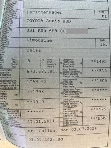 | Ausstattung | Serienaustattung Klimaautomat Airbag Fahrer und Beifahrerseite Elektronische Wegfahrsperre Sitzheizung vorne Elektrische Fensterheber vorne + hinten Tempomat Seitenairbag Fahrer und Beifahrerseite Nebelscheinwerfer Zentralverriegelung mit Fernbedienung Höhenverstellbarer Fahrersitz manuell Lederlenkrad Mittelarmlehne vorne Innenspiegel automatisch abblendbar Lenkrad verstellbar Kopfairbag vorne und hinten Scheibenwischer mit Regensensor Deaktivierung Beifahrerairbag Aussenspiegel elektrisch verstellbar/ heizbar und anklappbar Audiofernbedienung am Lenkrad Stabilitätskontrolle VSC + Traktionskontrolle TRC Leichtmetallräder 17" Servolenkung geschwindigkeitsabhängig Knieairbag Fahrer Isofix-Kindersitzbefestigung hinten Rücksitzlehnen getrennt abklappbar 60:40 Radio/ CD Scheinwerfer mit automatischer Ein- Ausschaltfunktion Smart entry-start/ Schliess- Startsystem Anschluss USB und AUX Reifen-Reparatur Set ABS und EBD Elektr. Bremskraftverteilung inkl. BA Bluetooth Freisprecheinrichtung Innenspiegel mit integriertem Rückfahrmonitor Keine Gewähr auf die Angaben der Serienausstattungen Sonderausstattung Ausstattung |